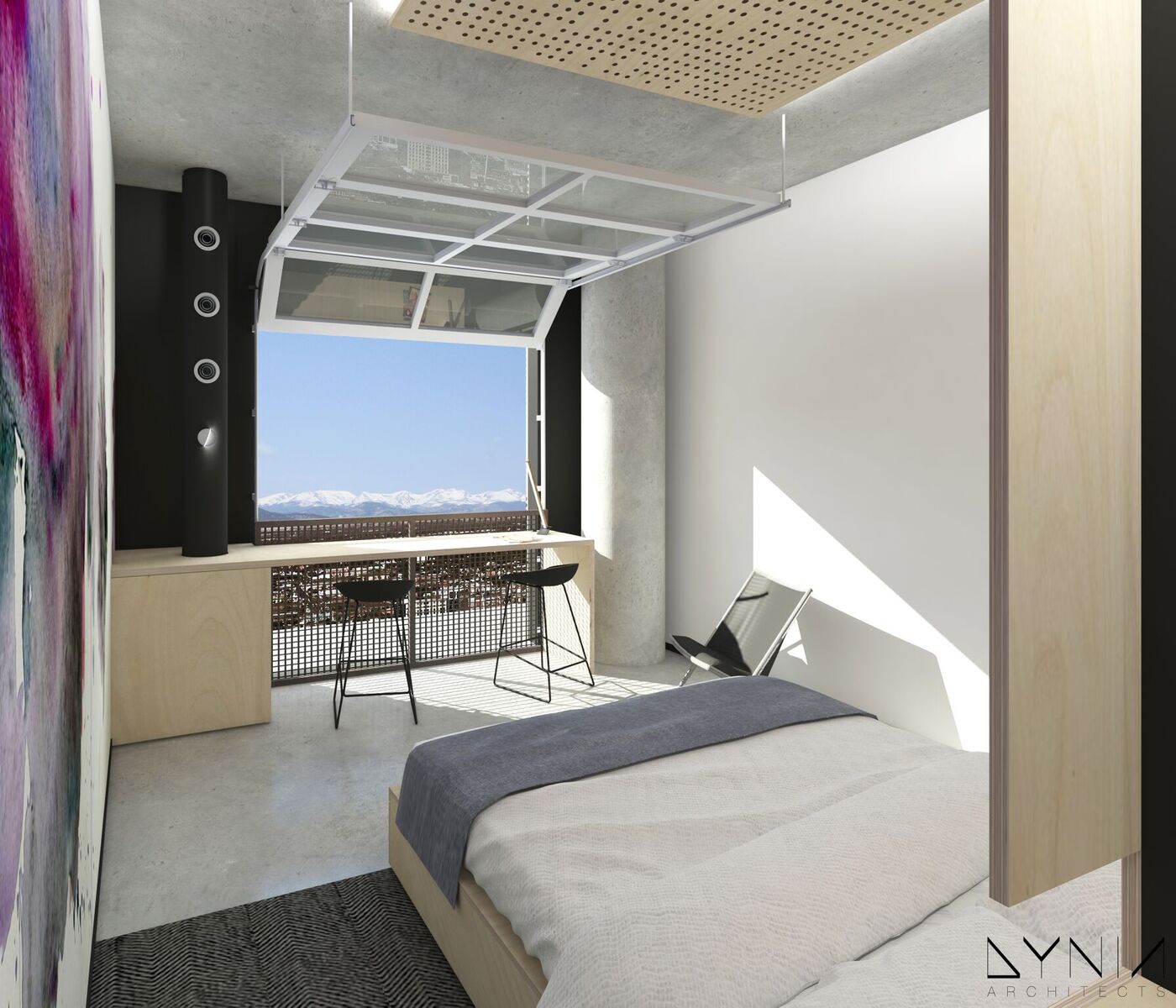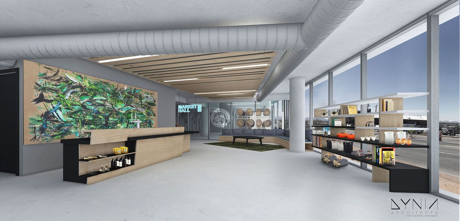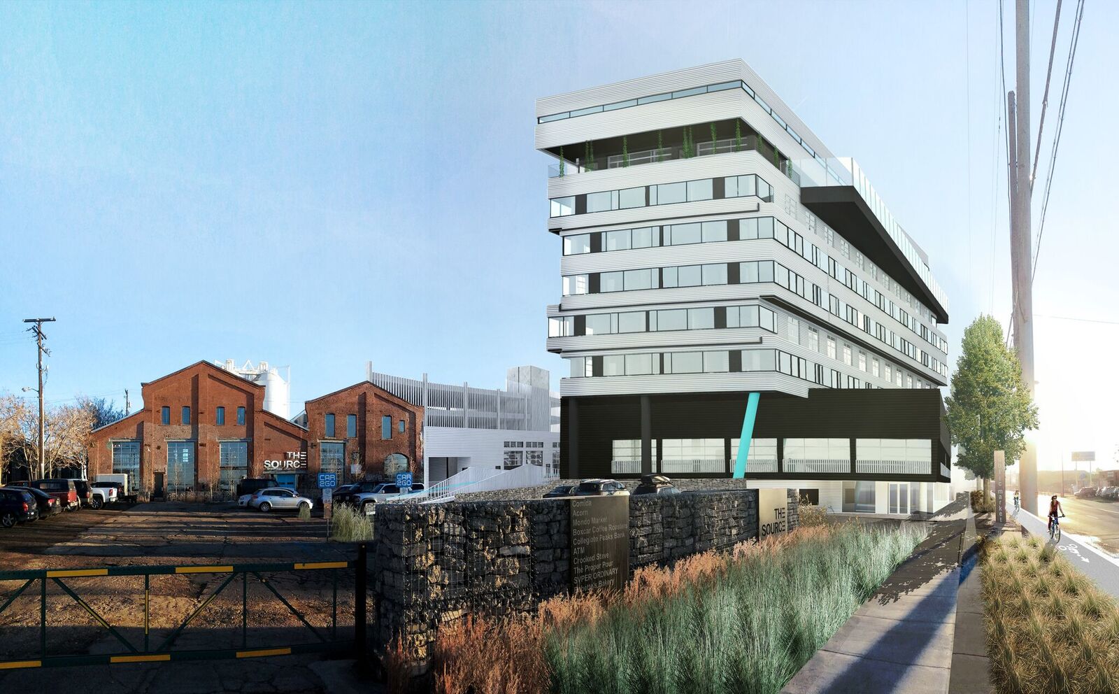 Interior plans were drawn to match the metal and brick notes of The Source while also adding modern touches of concrete and lots of natural light. Most of the 100 hotel rooms will feature floor-to-ceiling windows, but — most notably — about 20 rooms will have raiseable garage doors on the far wall to open the space up completely.