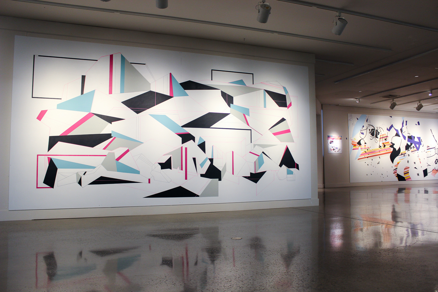 Don’t leave after seeing the Main Gallery or else you’ll miss out on more than half of the show. The Upstairs Gallery shows the murals in a different light — brighter, cooler in tone — but the beautiful mirror effect from the polished concrete floors is the same. First up is Sandra Fettingis — local street art sweetheart that has accessorized buildings like Denver Central Market in RiNo and Center for Visual Art in the Art District on Santa Fe with her geometric paintings. Behind her piece is one by Ramón Bonilla, and though Bonilla doesn’t have the same experience Fettingis does when it comes to large-scale murals, their styles pair quite nicely. Both use limited color palettes, sparse geometry and accentuate negative space.