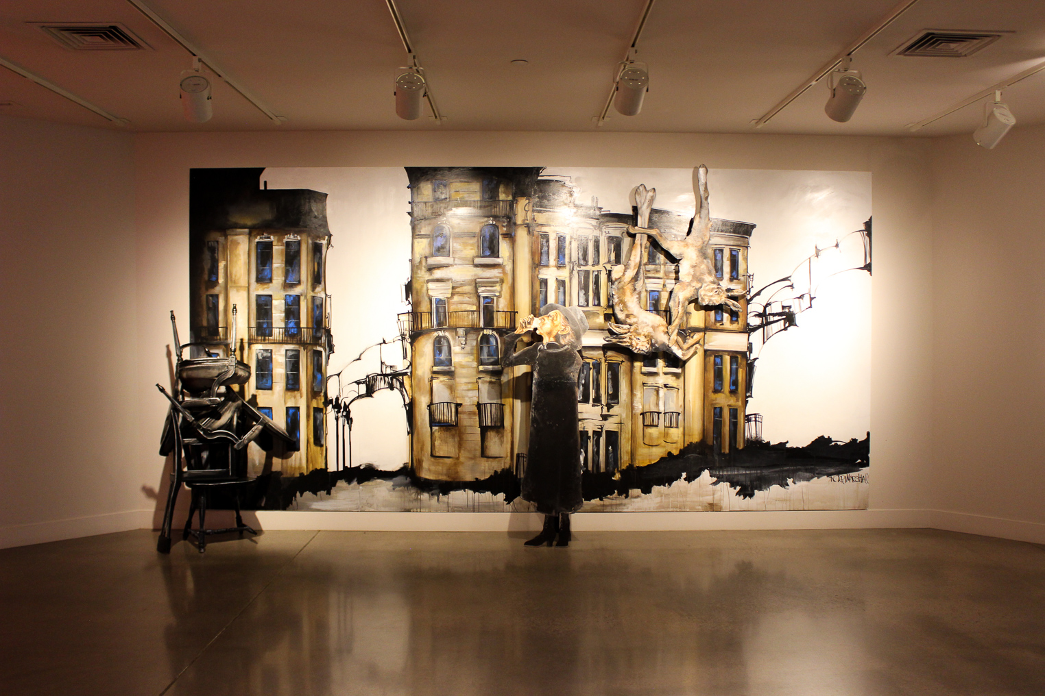 Forrestal’s piece, opposite of Charles’, dominates the room and the gallery as a whole. Instead of one panel in height, she’s used two and the scene she’s painted is a humorous and perhaps biting fusion of a Rube Goldberg machine and IKEA furniture directions.
