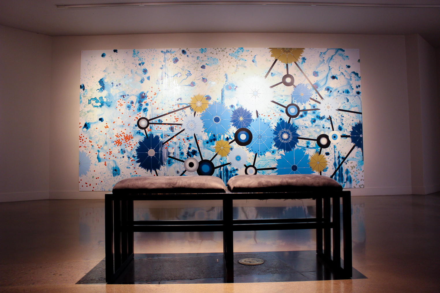 Sandi Calistro painted a mural inspired by her wonder of nature, showing a fairy-like creature with breathtaking eyes. Calistro hones her artistry regularly by tattooing and painting, with several murals spread across Denver that she’s completed since she moved here from New England. Finally, Fort Collins painter Amelia Caruso composed two panels that are horizontal and separated by a door, presenting an aerial (and abstract) view of the Poudre River. Her use of individual circles of similar colors gives the impression of looking at a specimen under a microscope, but realizing it’s representing something grand — like miles of a river — gives the viewer an ‘aha’ moment. With only a handful of colors and even less shapes, Caruso expresses an idea that people spend pages trying to explain in words — that everything is connected and the difference between the smallest molecules and the planet’s ecosystems are not as big as we think.