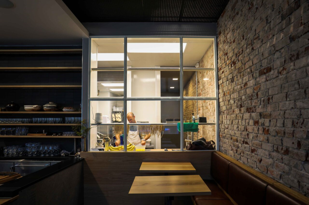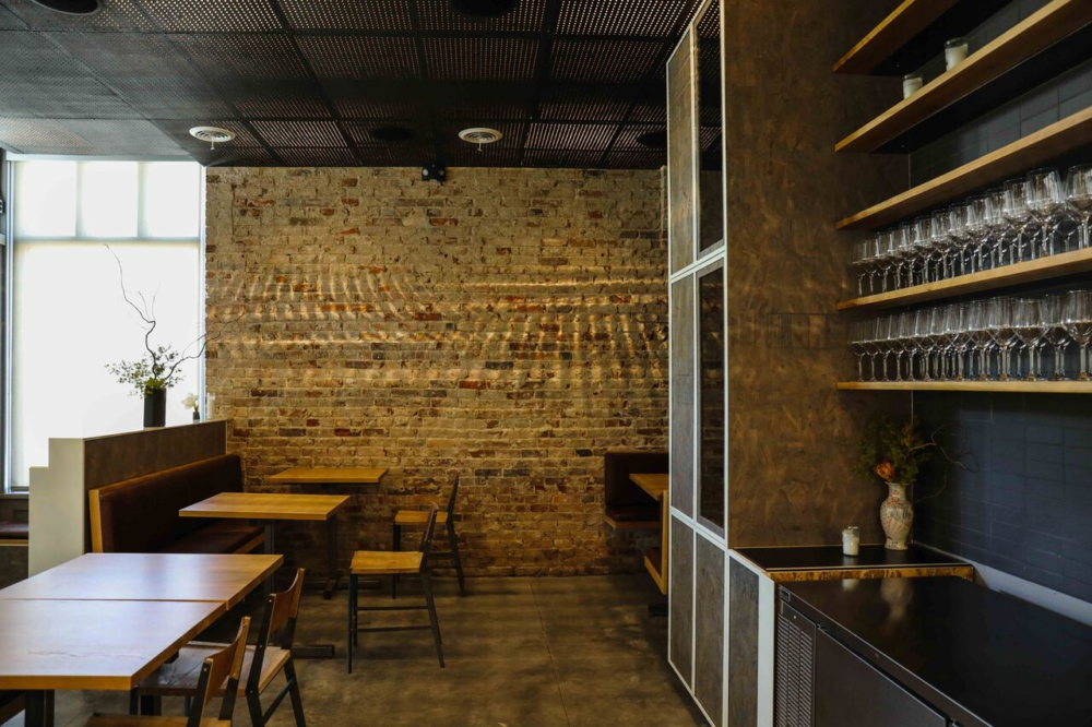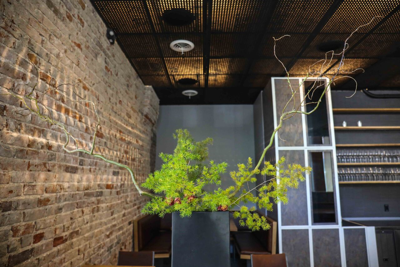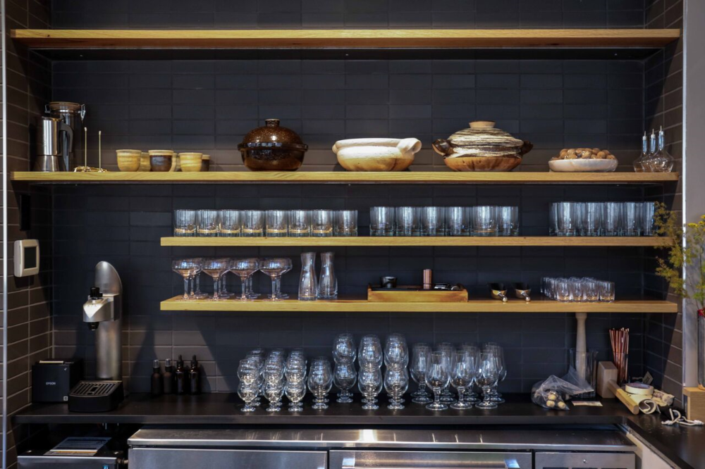 Raw materials like regular plywood and pipe board, ceramic from Heath Ceramics in San Francisco and the brick wall from the previous structure left exposed, makes for a wabi-sabi element — a Japanese term meaning beauty in imperfection. A few small plants give a small bit of color against the brick. The gold lettering on the front door hints that you’re walking into something special.