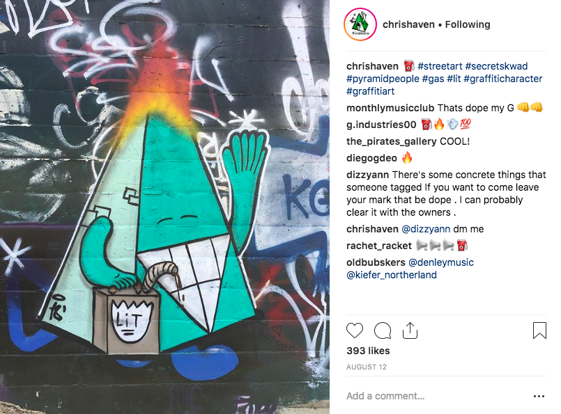 The Lowdown: Denver native Chris Haven’s work can be seen all over Denver, and usually, it’s in the places you might least expect it. His claim to fame in the graffiti scene is his pyramid characters, who he cleverly outfits in different wardrobes and poses — like one lying down, or in a Broncos helmet, or holding a bag of psychedelic mushrooms. But Haven’s style isn’t monosyllabic, his birds-eye view of the city is another popular design and can be seen on the exterior of Joe’s Liquor in RiNo, among other local spots. Using his innate knowledge of the city, Haven includes such iconic landmarks as the cash register building and the sculpture park. Though we don’t know which design he’ll use for the upcoming mural for CRUSH, we’re sure it will embody the purely Colorado spirit he so easily exudes.