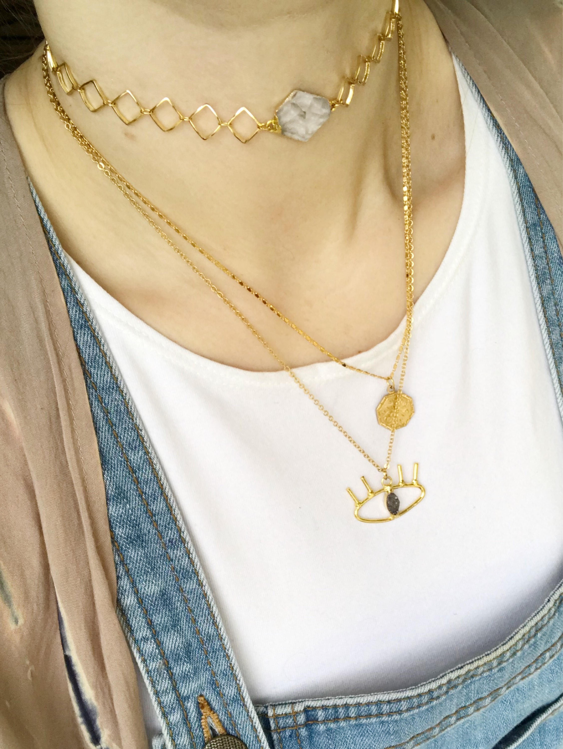 AH: Colorado does have some gemstones but not all the ones that I like to use. The stones are sourced directly from mining towns in South America and they cut them all into custom shapes that I want. I design everything, source the stones, get them custom cut and then I assemble everything here [in Denver]. I use gold and silver chains and findings and some brass too while incorporating the gemstones throughout the line.