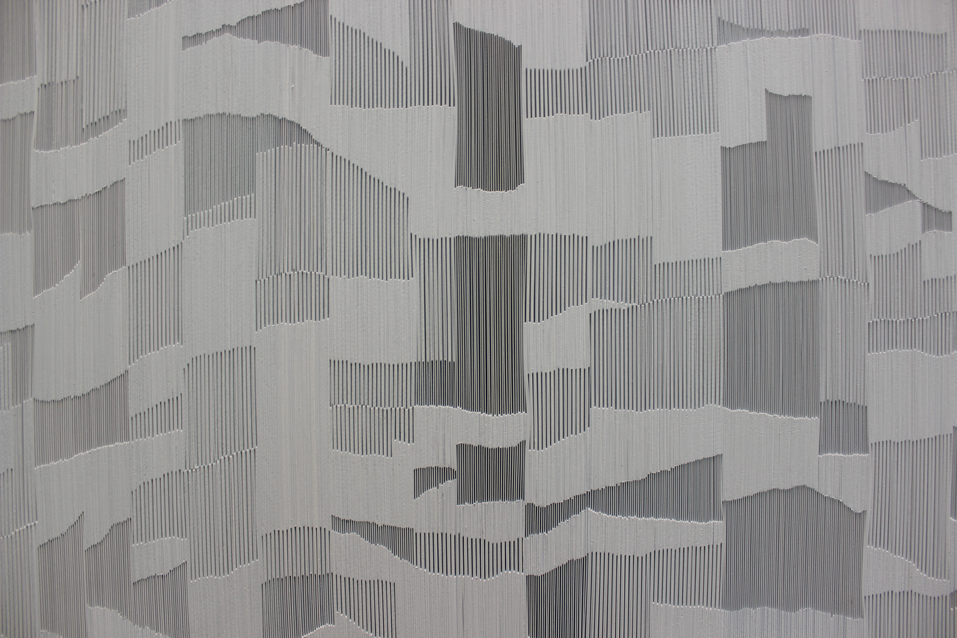 Move to the upper level after experiencing the cavern in order to see another approach, by Donovan, at changing the use and appearance of index cards. Fourteen separate pieces await, framed and hanging on the walls, showing various patterns. The patterns bring to mind a host of organic things like waves, crowds of people, tree bark, sound waves and heartbeats but are created entirely out of vertically stacked cards. One of the pieces — in the hallway — was created this year and the MCA show is its debut appearance.