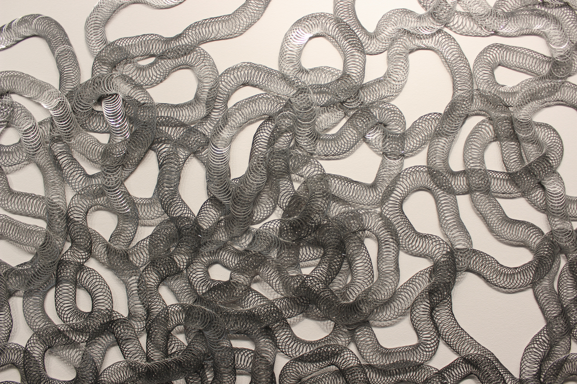 Though the rest of the upper floor perfectly suits the themes of the exhibition, it is the lowest level that knocks it home for viewers. The best way to experience the splendor is by taking the elevator — so that when the doors open you can see both the sculpture and the flattened approach on the wall in the back at the same time. This view — and the fact that both are made entirely of Slinkies — helps to remind the viewer that Donovan is fearless in her approach to materials. She is able to understand a material as something of form rather than utility, aesthetics rather than functionality. And when she experiments, the results can be unexpected and unexpectedly natural despite the completely unnatural (and pretty unsustainable, to be honest) source of the materials.