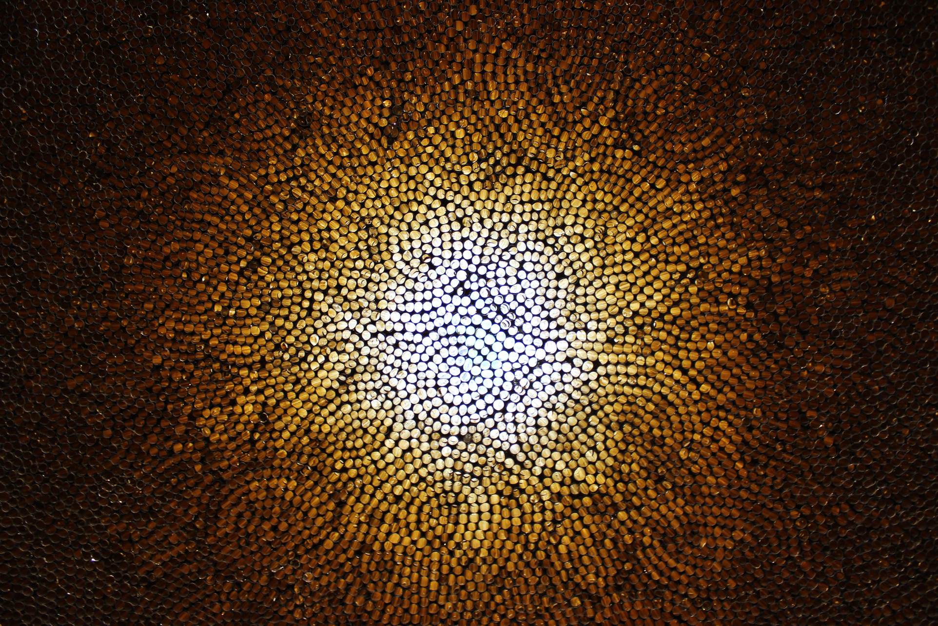 Two ballpoint drawings in the following room are paired with the most Instagrammable piece in the show, Untitled to demonstrate Donovan’s uncanny ability to harness natural movement into relatable patterns. The drawings were created in 2002 and followed a freehanded approach by Donovan. Another piece of hers, the golden window of cylinders (which you see when you first walk in) was created just this year — and yet, despite the difference in materials, process and time, the general shape and design are shared.