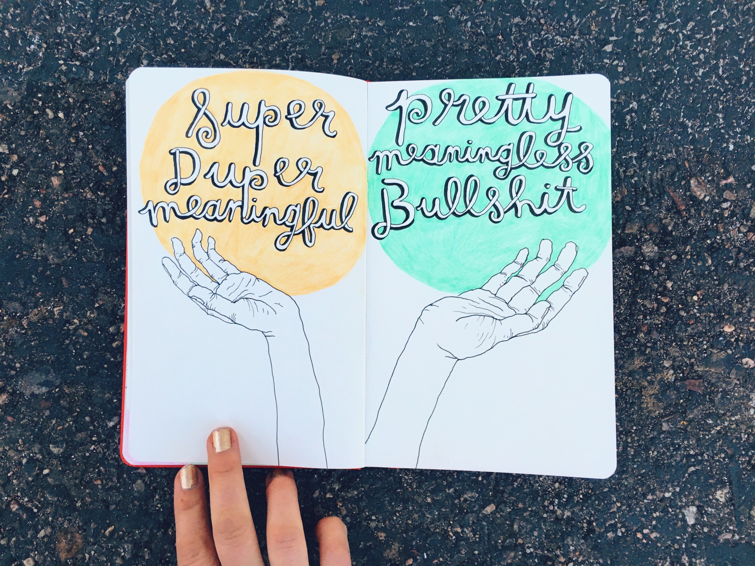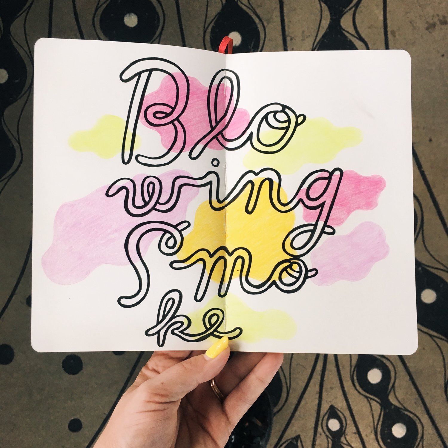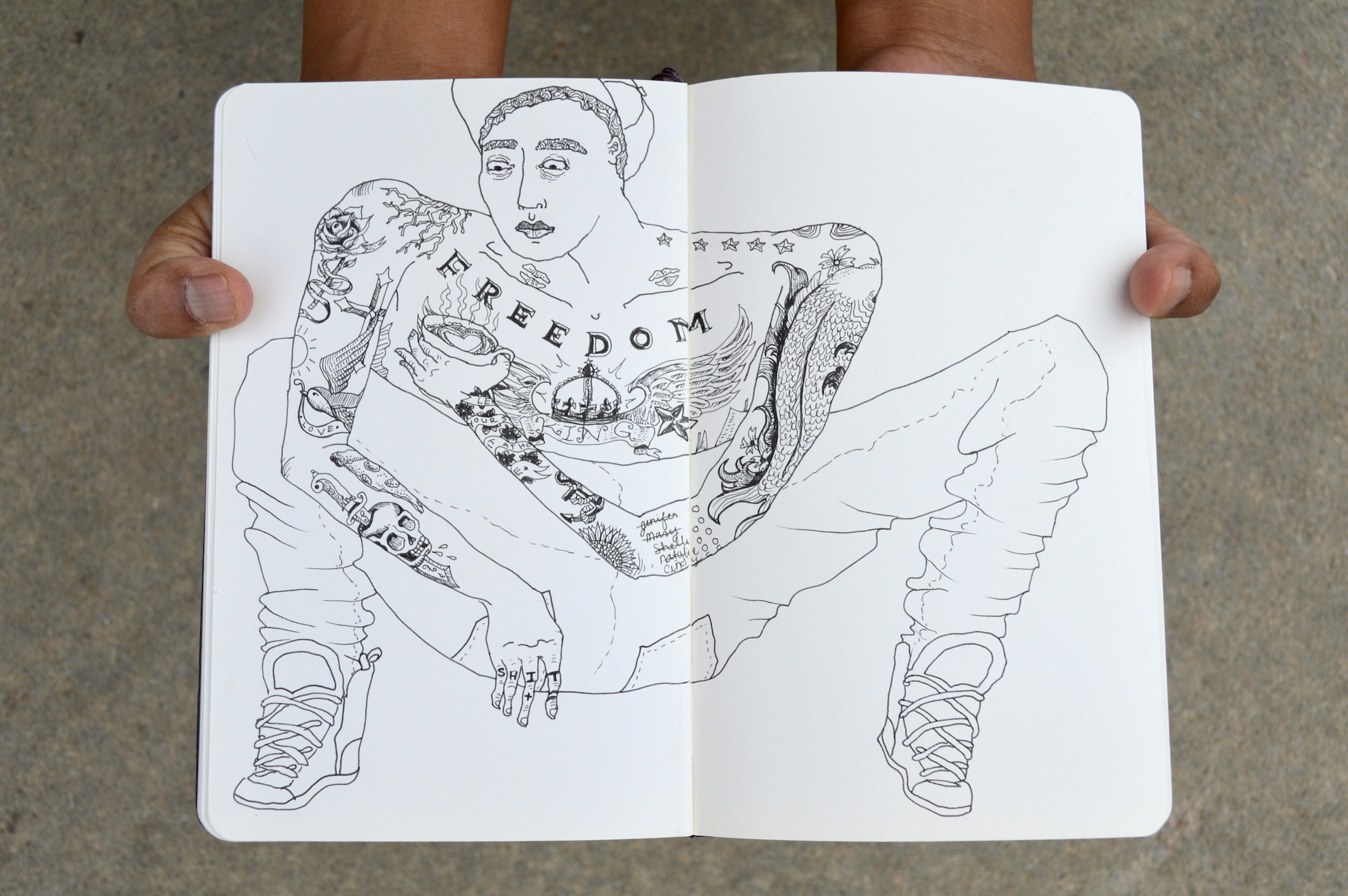 OM: Loose-leaf paper drives me nuts. I think there’s something about the importance of it being bound inside a book that makes me work differently. On paper, I have a really hard time making it look the way I want. I just look at it and think, it’s not important. When I used to make silkscreen designs for shirts and bags, I did it on a loose-leaf paper because it was easily scanned. But I don’t like working on it. With sketchbooks, I almost never do just one side. I have a hard time framing it in my mind [without the book], in the book it feels intentional.