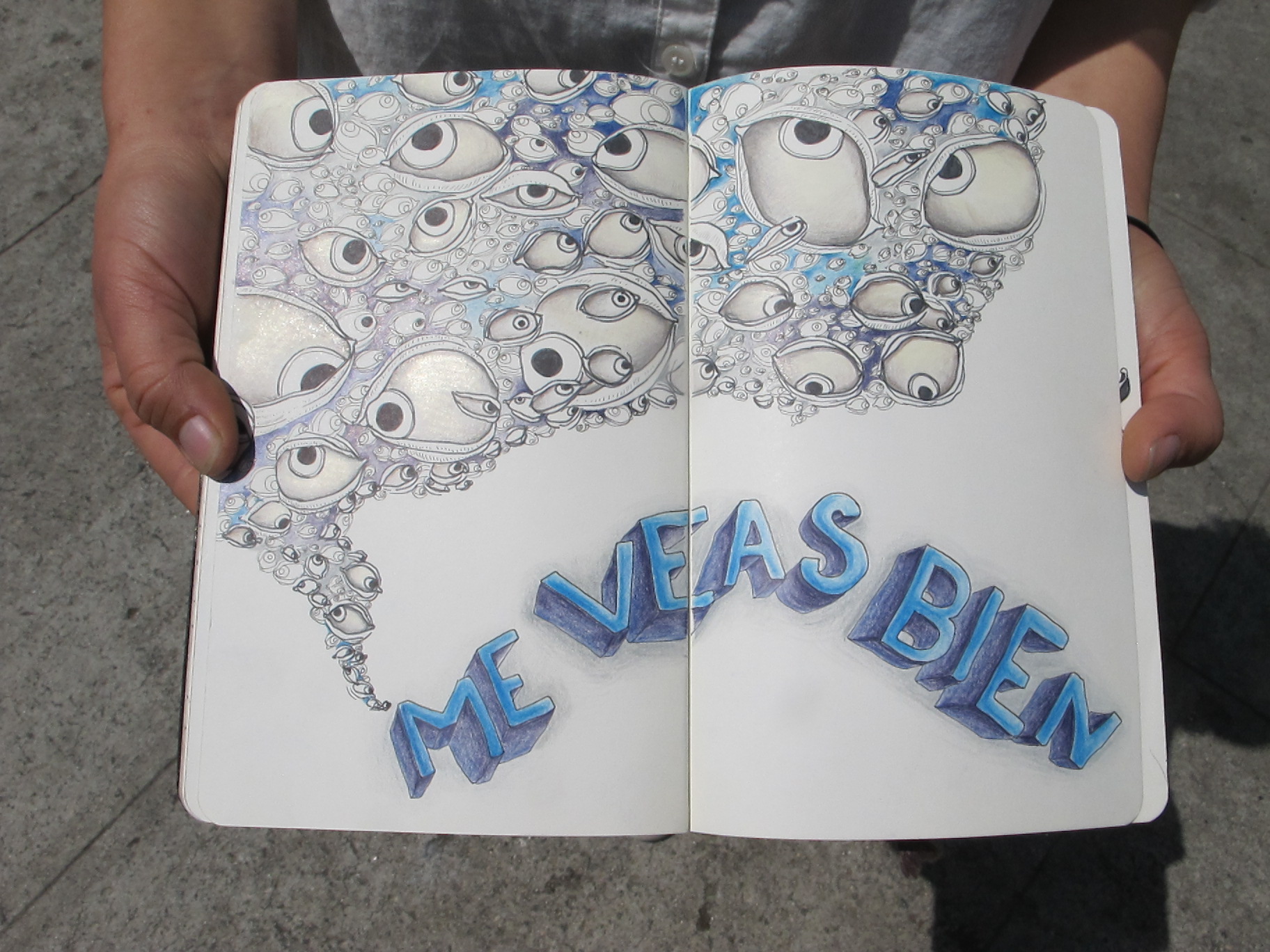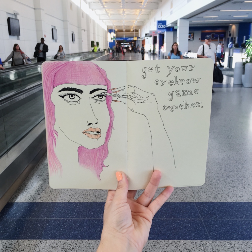 OM: They feel really similar to me because a sketchbook is a final piece. I was influenced a lot in school by artists who used sketchbooks as final pieces or displayed the entire book in a gallery. So my sketchbooks, each page is special and I don’t want to mess it up. I hate when I mess up a few in a row because I’ll want to throw the whole book out or paint over the whole spread. Murals are just more fun because I like working really big. I have a heavy hand… so what I like about painting murals is that I can make big movements and marks. A sketchbook feels more intimate. Both have a ‘showing off’ aspect or a performance part. I don’t draw in my sketchbook at home, I come to a coffee shop to draw. It’s not that I want people to look at me drawing, it’s that I want to see how they experience it. Murals feel the same I guess. I love painting and having people interact with me while I do it.