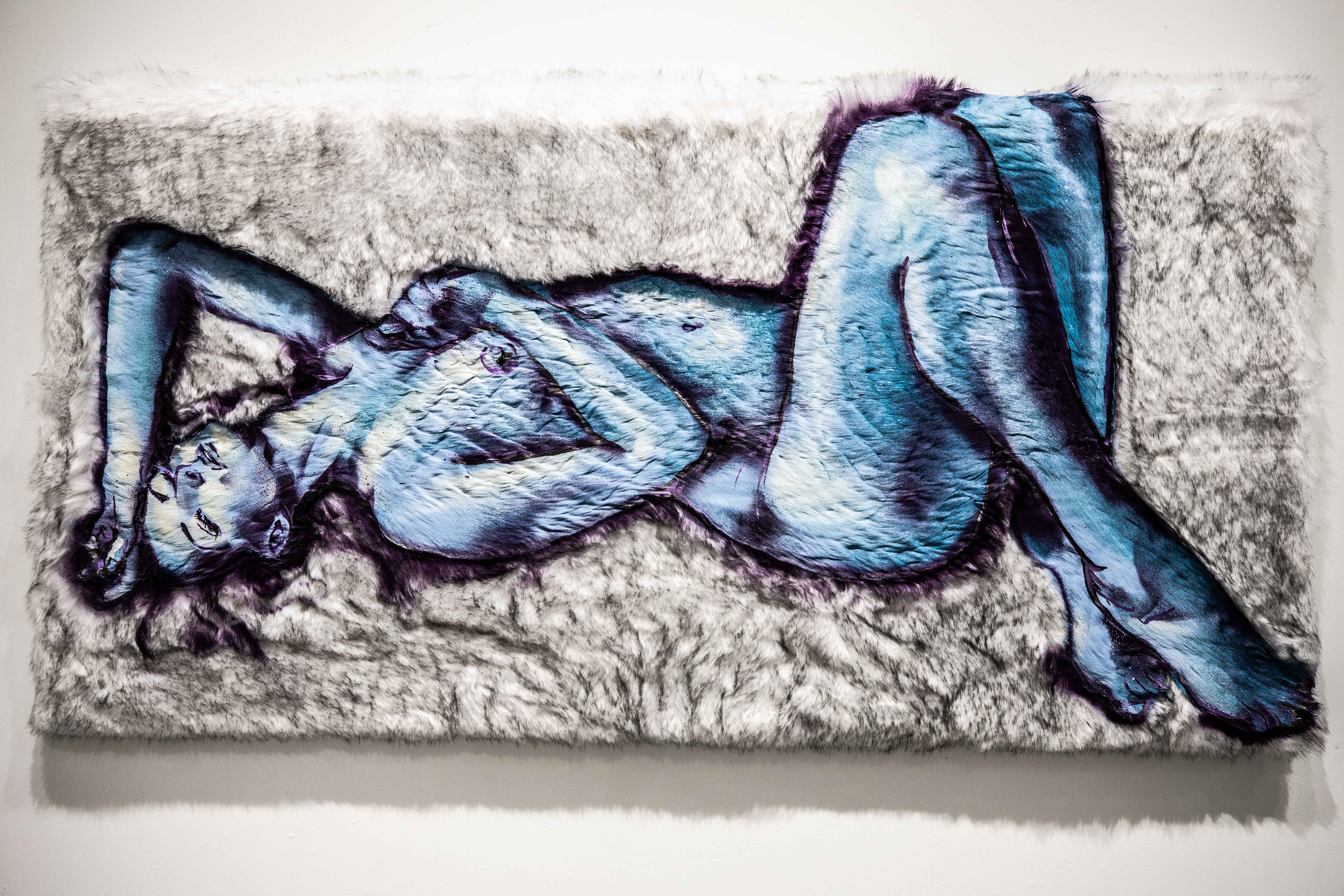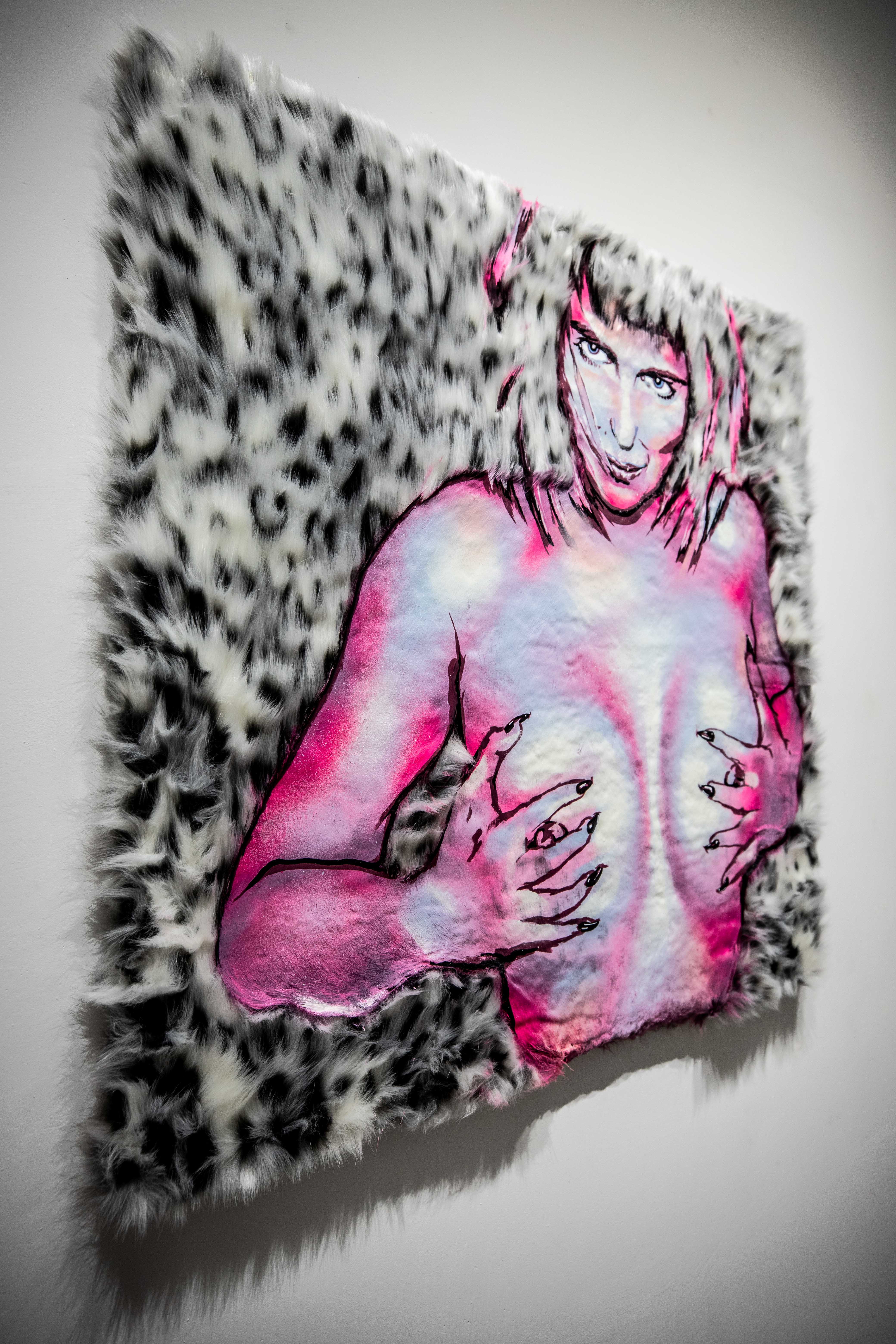 As much as art history relies heavily on the female body, the history of humanity relies on our relationship to animals and more particularly, their fur. The ancient narratives associated with fur and the unexplainable emotional attachments and memories that it rouses in us was another component to Frances’ decision to use those materials. It is as if, by using the fur and the image of females and children she celebrates our desires to hold and be surrounded by softness. But by using slightly neon colors and aerosol paint, she keeps the pieces from becoming too calming, too motherly and reminds the viewers that sex and softness are two inevitably tangled strings.