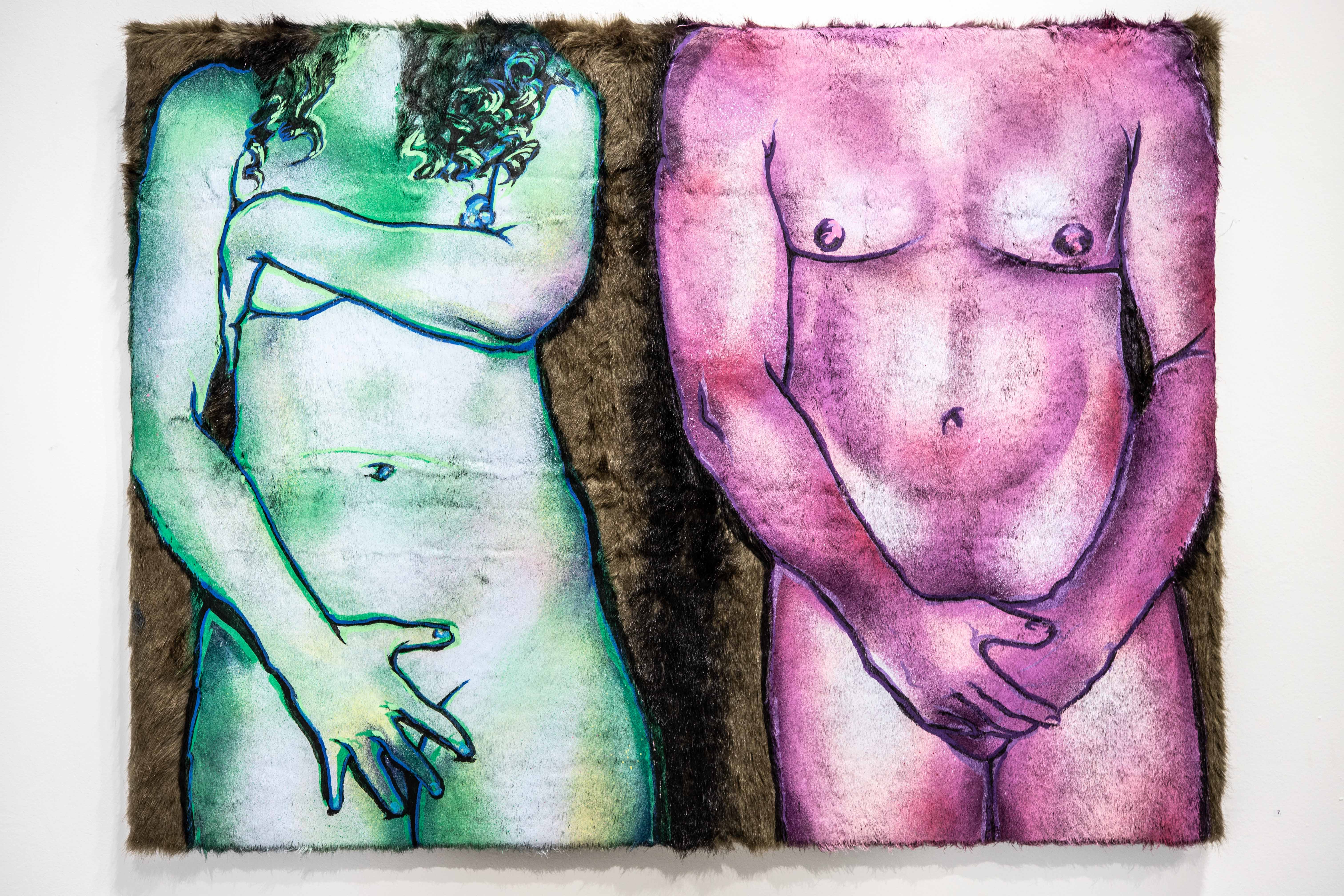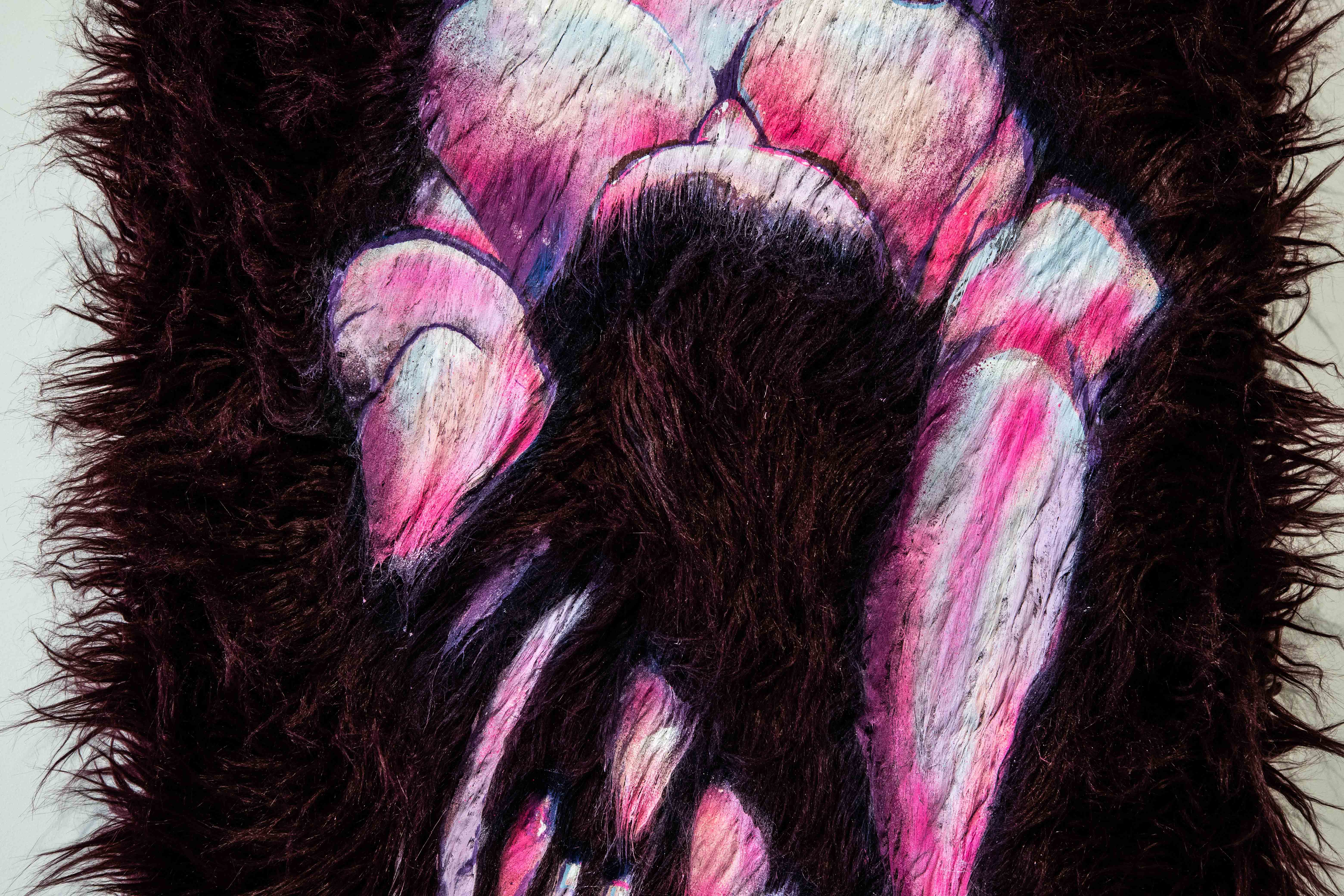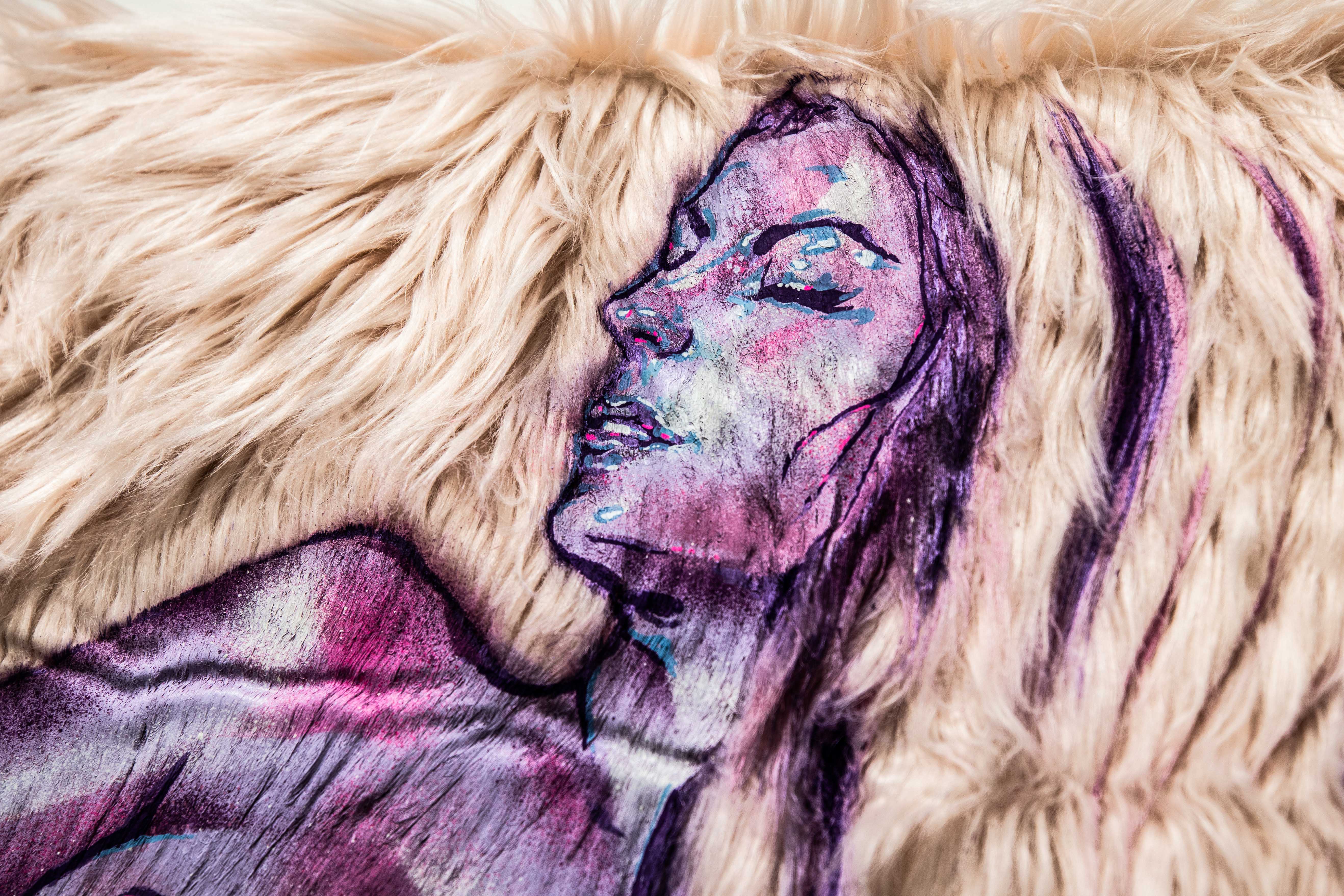 In total, seven individual pieces compose the exhibition. Each one follows the same technique, where Frances used scraps of faux fur as the canvas and painted the subjects directly onto the fur. As most artists do, Frances keeps scrap material from previous projects. In this case, the faux fur came from a performance piece she did a few years ago called The Love Throne where she re-upholstered a chair in the material — and the decision to start painting on the leftovers happened organically. Fast forward to the end of last year and Frances still had scraps of the stuff lying around, waiting for transformation.