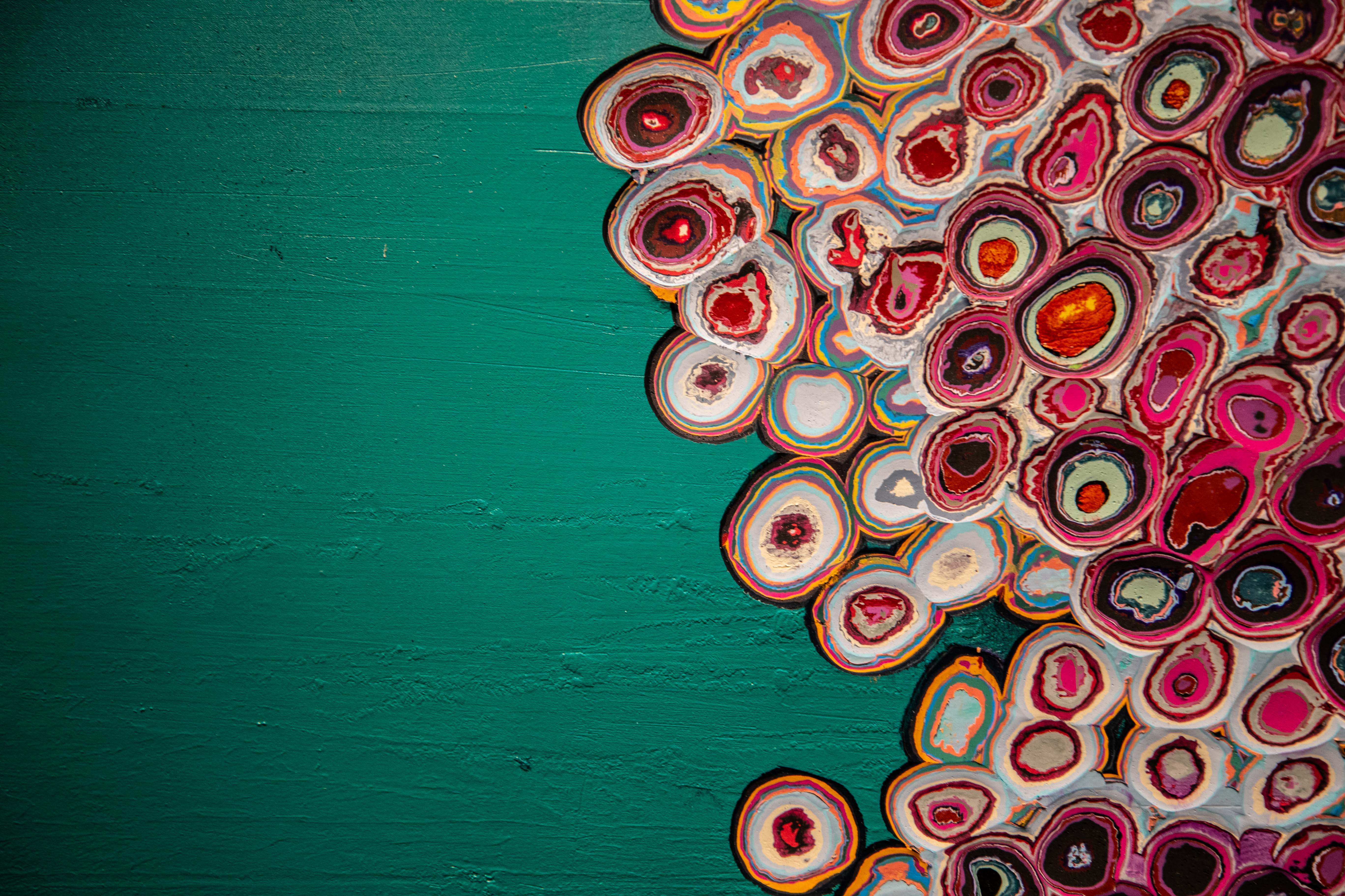 In the lower level gallery, a showcase of an incredible local artist has been curated by Zoe Larkins, titled Flak. It is Jensdotter’s first solo museum show, a milestone since the artist received his MFA from the University of Colorado, Boulder in 2014. His work feels right at home alongside the other innovators showcased in the museum because he continually experiments with his materials. Two paintings highlight a technique he has started to gain some recognition for, a process he calls “carved painting” where he layers hundreds of different colors of house paint and then carves out circular shapes to reveal the striations of color. He decided to include these two because they portray American icons.