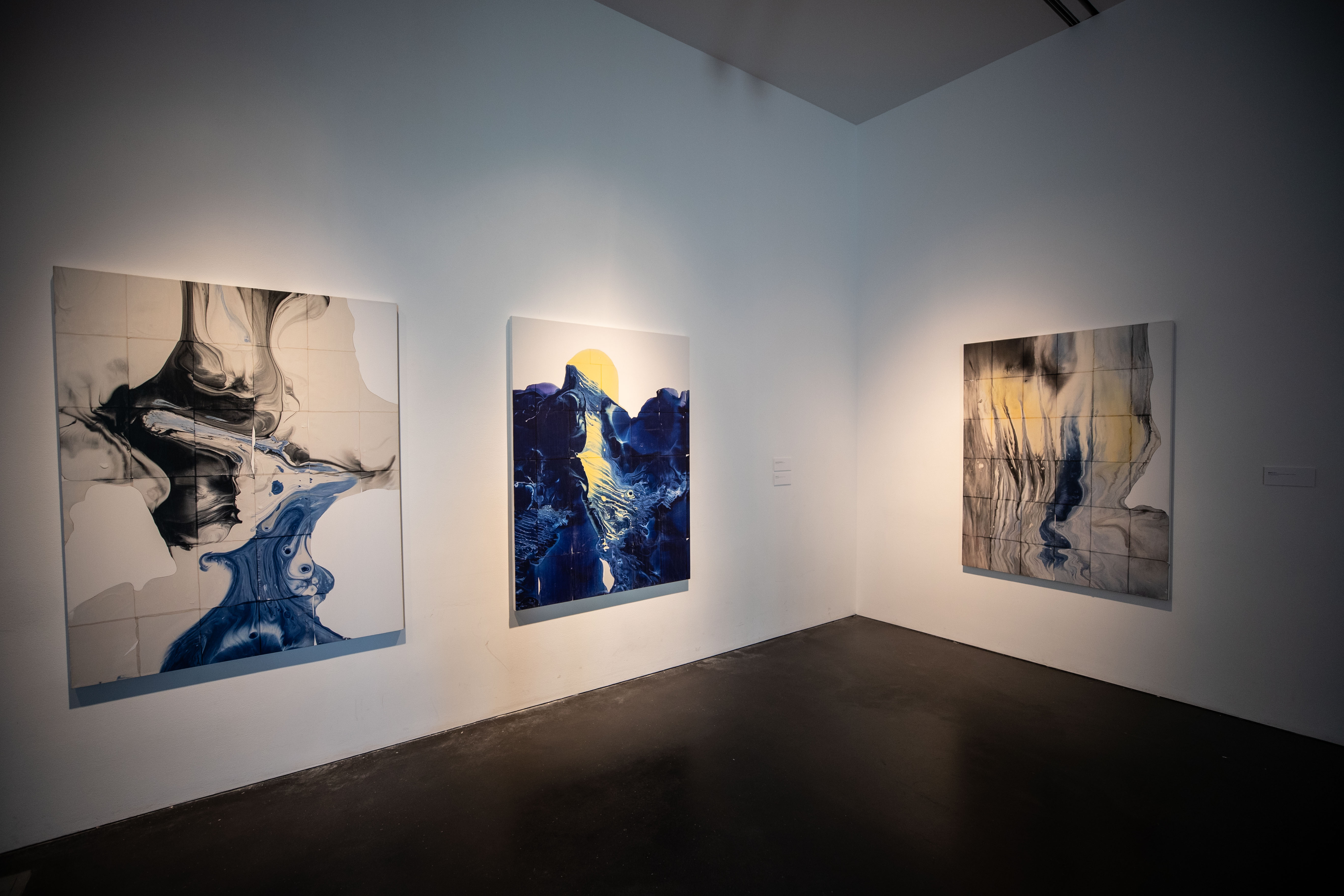The other five pieces in the show, although deviating from the carved painting path, show how Jensdotter’s approach to his materials and process may never be pigeonholed. With the three pictured above, Jensdotter began using spray paint and plastic sheets t0 imprint patterns onto the canvas. First, he spray paints designs onto the plastic sheet, then he carefully places the wet spray painted plastic onto the canvas, where the patterns remain. Jensdotter likens the fragility of working with spray paint in this capacity as working with “butterfly wings” — although that delicacy is hard to notice when you first see the complicated landscapes. Like the carved paintings, he uses many layers in order to infuse complexity, depth and the right amount of shading and highlights.
