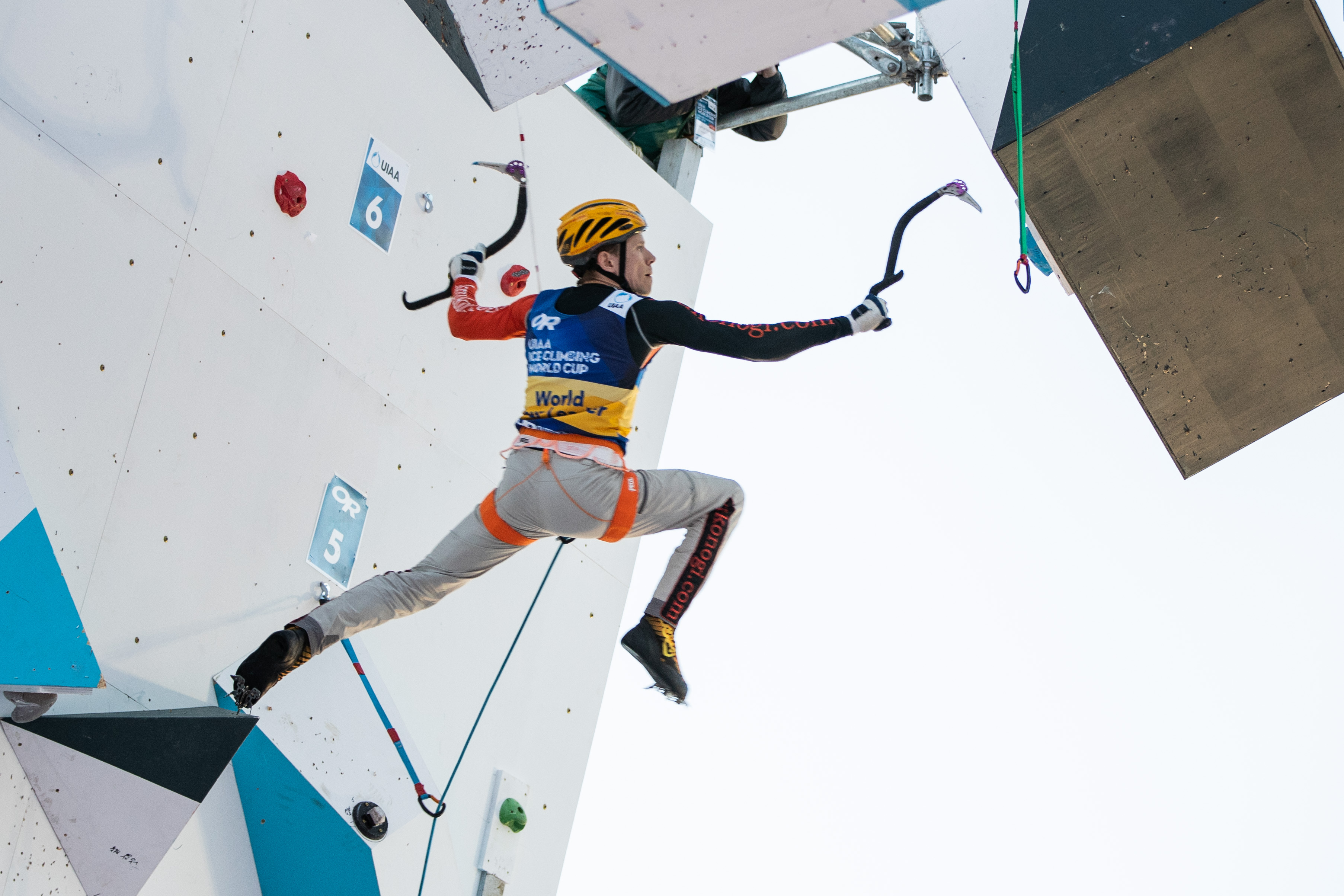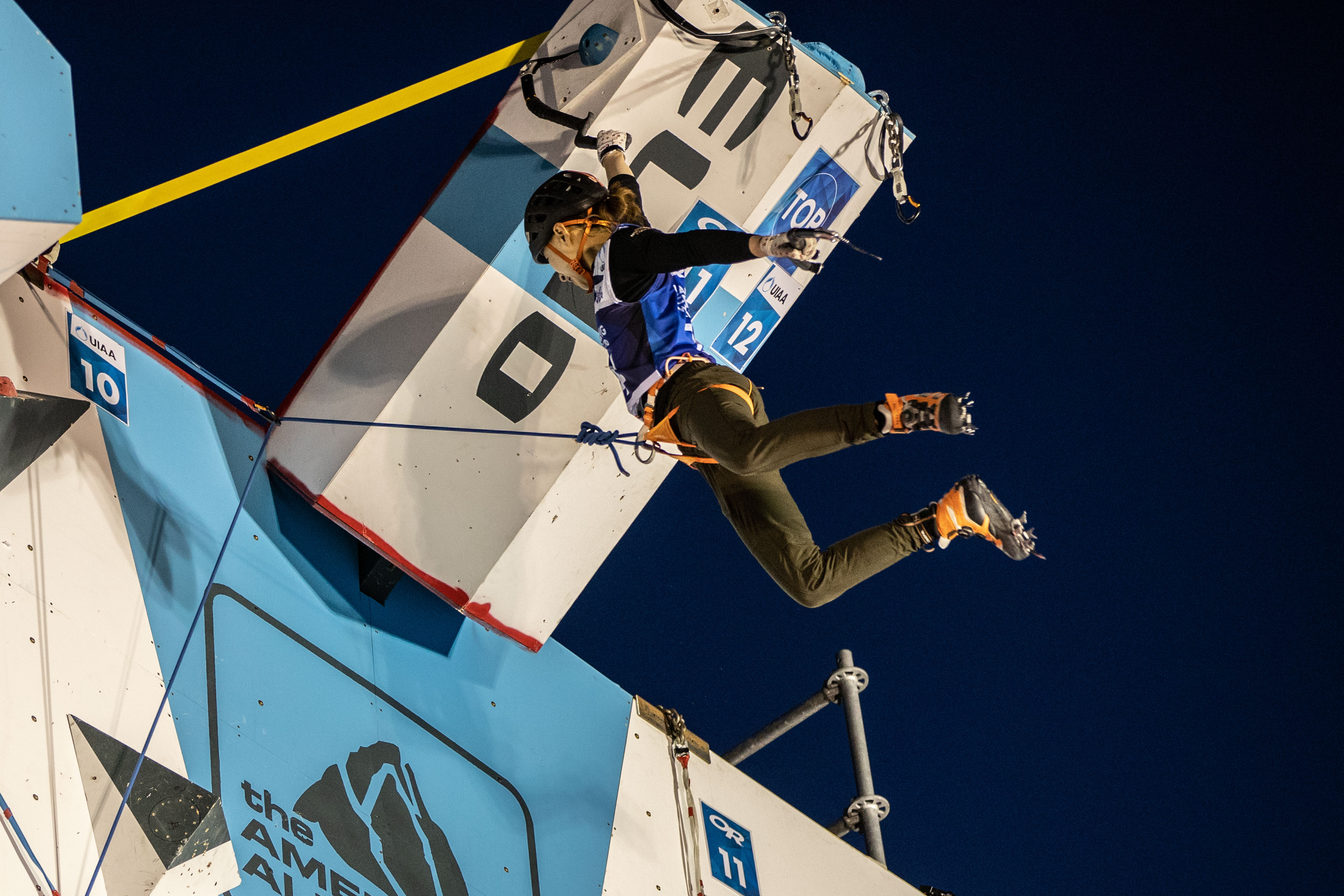 Climbers precariously placed their ice tools on holds, jamming their crampons into the wall and obstacles as they climbed. They wore golf gloves to keep their grip on the ice tools. Once they worked their way up the wall, they jumped into the obstacles. In the men’s case, an actual jump was required to make it to the first feature. From there, climbers tangled their legs over arms to keep close to the features, making quick moves to the next dangling obstacle. Only some were able to make it past the hanging features and onto the solid overhang, and fewer still made it to “the rhino horn” to top out. Climbers were ranked based on points earned from how many holds they touched and amount of places they were able to clip their ropes into, but finishing to the horn and clipping in before time ran out was the goal.