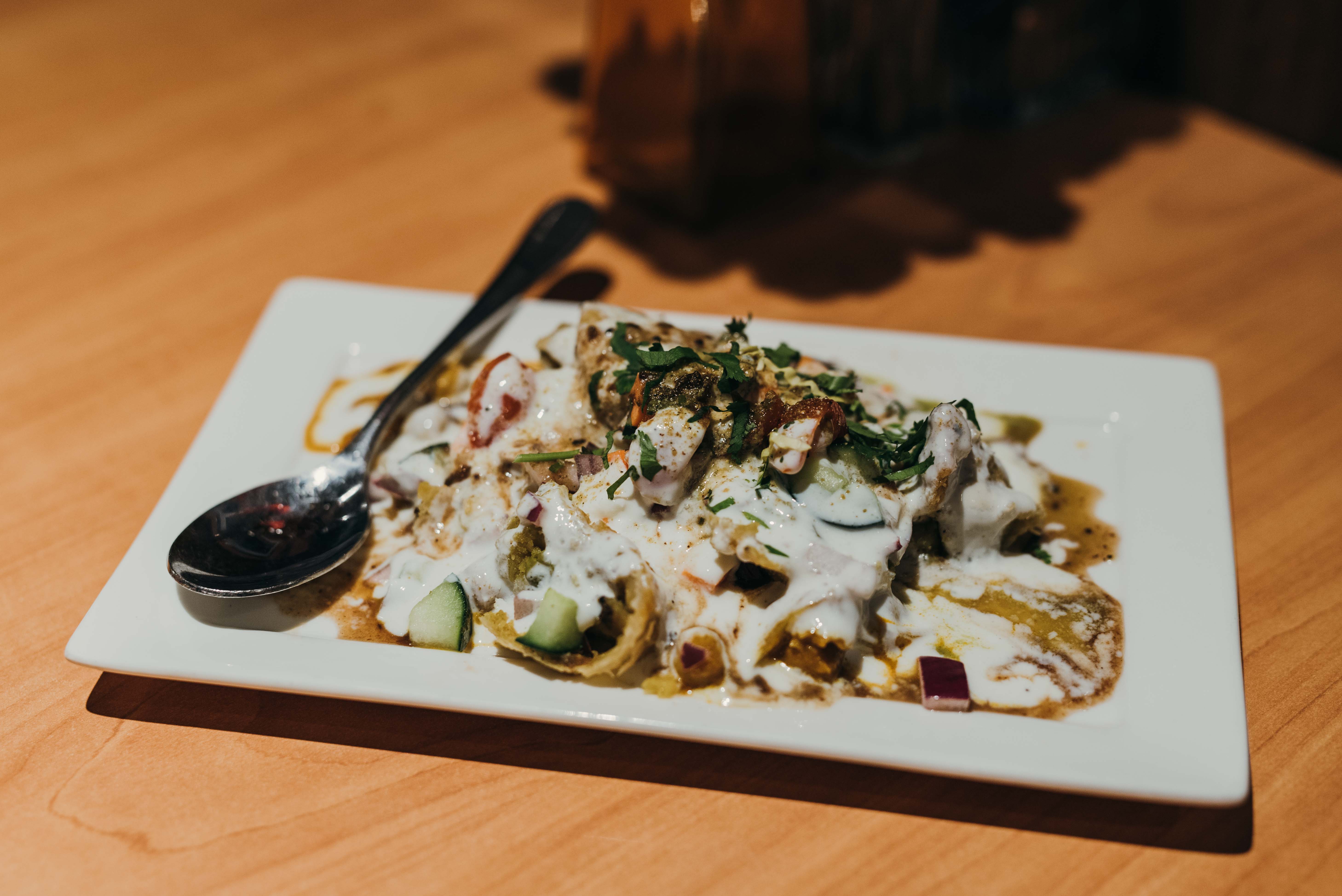 The samosa chat ($7) is the classic pastry drenched in tamarind, mint and yogurt sauces then topped with onions and chickpeas. This dish is not to be missed — each bite is distinct, the blended sauces adjust in a drastically different way each time.