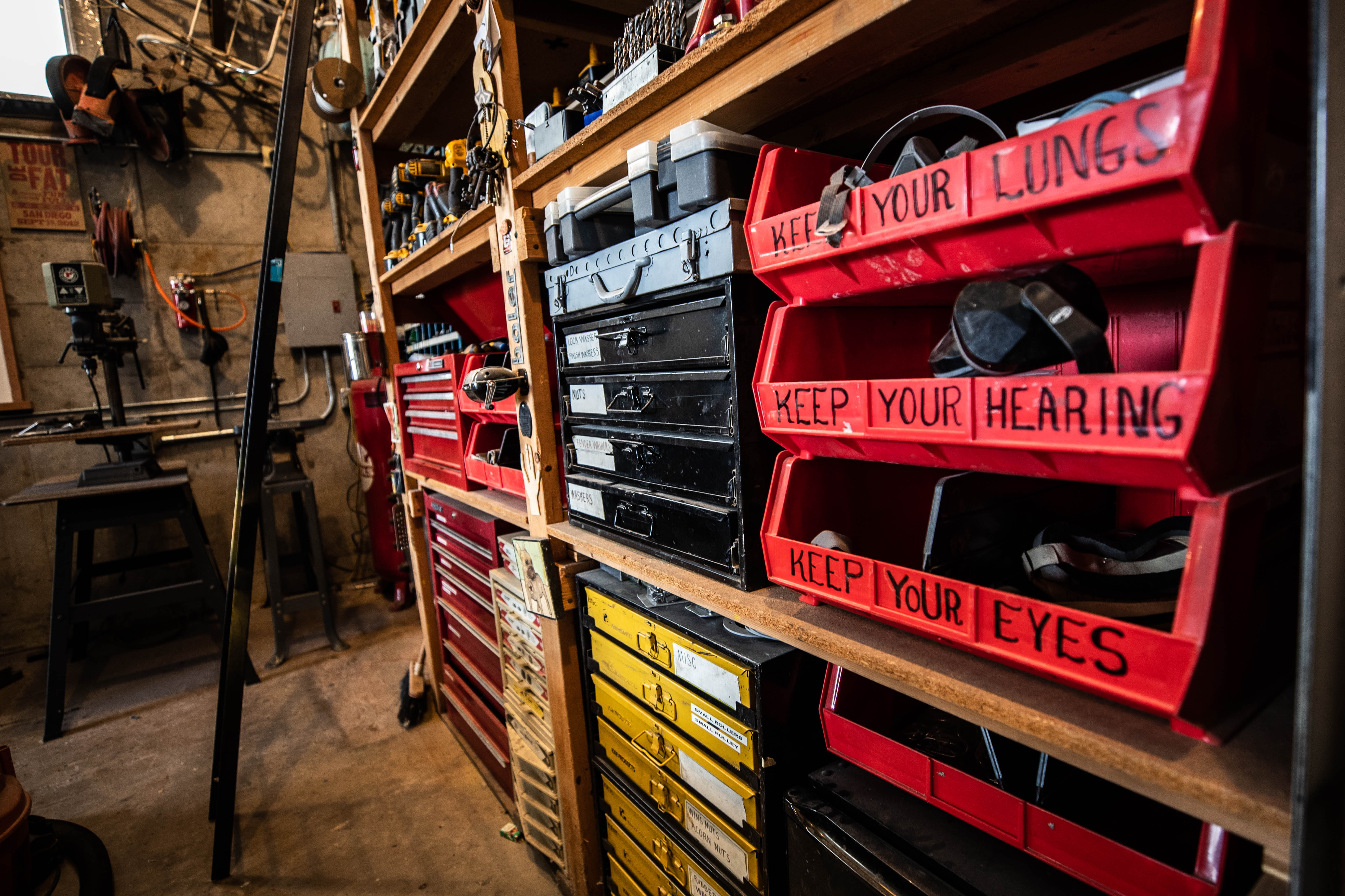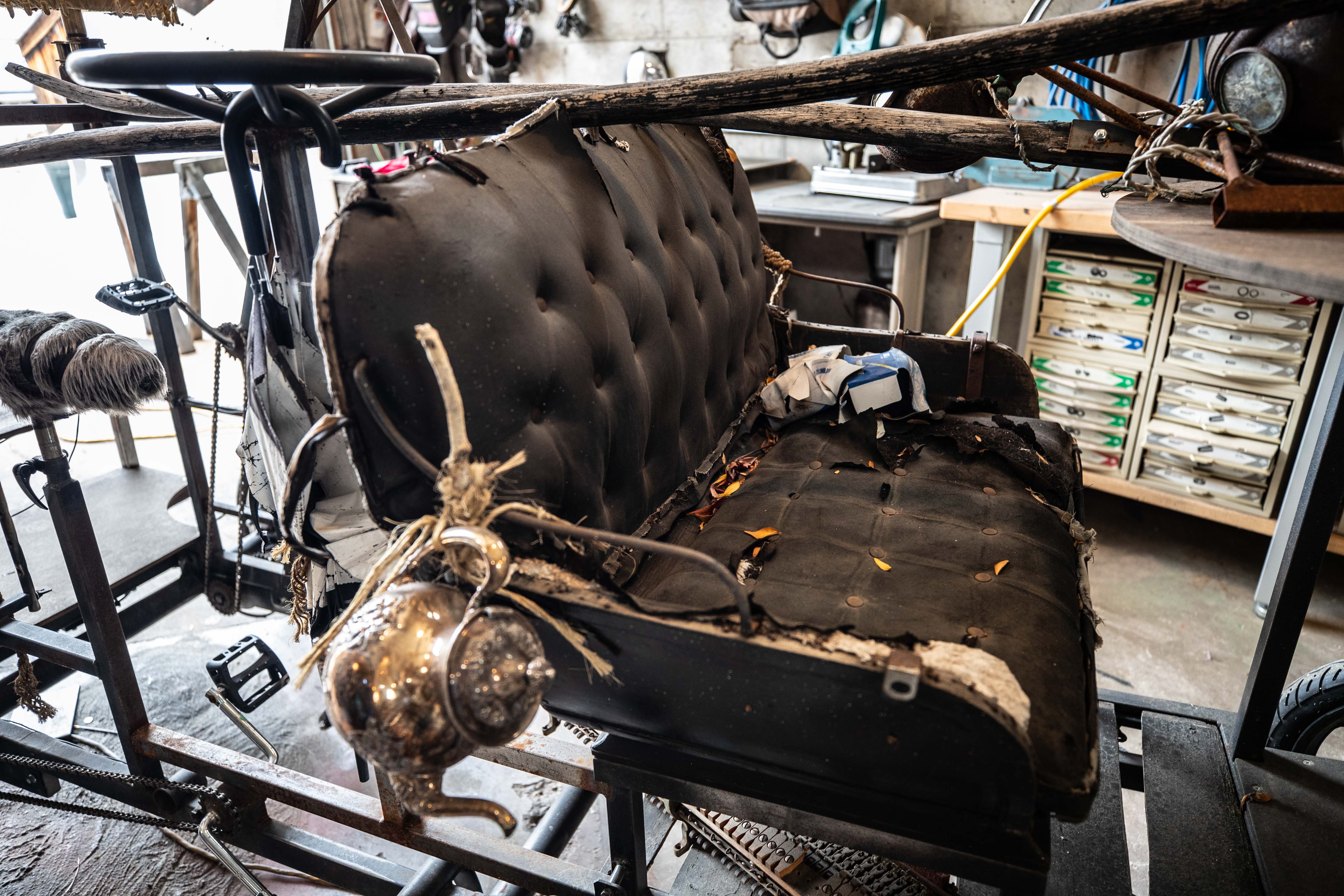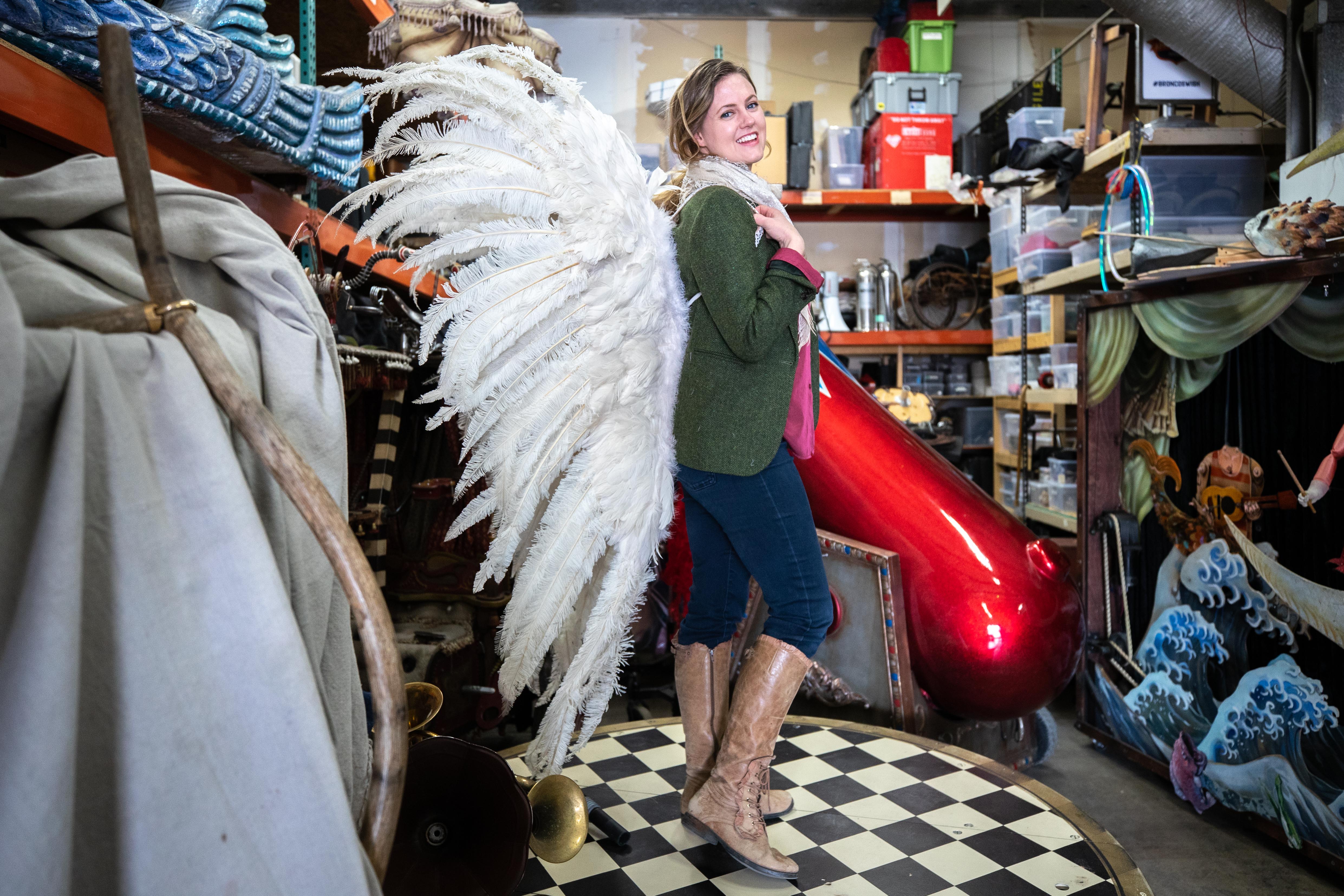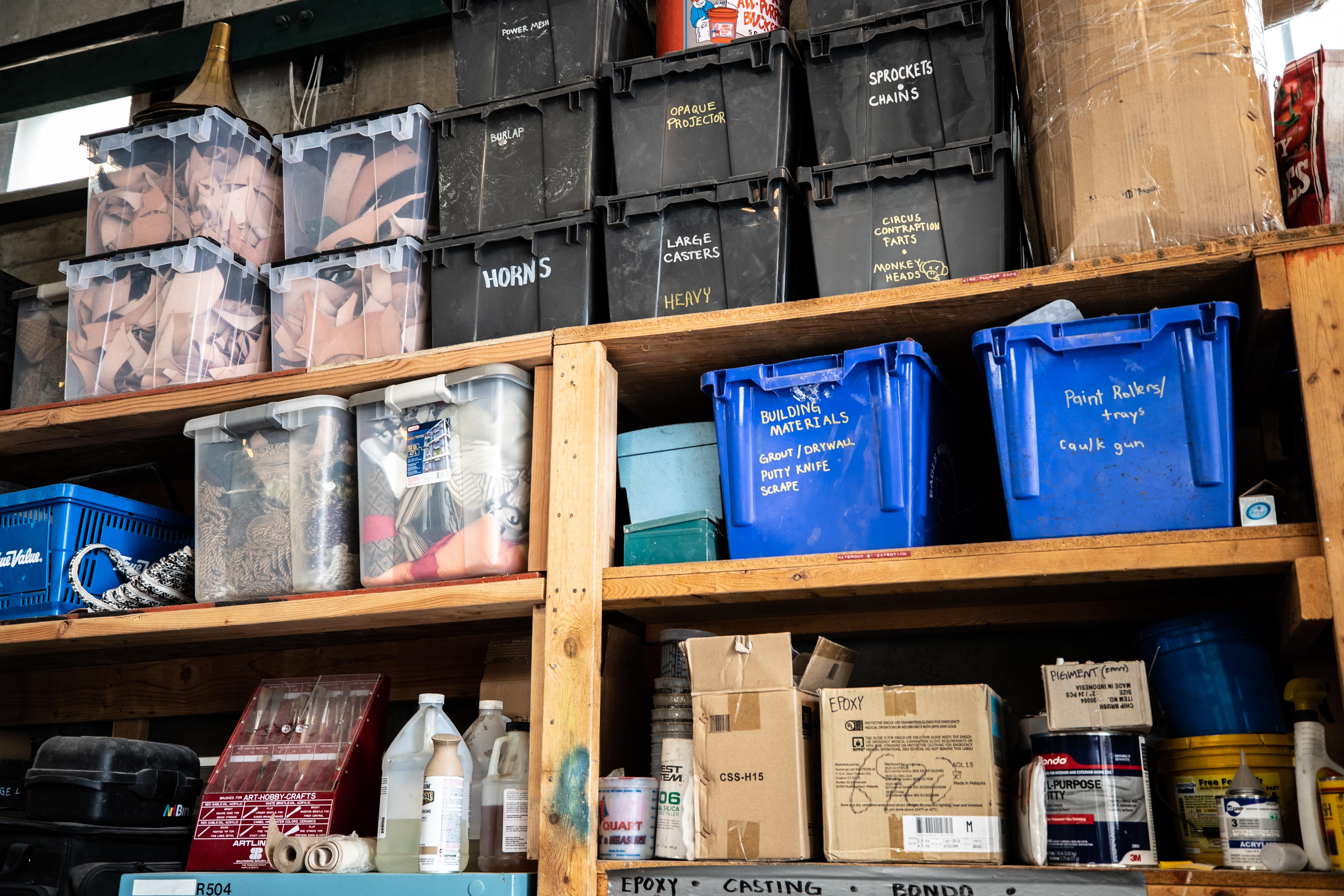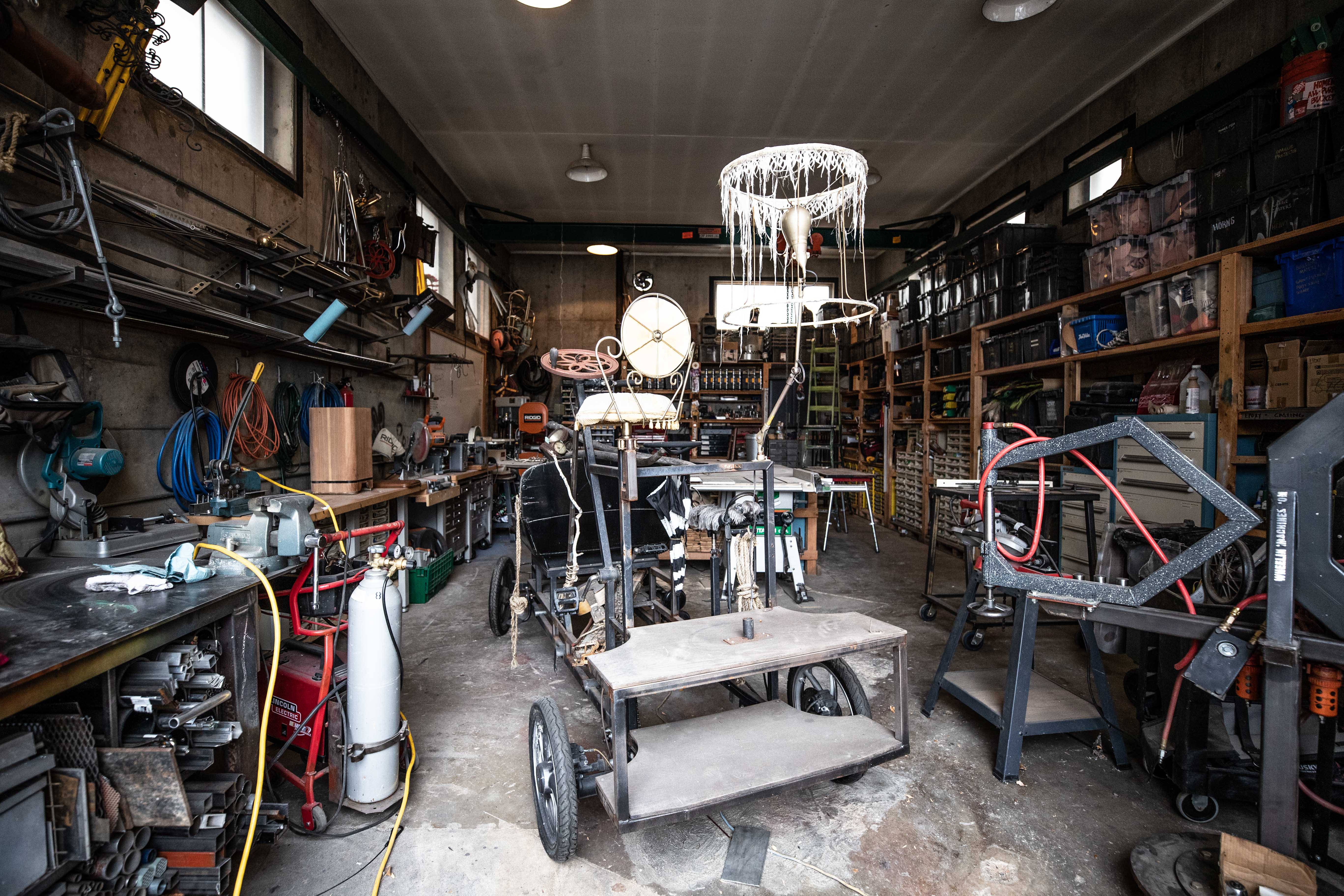 Every single prop used in the performances is conceptualized by the duo, and almost everything is made or reinvented by them as well. Hunting through estate sales, thrift stores and even plane graveyards, Mike and Cole accumulate relics that sometimes provide the jumping off point for an entire event. Currently, in their garage unit — where the fabrication happens — an old carriage seat stuffed with the original horsehair sits, waiting for Mike’s adept handiwork, while plastic bins line the shelves with labels like “Circus Contraption Parts + Monkey Heads” or “sprockets and chains.”