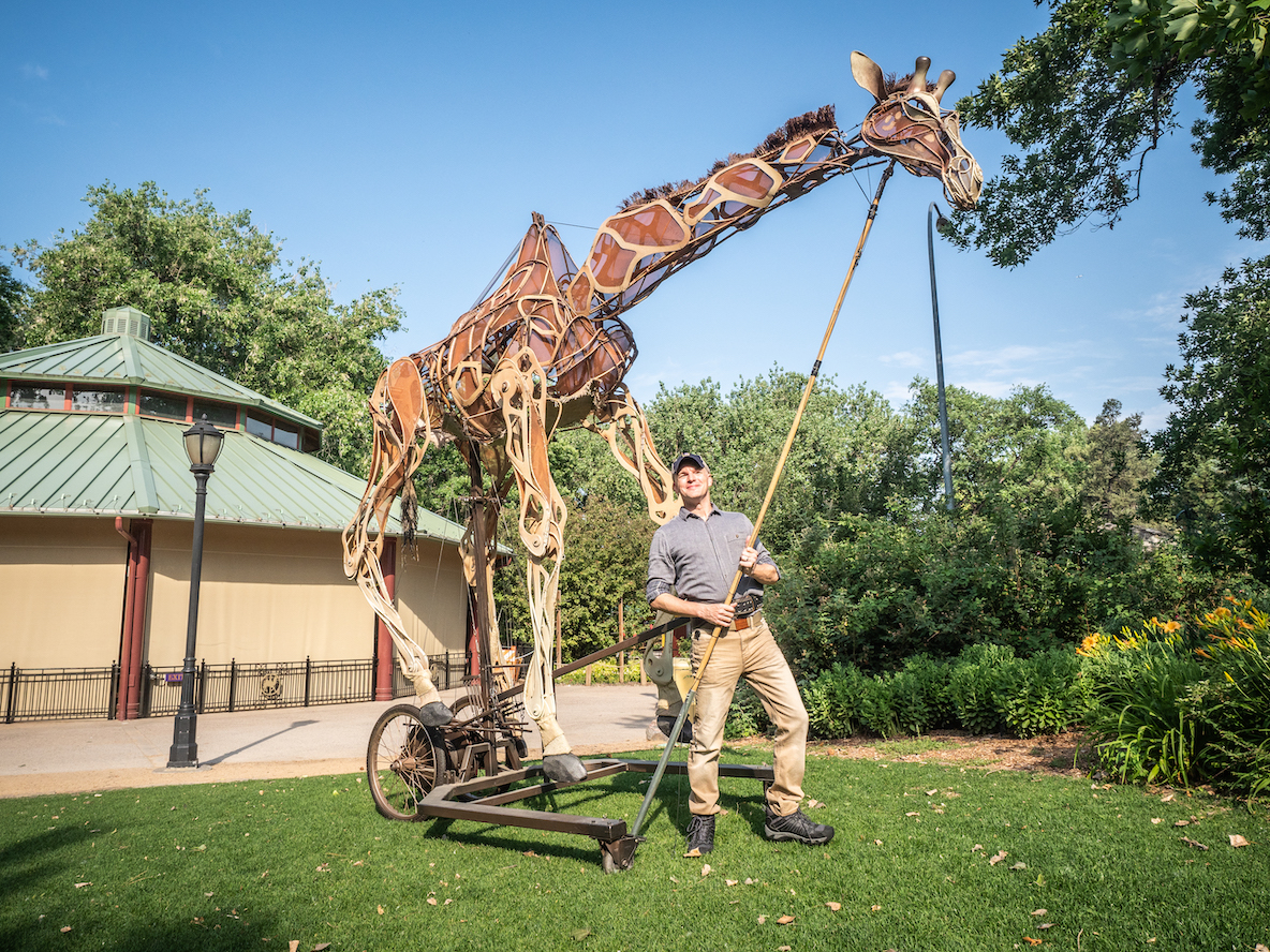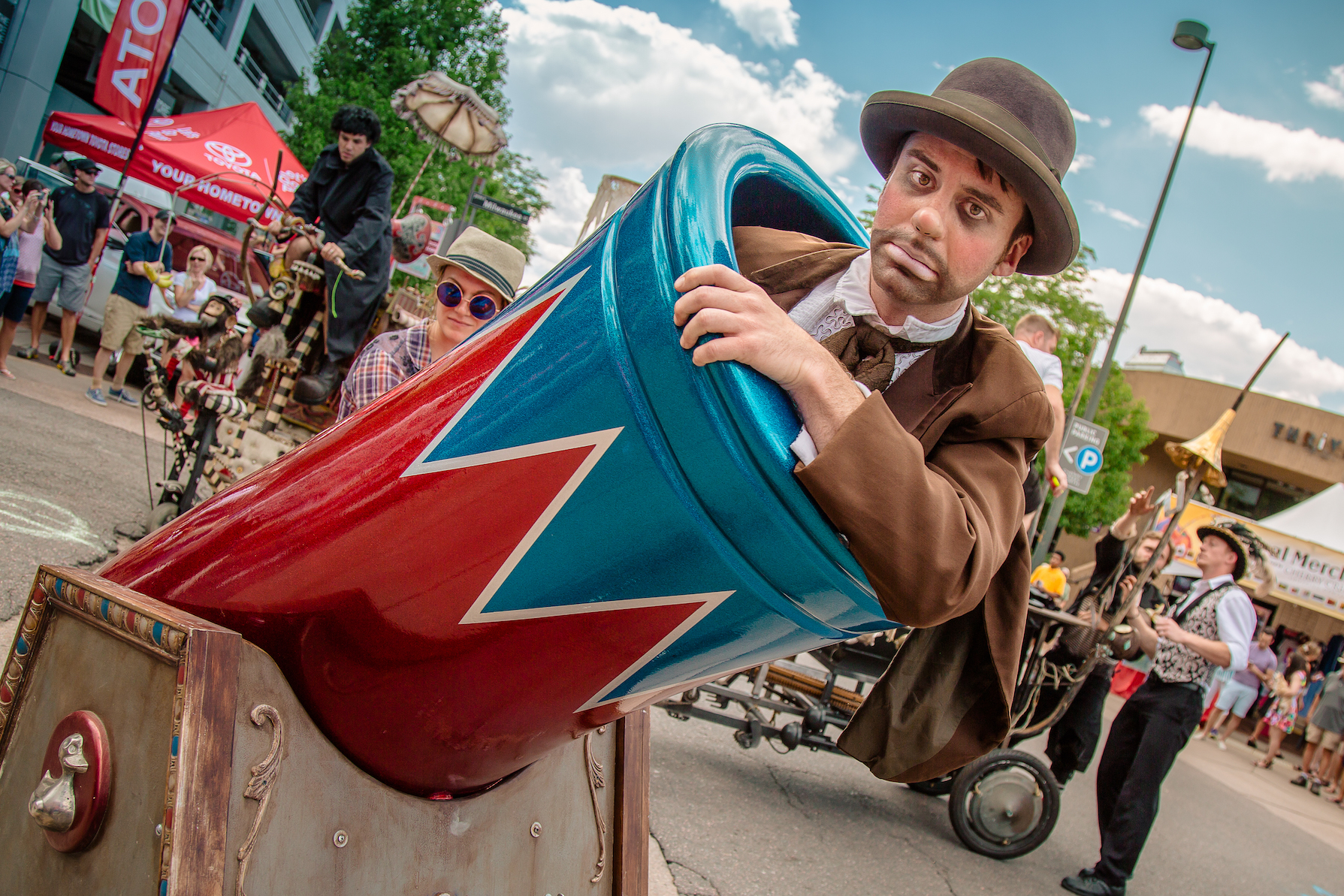 Some of the shining moments from their past include creating original performances, art and venues for New Belgium’s Tour de Fat for nearly as long as the event has been around, producing a show called Squirm Burpee which performed Off-Broadway and was reviewed by The New York Times, the enormous kinetic wooden puppets of animals at the Denver Zoo and their three years working with the Cherry Creek Arts Fest. Even though they take great care to not replicate their performances — a product of their obsession with invention and innovation — much of their style falls into the realm of nostalgic-futurism. They’ve been mislabeled as steampunk, or as a little brother to Cirque du Soleil, and recently they’ve struggled with the references to Meow Wolf — but ultimately the beauty of Handsome Little Devils is that it’s nearly impossible to pin them down, or put them in a single box (and Cole is “surprisingly good at getting into and out of tiny spaces,” as she mentioned, anyway.)