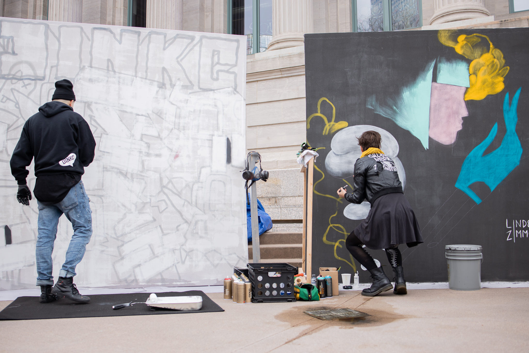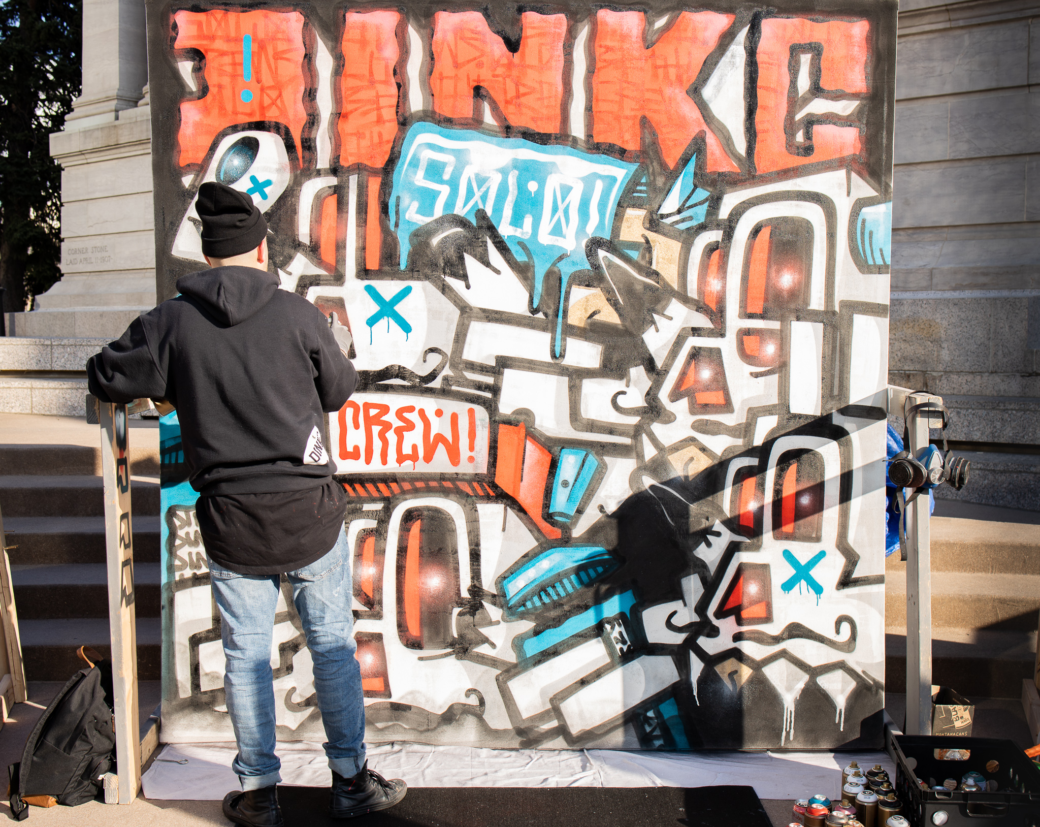 DINKC in front of his finished mural at DiNK Comic & Art Expo 2019.Local and popular street artist, DINKC, was able to join in as one of the hand-picked live painters to create a mural in front of McNichols Building. His presence as a street artist (alongside other street artists) proved the event was dedicated to blurring the lines of the art and comic book communities. Such sentiment was not lost on DINKC.