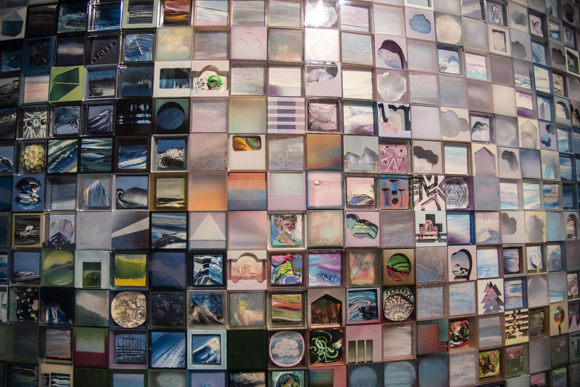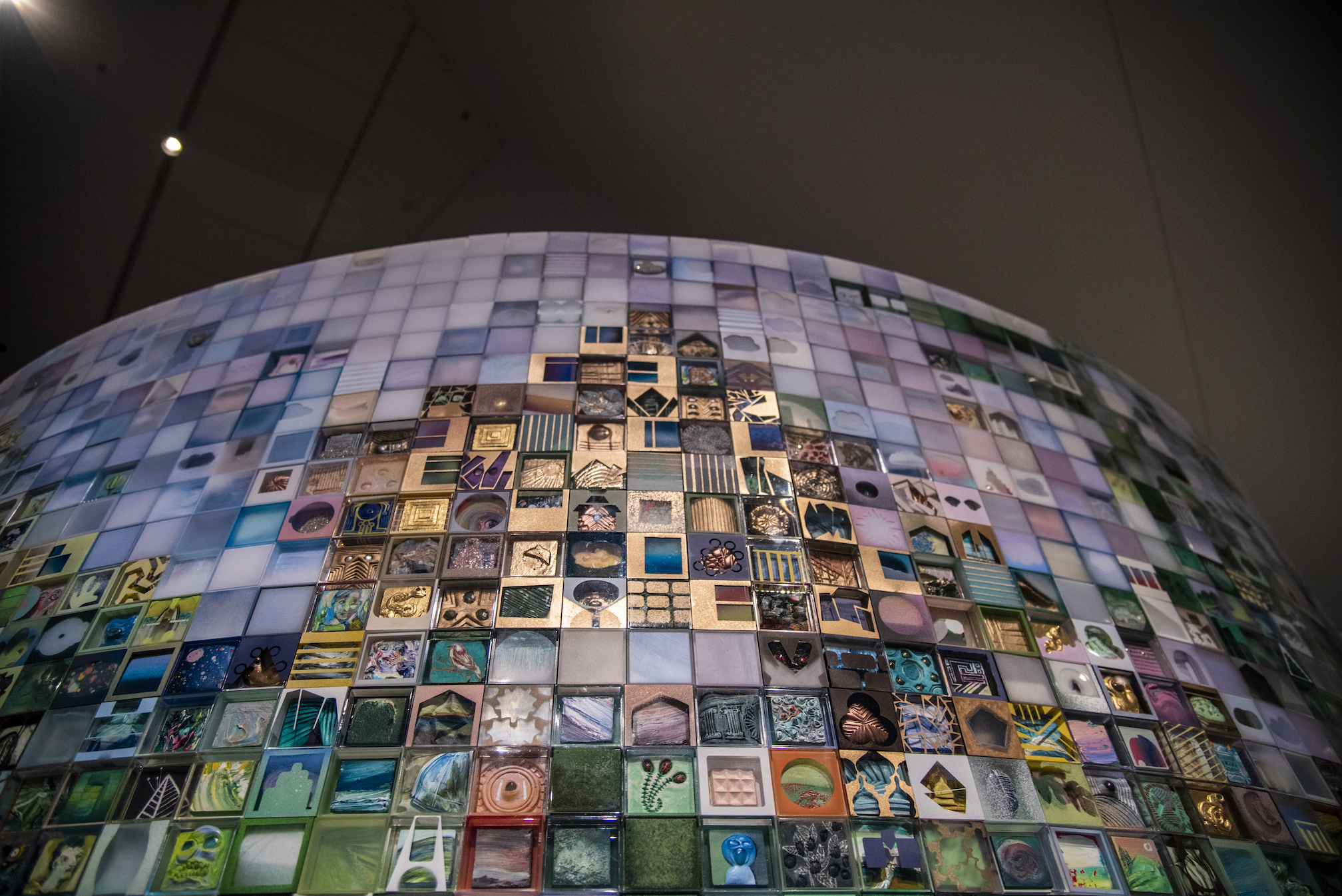 The column is large enough to walk around without seeing people on the opposite side, allowing for ample time to inspect as many tiny boxes as you can. Between the movement of stepping around the column and the hypnotic, mosaic-like aesthetics, the entire experience is meditative. Through strategic placement of similarly colored pieces, Saiz suggests a pixelated landscape — waves at the bottom, land masses with mountains, skies with clouds. The lack of definitiveness allows each person to project their own vista.