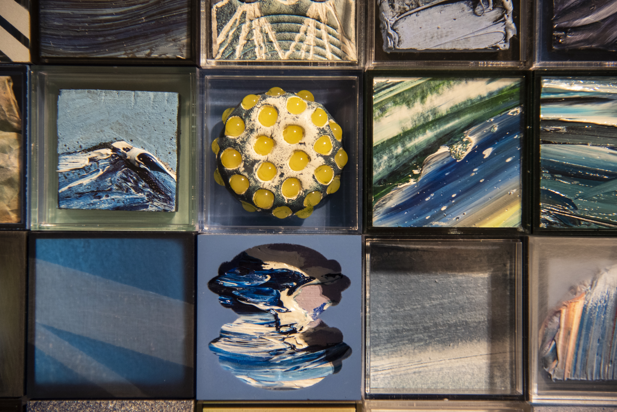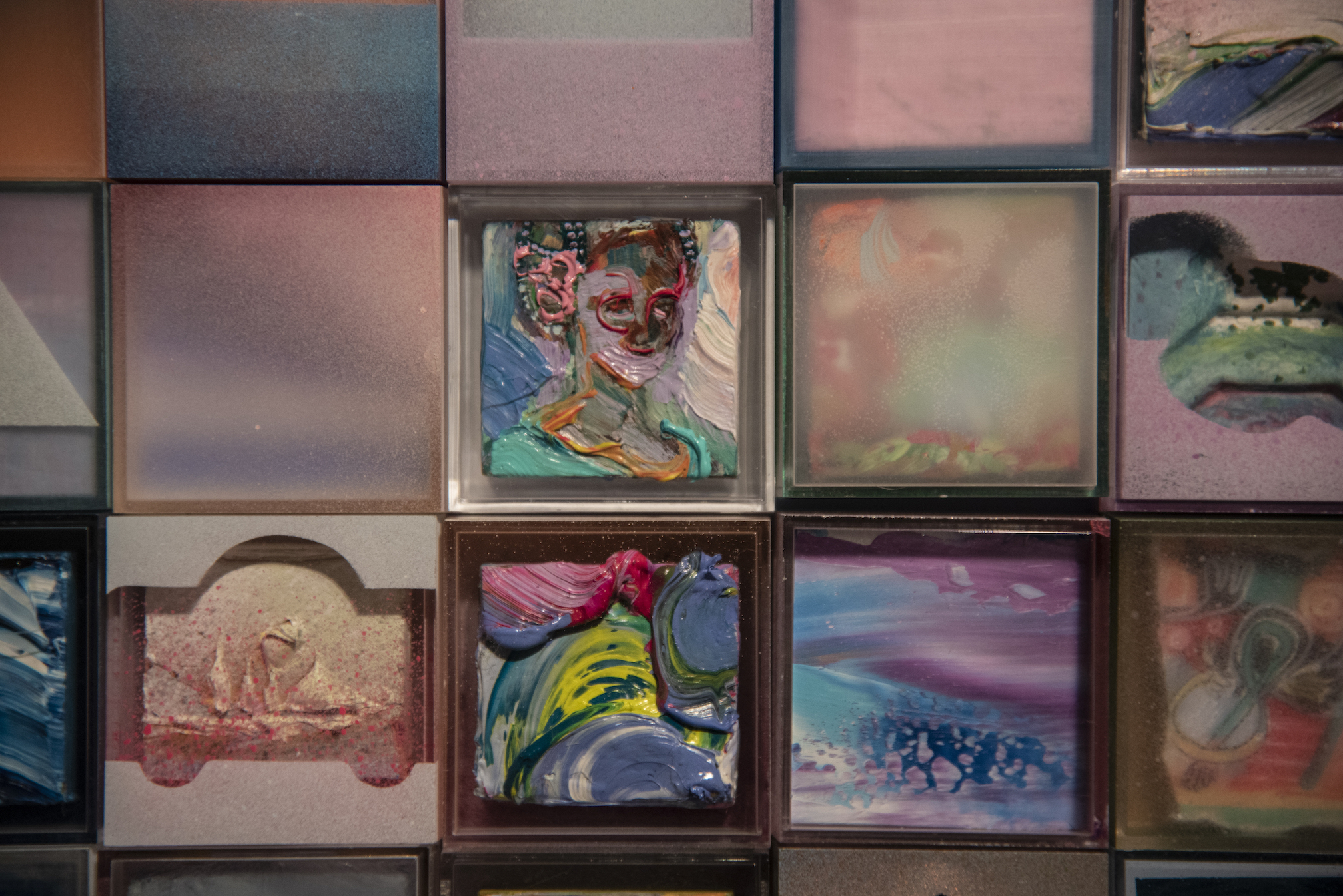 Composed of 10,000 small square “paintings,” Saiz’s exhibition is more about an overall ambiance than about each individual artwork. Discussions about his installation have bounced around for more than a year, but ultimately Saiz completed the massive workload in 150 days. It’s positioned in the Eyes On space on the fourth floor of the DAM, so as soon as you enter the gallery your eyes are drawn to it naturally.