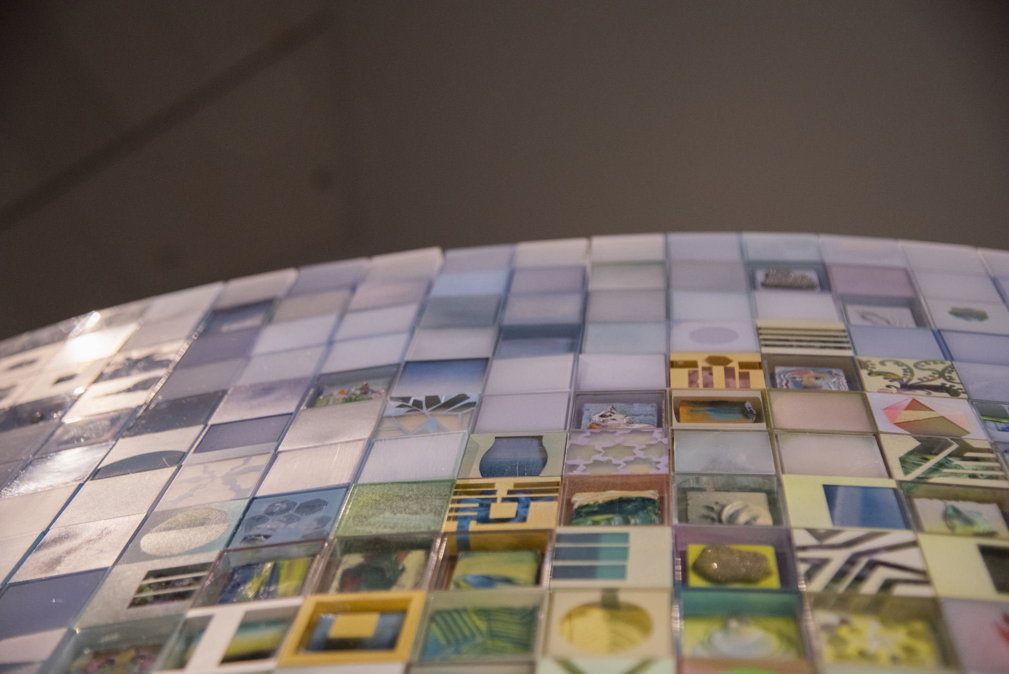 Lights shimmer off the surface of the pieces — which are all in acrylic boxes, taped to a single column — reflecting like a disco ball onto the walls and ground. The first impression is mesmerizing, eliciting gasps of wonder when visitors step into the space it occupies. To the left of the column, there are five framed pieces, each holding one of the boxes at eye level — representing five idealized utopias found in historical literature.