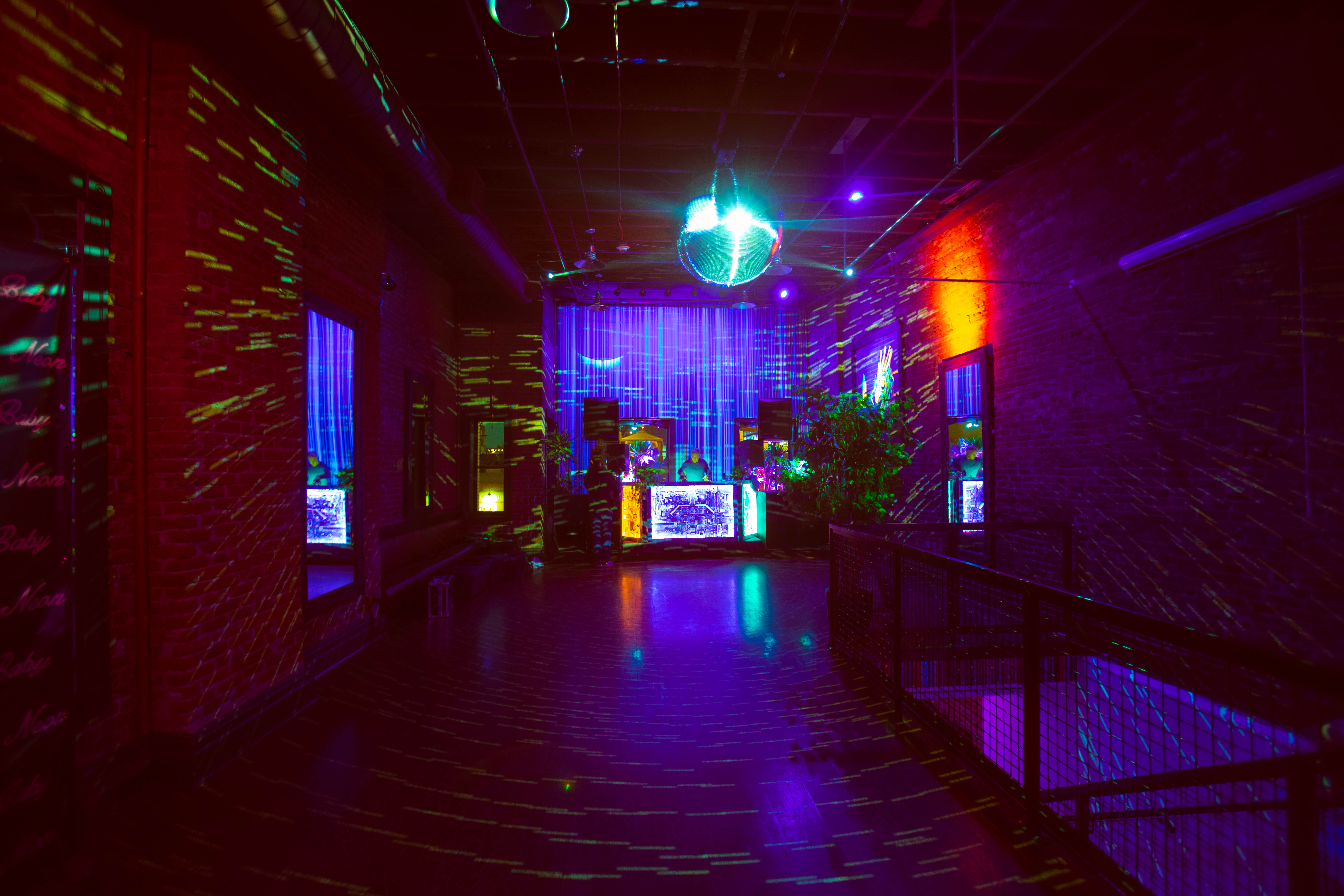 If you stay on the first floor, the magic of Neon Baby will be lost on you because upstairs is where you’ll find the disco ball. Even the most skeptical club goers are enchanted by the illusions created when lights bounce off a disco ball, and the second floor is designed to enhance that experience. The disco ball is so central to the design of the club that walking through it can feel dizzying — like the walls and floor are revolving around you. The narrow room is punctuated by the same DJ booth that occupied Yeah Baby on one end and an illuminated blacklight bar on the other.