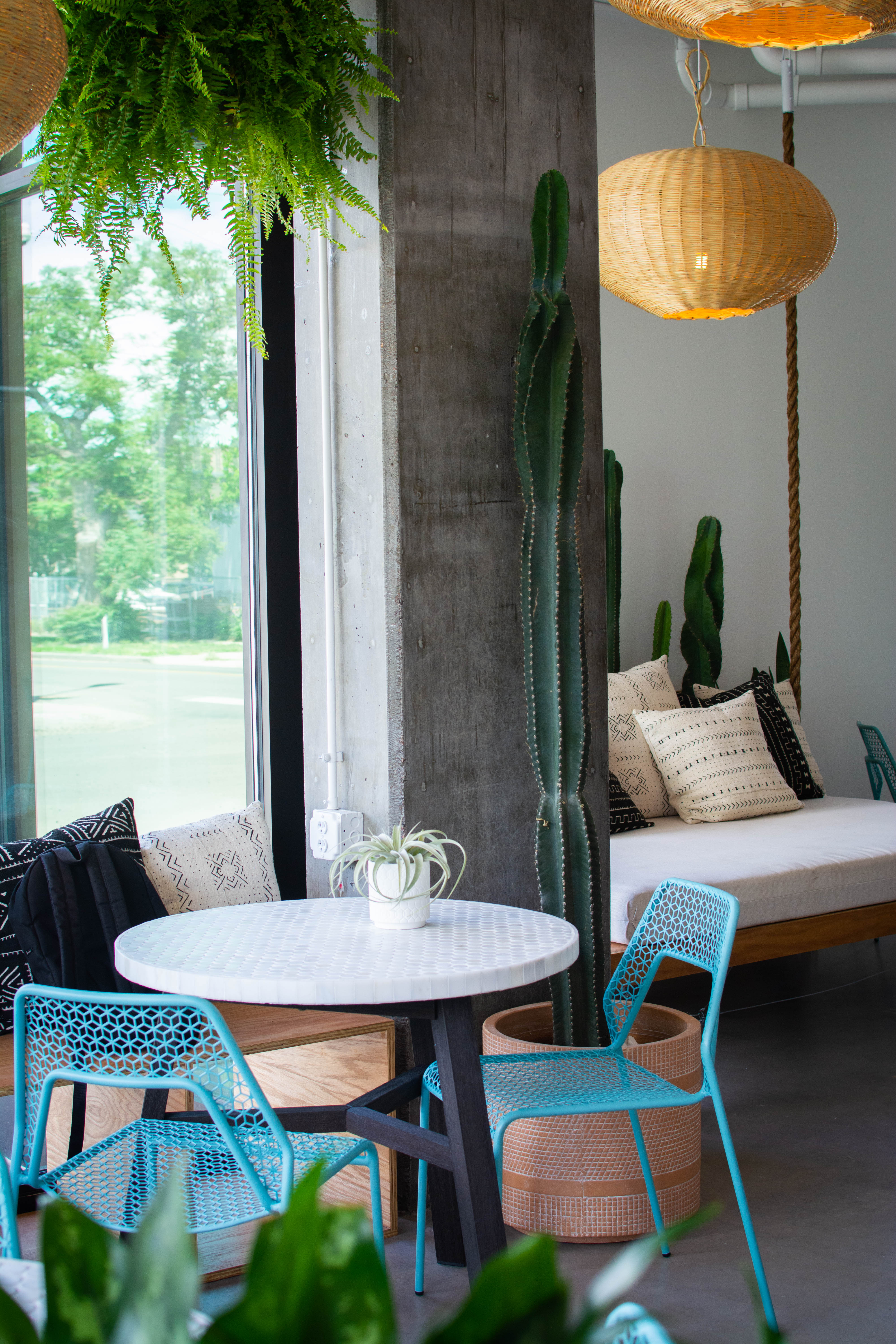 Though the husband and wife duo was inspired to start Lacuna from their lives in New York, the space itself has decor from the couple’s various trips to Morocco. Walking in from the street, guests enter the café space with custom-made Moroccan lamp shades, a hanging bed and a wall of plants. The whole space – including the yoga studio – is filled with natural light.