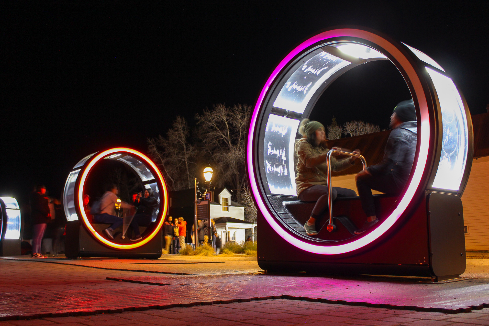 Designed by a large team, Loop required people to play with it in order to light up and work. Composed of six free-standing, circular devices, the “loops” referred to the shape of the entire installation as well as the stop-action “films” played on the inside and outside. Sitting inside, a participant had to push a metal bar back and forth which pushed the “film” into action while also illuminating the edge with different colored lights. The team who created Loop is Olivier Girouard, Jonathan Villeneuve, Ottoblix, Générique Design, Jérôme Roy and Thomas Ouellet Fredericks.