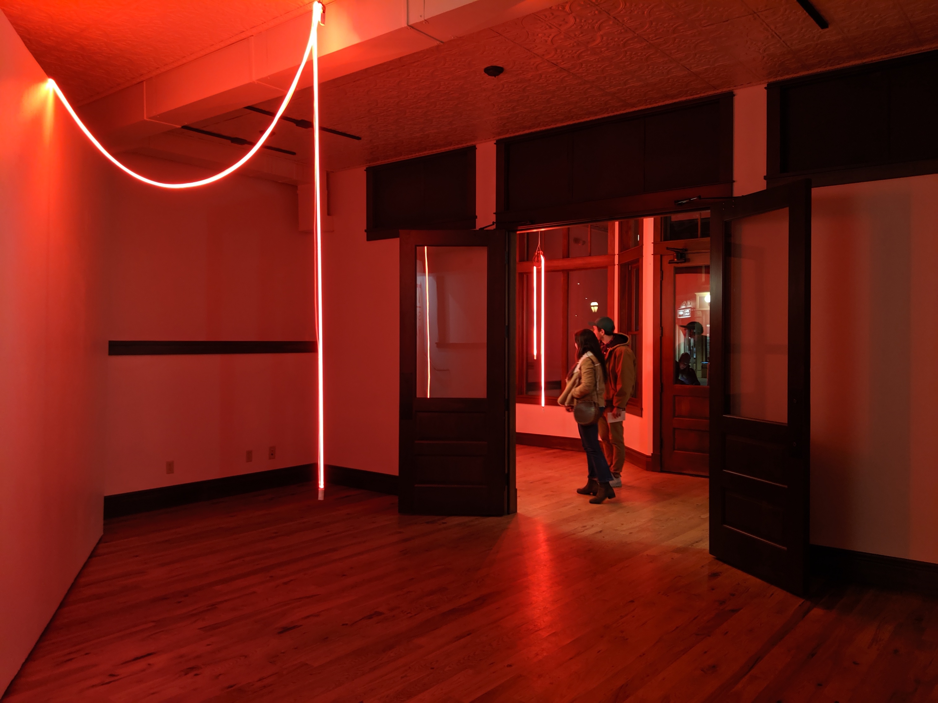 Denver-based artist Scott Young made more than one installation for WAVE — one outside with the rest of the works, and one inside Gallery@OMH. The one inside the gallery was not interactive, like the other pieces in the festival, although it certainly immersed the viewer in its own way. Called Tension, an entire room in the gallery was filled with hand-pulled tubes hanging from metal pulleys with neon gas pulsing through, giving off a red tone. Before entering the room, you could feel the heat and vibrations from the tubes, giving the entire experience a womb-like atmosphere. People found themselves hanging out within the tendrils of Tension for longer than they expected, due to its welcoming atmosphere.