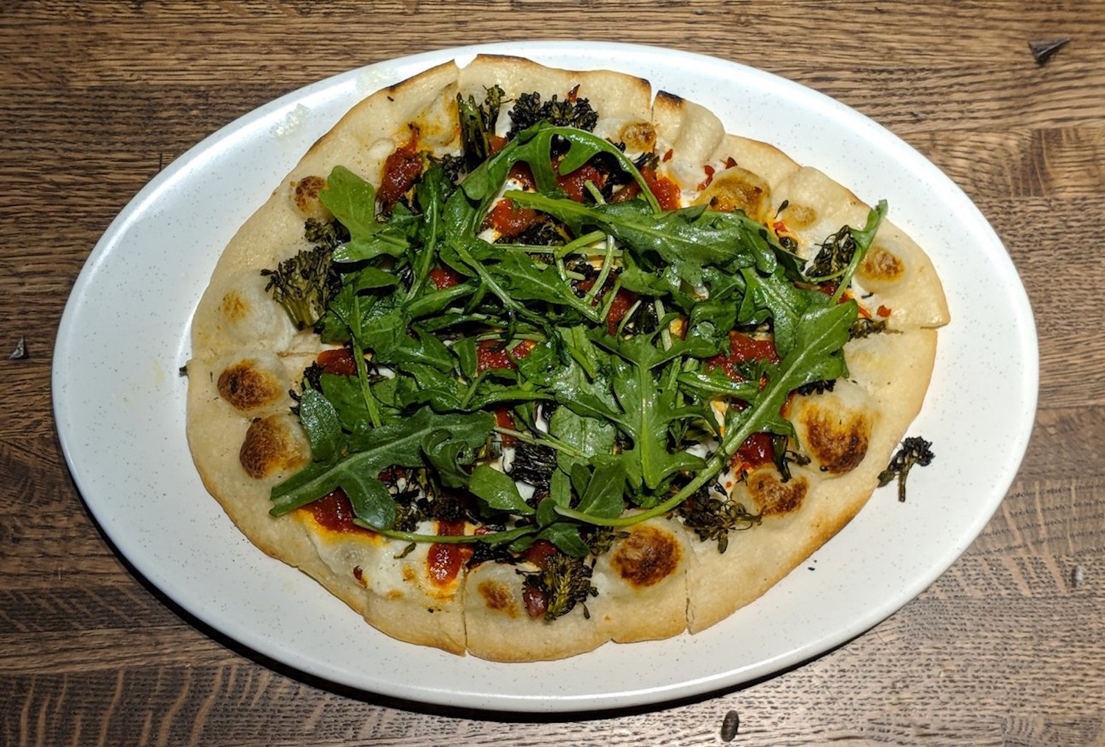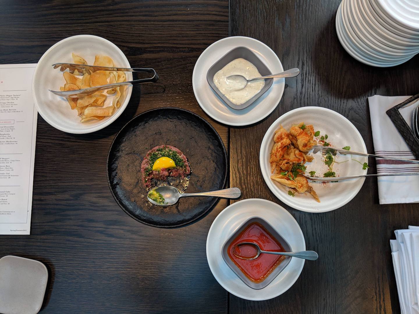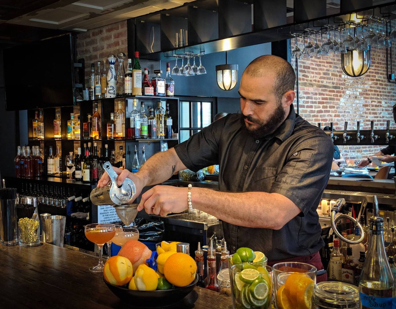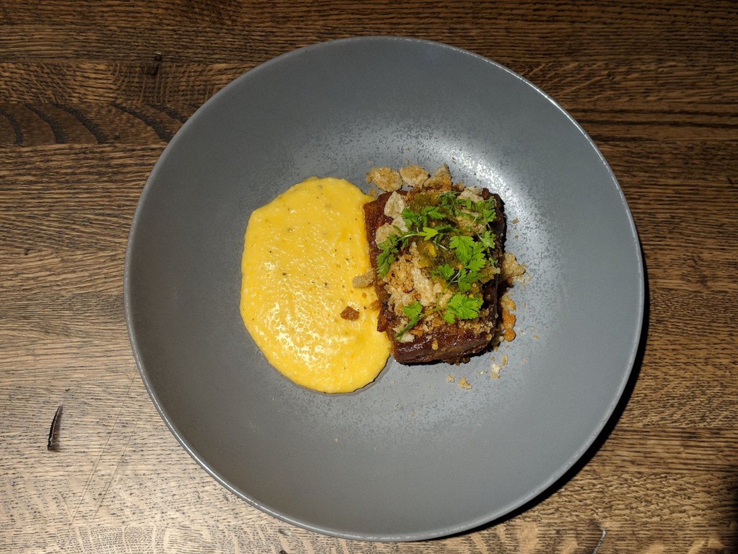 Other notable dishes include informal yet flavorful bites such as the crispy chicken skins ($10) with house ranch, Fresno hot sauce and chive, a classic Margherita flatbread ($13), or the smoked pork short rib ($26) with white bread and chicharron crumble, bread and butter pickle relish and creamy cheddar grits.