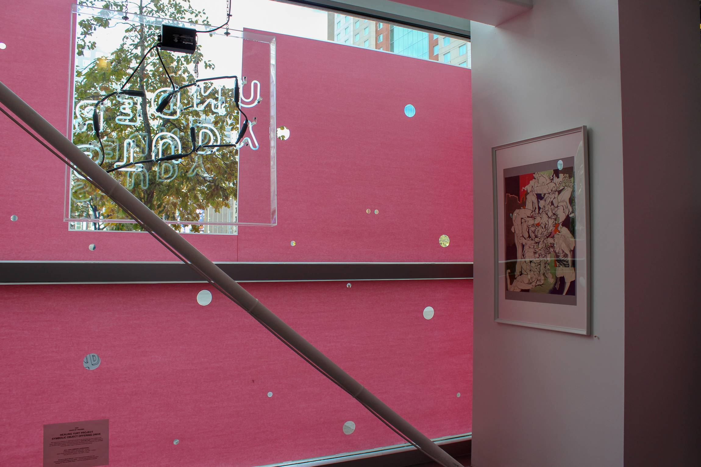There is also an actual container inside the H.O.T. where visitors can leave an item that symbolizes a past trauma in their lives. All the items will be placed on an altar inside a healing yurt at the 2020 Womxn’s March, pushing the message and impact of the H.O.T. beyond the compact walls of Understudy. This “Symbolic Object Offering Drive” is part of the Dream Yurt Project — an ongoing series by Tsogo where actual Mongolian yurts are used as a safe space for survivors of trauma to unite in pain. Tsogo’s civic engagement, especially as it relates to sexual violence, had a lot to do with the formation of this exhibition and she wanted to comingle her efforts in the social justice sphere with her efforts in the art world.