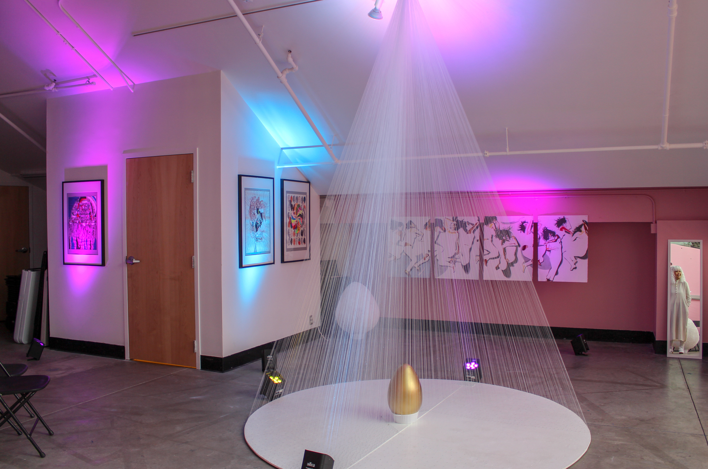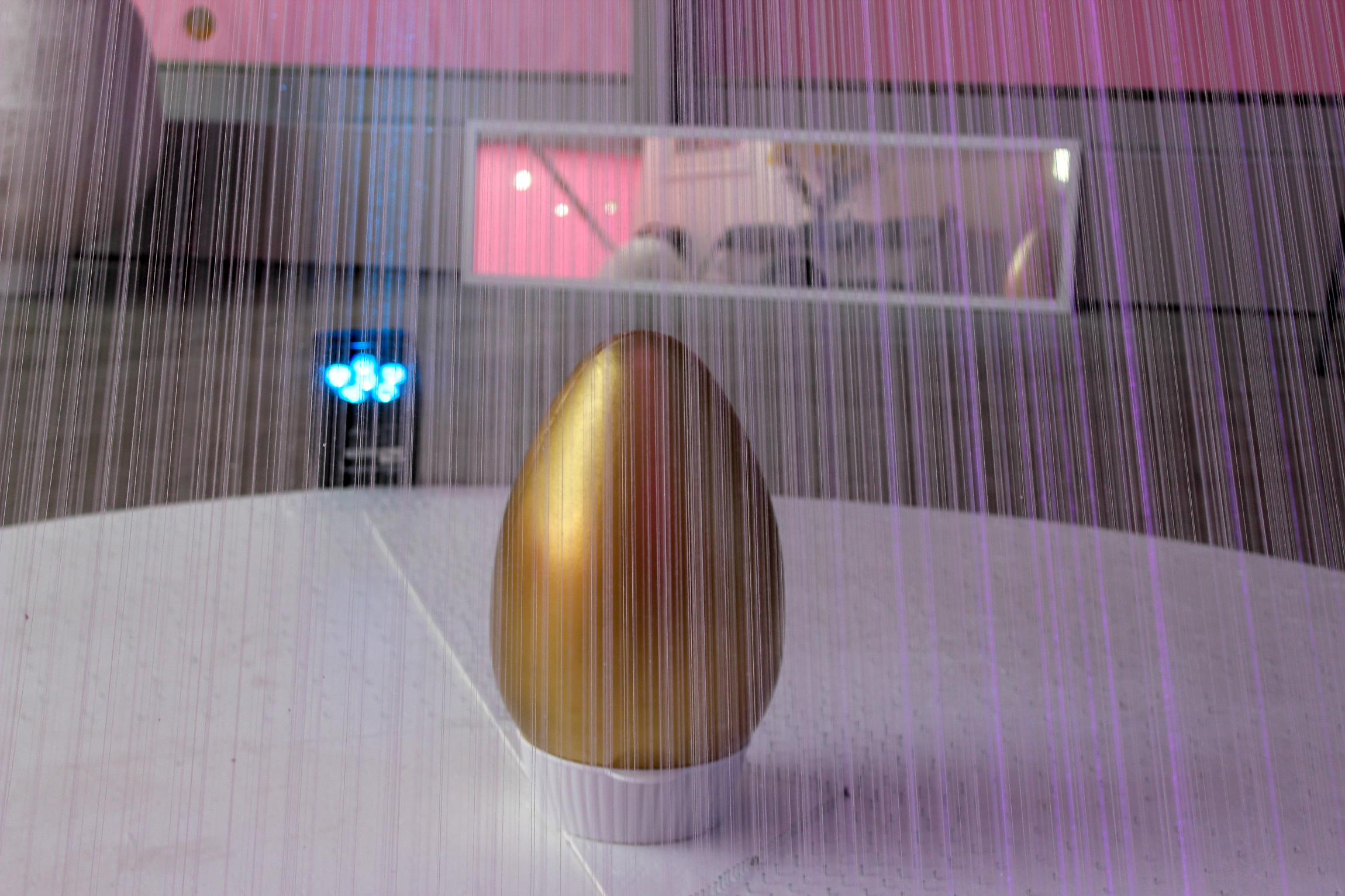 For the first two weeks of the installation, Tsogo worked in a meditative state daily on the Uterus Altar and large Fallopian Eggs, while encouraging people to participate with her. “I wanted this whole experience to be personal but public,” Tsogo explained, while she wore a white ensemble complete with a white wig — her “uniform” while working. Her performance inside the space included wearing the white uniform, listening to recorded versions of her mother singing to her in Mongolian and nailing pieces of string to a circular base for the Uterus Altar. “With each trauma, there’s a penetration that happens,” Tsogo said, a penetration inside our souls. The nails represented that penetration, and the strings represent tension that comes as a result of trauma. She wanted people to witness this process while also considering why they were watching her go through it and then questioning what processes might allow them to heal from their own traumas.