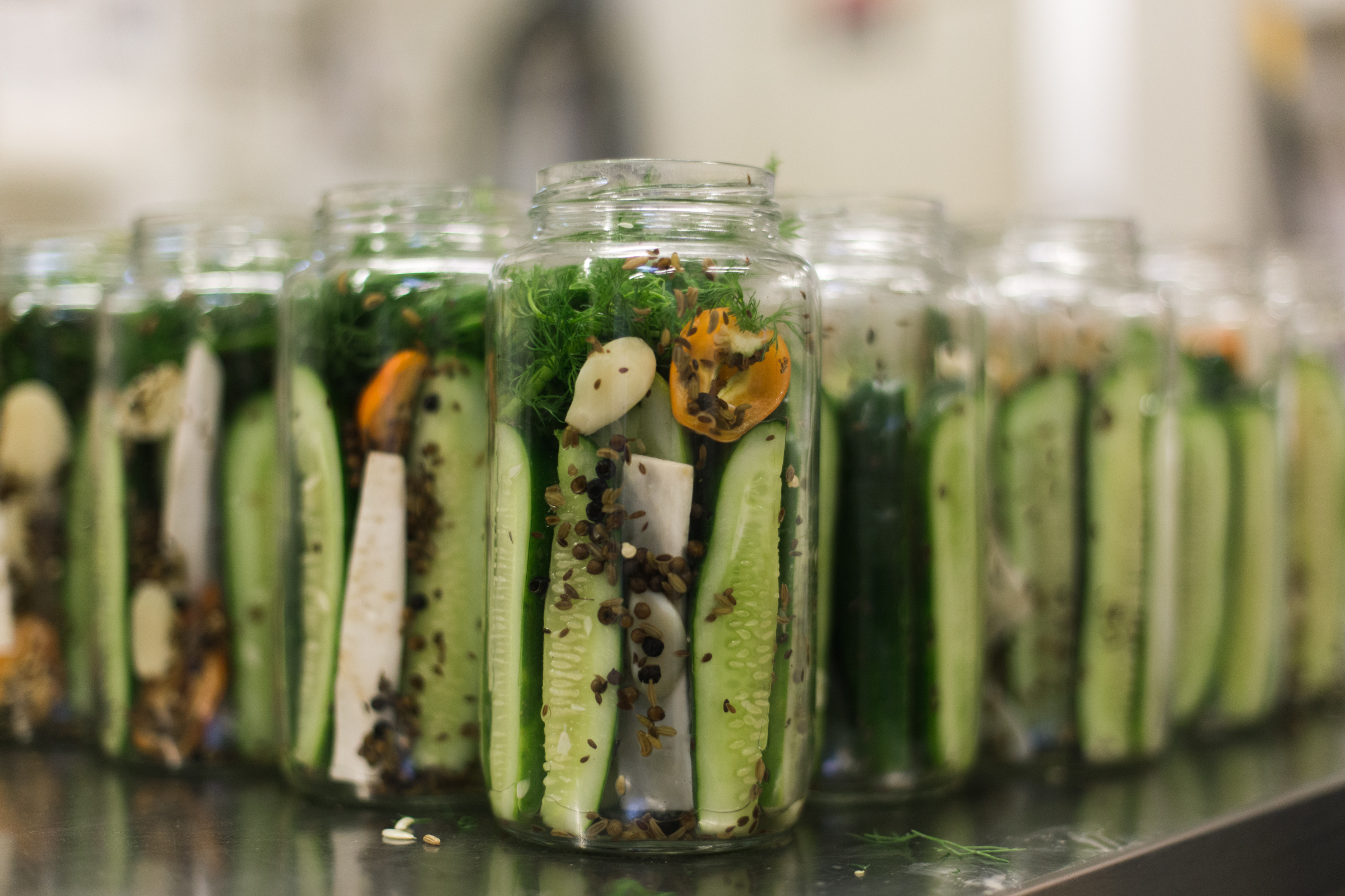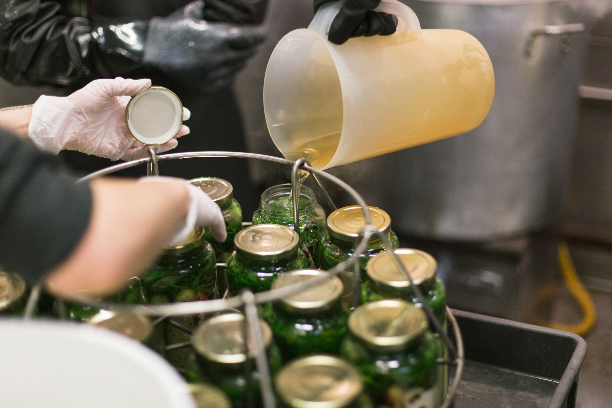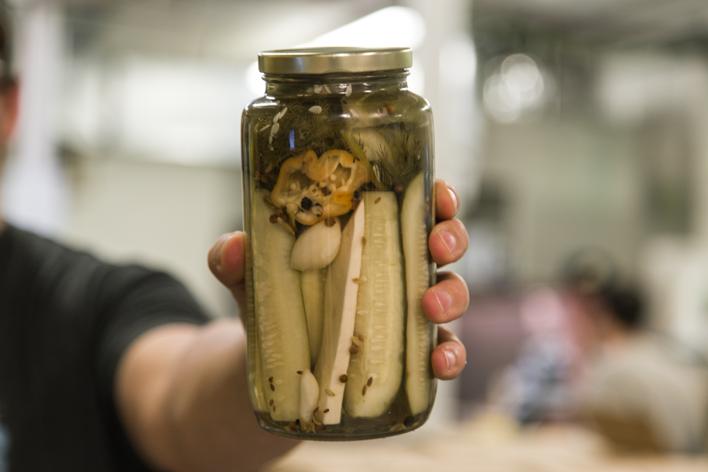 Every week the Dillery goes through 3,000 – 4,000 pounds of fresh produce. The three pickle mainstays are the Caraway Garlic Dills, the Habanero Horseradish Dills and the Jalapeno Honey Dills. The elegant jars are individually composed — spices, herbs, peppers and cucumbers are artfully arranged, then a brine is added. Almost everything is done meticulously by hand. The label machine is one of two automated processes in the facility — the other being used to fill bloody mary mix — which now accounts for 70% of what goes out the door. “We approach packaged foods with a chef’s mentality,” said DuBois, also citing that the production style has taken a lot of cues from the craft beer industry. “We intentionally sacrifice efficiency for quality,” added Park.