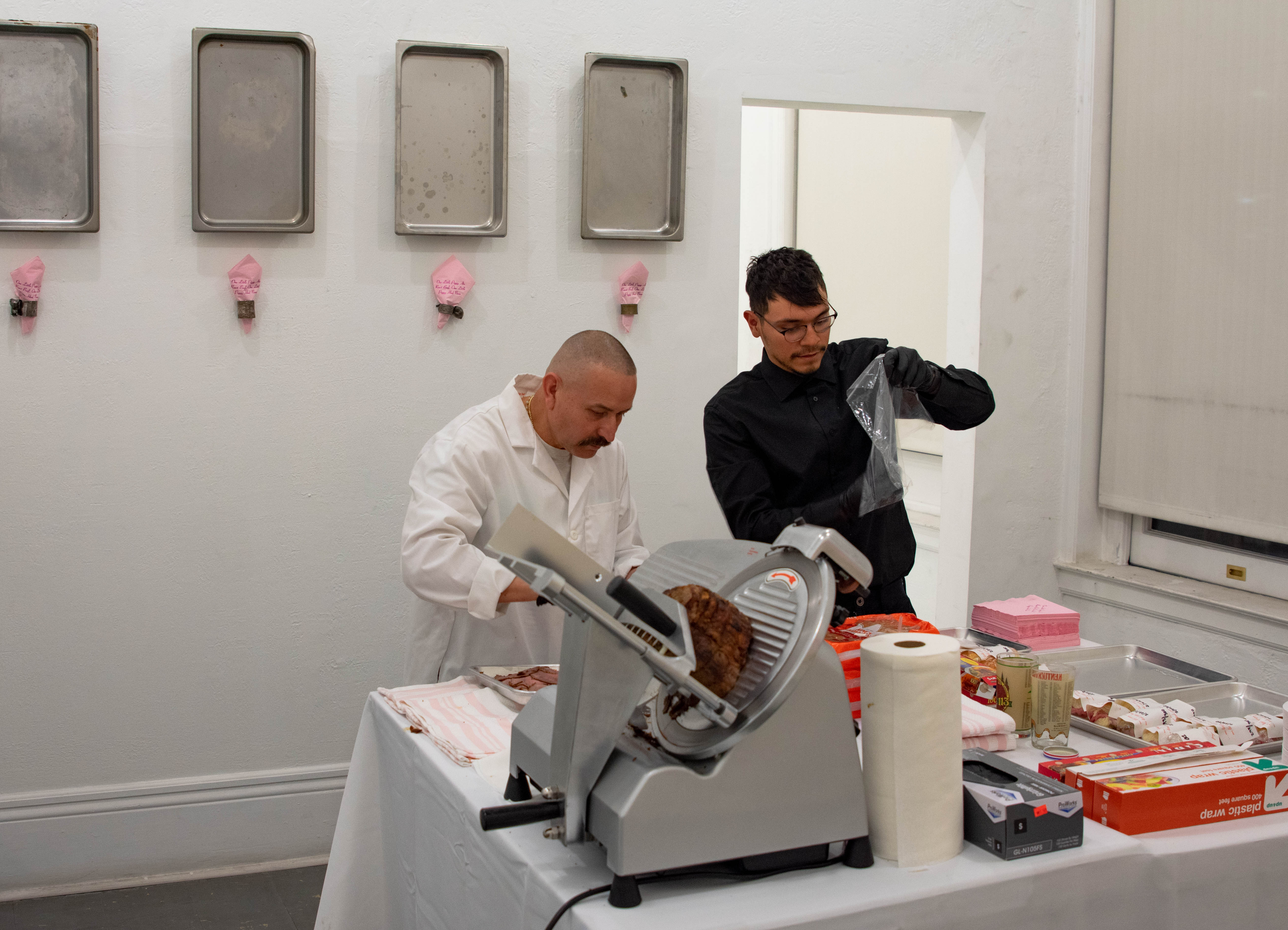 Many of her pieces call viewers to contemplate these liminal spaces, as in Open Art Fax Line which consists of a “functioning independent fax/phone line installed in Gallery for duration of the Exhibition and free/open to the public to fax in art/commentary for scatter presentation on the floor.” Or take One Little Piggy Ate Roast Beef, One Little Piggy Has None, which was performed during the opening reception — with handmade roast beef sandwiches made and served to guests, each labeled with a plastic wrapping noting the name of the work, the date, the number of sandwich out of 300 and Devon’s initials.