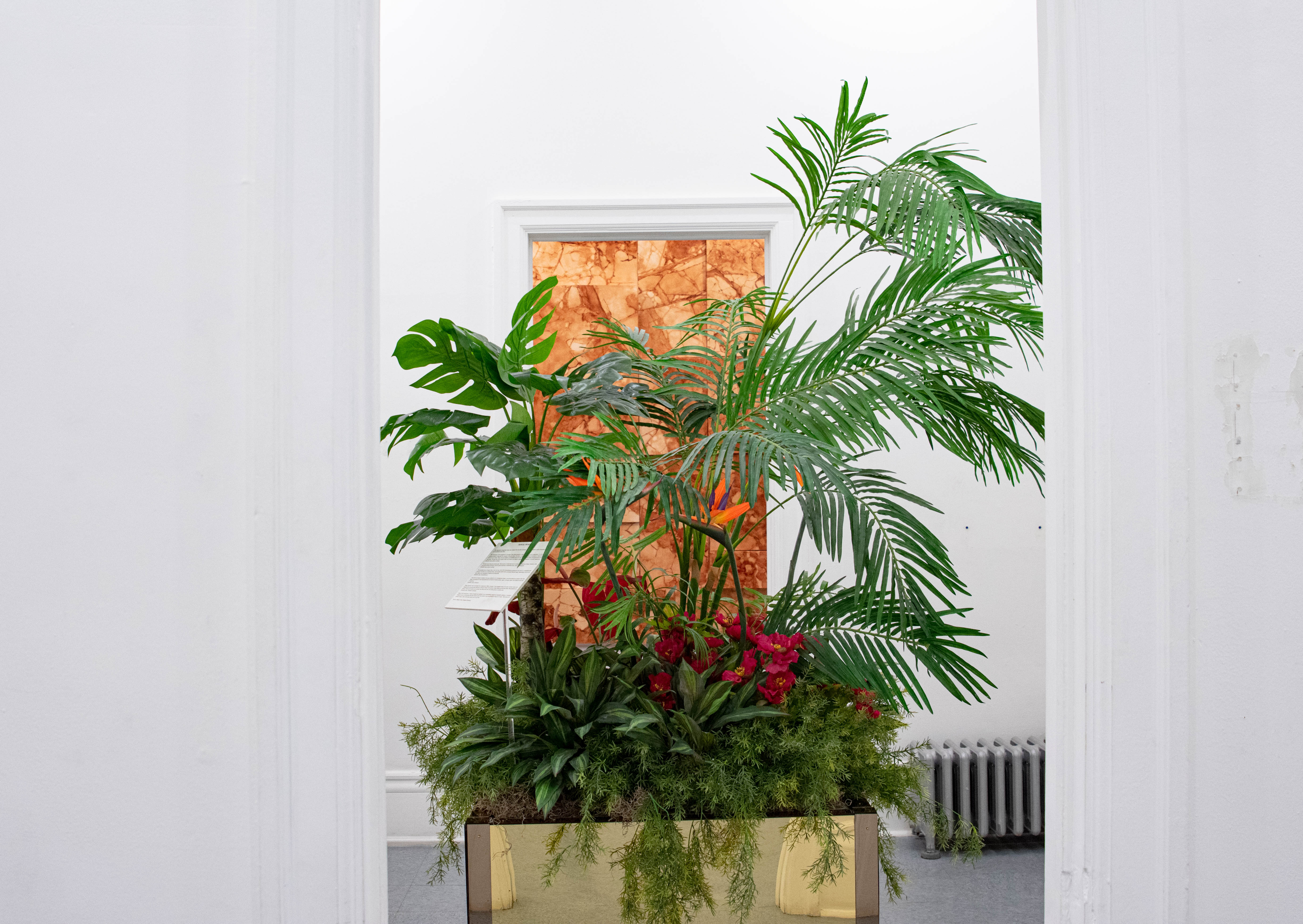 While many of Devon’s works highlight her own personal memories, two, in particular, seem to call out a collective memory being created even as you read this article. In Peacekeeping, Devon perfectly replicates the green painted tiles that serve as the backdrop behind speakers at the U.N. This work is directly juxtaposed with another in an adjacent room titled Make America Great Again. The latter work consists of “faux marble painted tiles and light installed onto wall replicating a section of the Trump Tower.” Each of these two pieces can be seen through empty doorways while standing in either room. The juxtaposition of both artworks calls the viewer to ruminate on one question – which wall would you prefer to stand before?