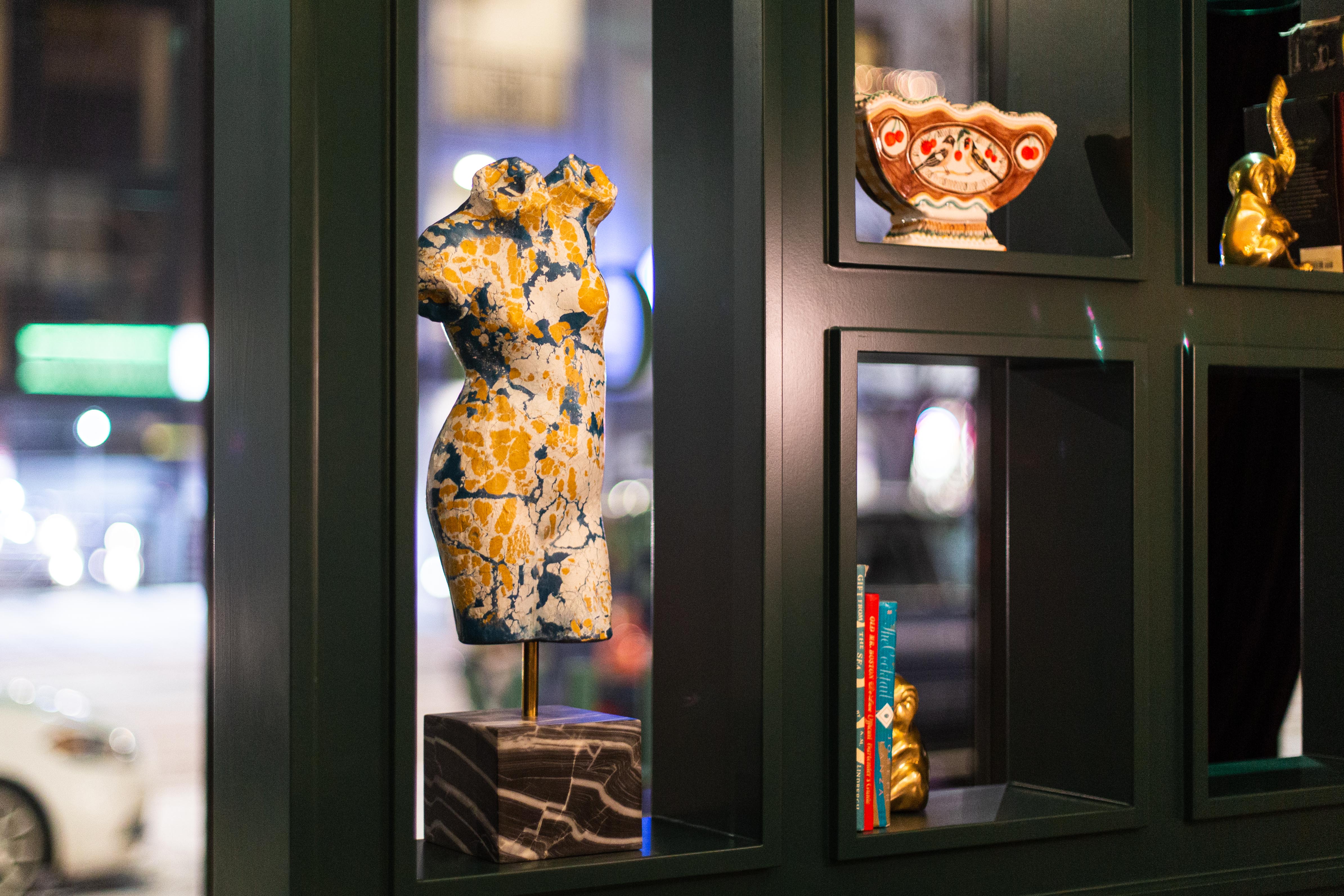 While there are certainly kitschy elements, the decor at Milly finds a way to be transporting rather than cute. The art — curated by Kate Meyers of Kate Finds Art — highlights mostly female artists, many of whom are local. From the large piece by Lindsay Cowles — a Richmond native who turns her oil paintings into colorful wallpaper — to a rendering of a screaming Jonah Hill, the decor takes itself lightly without ever sacrificing quality. This extends to Milly’s general aesthetic, which warps traditional refinement with a plethora of playful accouterments. “Blue Sparrow is more Paris, this is more London,” said Arnold of the bar’s design underpinnings which reference old English clubs. “We gotta have New York-sized spaces in Denver,” she continued. While the space is not nearly as compact as Queens, the design is intentionally cozy.