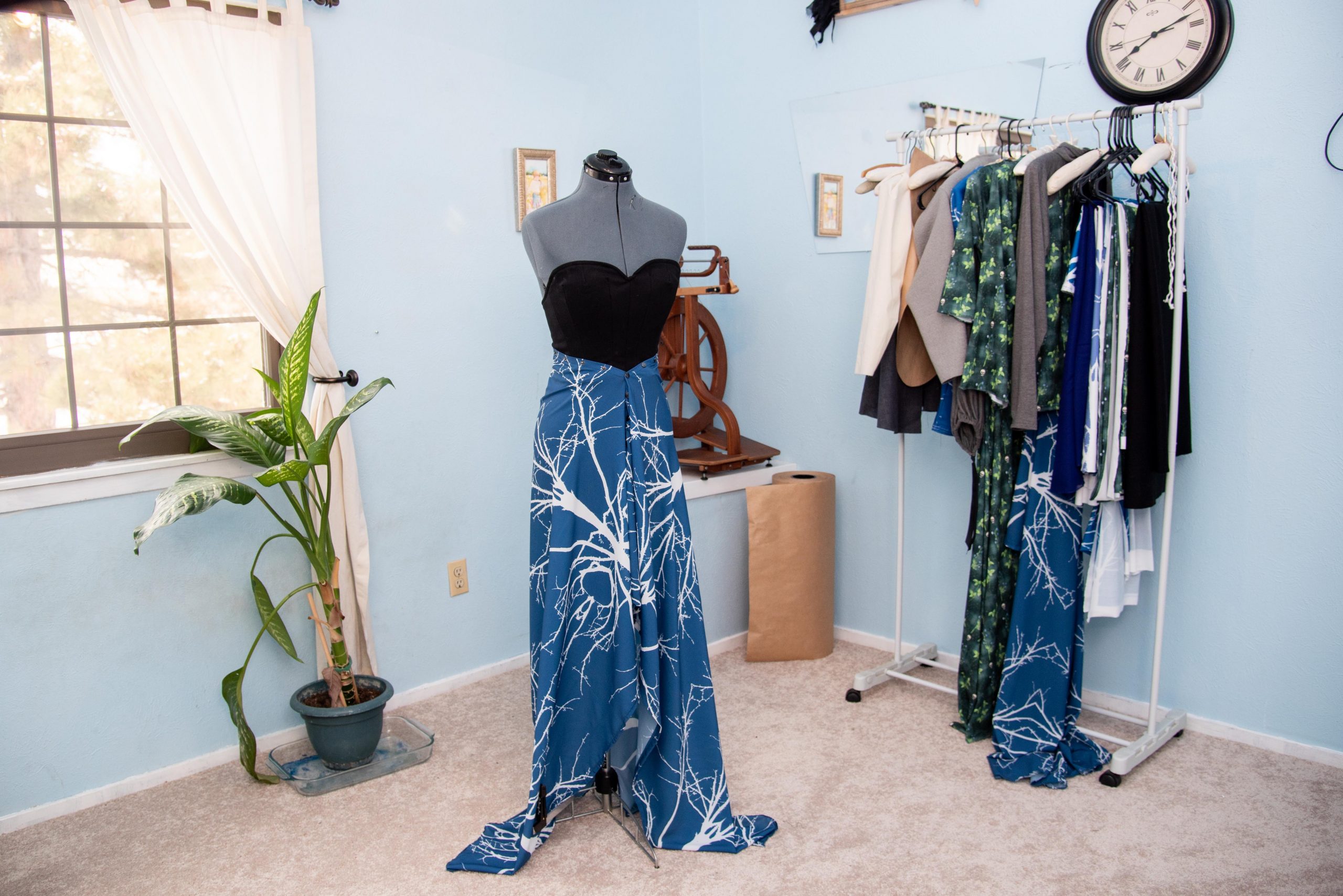 For many artists, the very first design offers a multitude of inspiration for future projects and works of art. In the interest of Collyn, one of his initial designs consisted of a recital gown. He described this piece as a “crowd-pleaser,” using fabric he designed by his own black and white photography. “I used a photo of backlit branches to create a striking print. The skirt used this branch fabric, and the top was a simple black bodice,” explained Collyn.