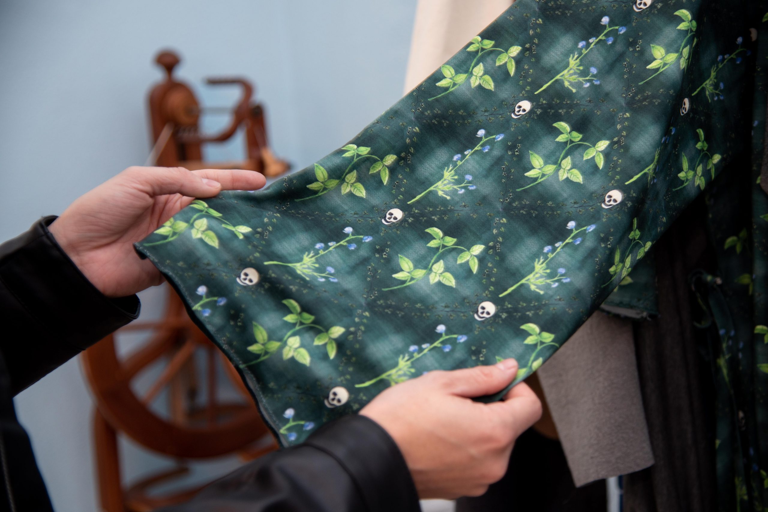 “First, I re-designed my branches print to create a wintry modern vibe, cleaning it up a bit and using the lovely classic blue as a backdrop. Inspiration from other print and silhouettes draws inspiration from the Victorian era. Moreover, the tailoring and idea of freedom versus restraint play a huge role in my collection,” explained Collyn. “I was also inspired by the Victorian hobby of creating Vivariums, or indoor greenhouses. This would bring exotic plants inside to stave off the cold and damp British winters. Furthermore, the two prints play off each other in a sort of counterpoint — the cold and bleak branches and warm inviting greenery. While the green is certainly bright and cheerful, I took another Victorian obsession, poison, and played around with it. Each plant represented in the print is poisonous. However, while potentially deadly, they are also very beautiful. In general, I love playing with these types of contrasts.”