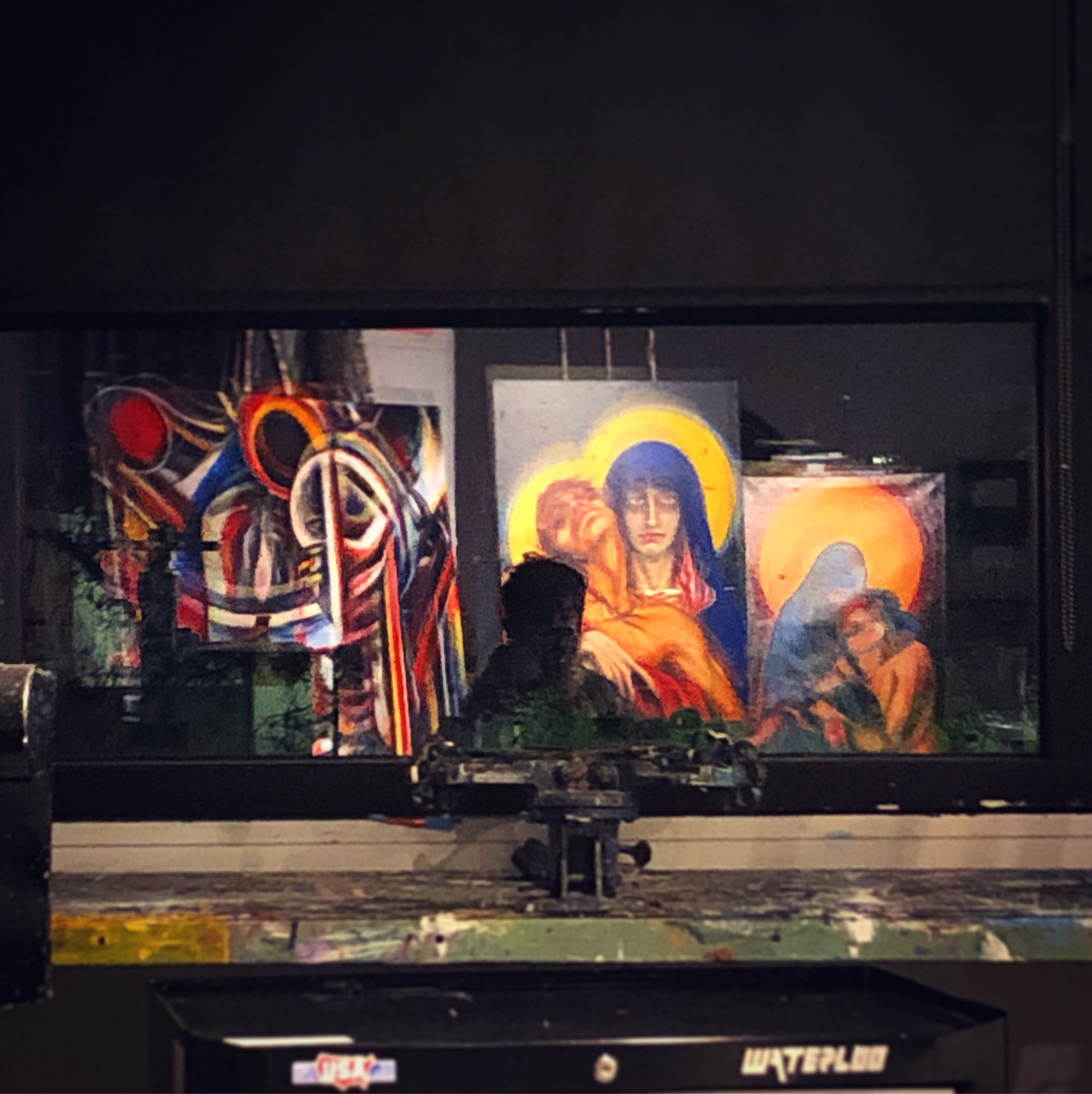 Two of these paintings represent violence in the Middle East and immigration issues. The third painting confronts the issues regarding women’s bodily autonomy. Furrer also created a ceramic piece for her thesis project which functions as a prayer candle holder. The holder itself features three prayer candles that show depictions of Mary and Jesus — while also incorporating a victim from the Hiroshima and Nagasaki bombings.