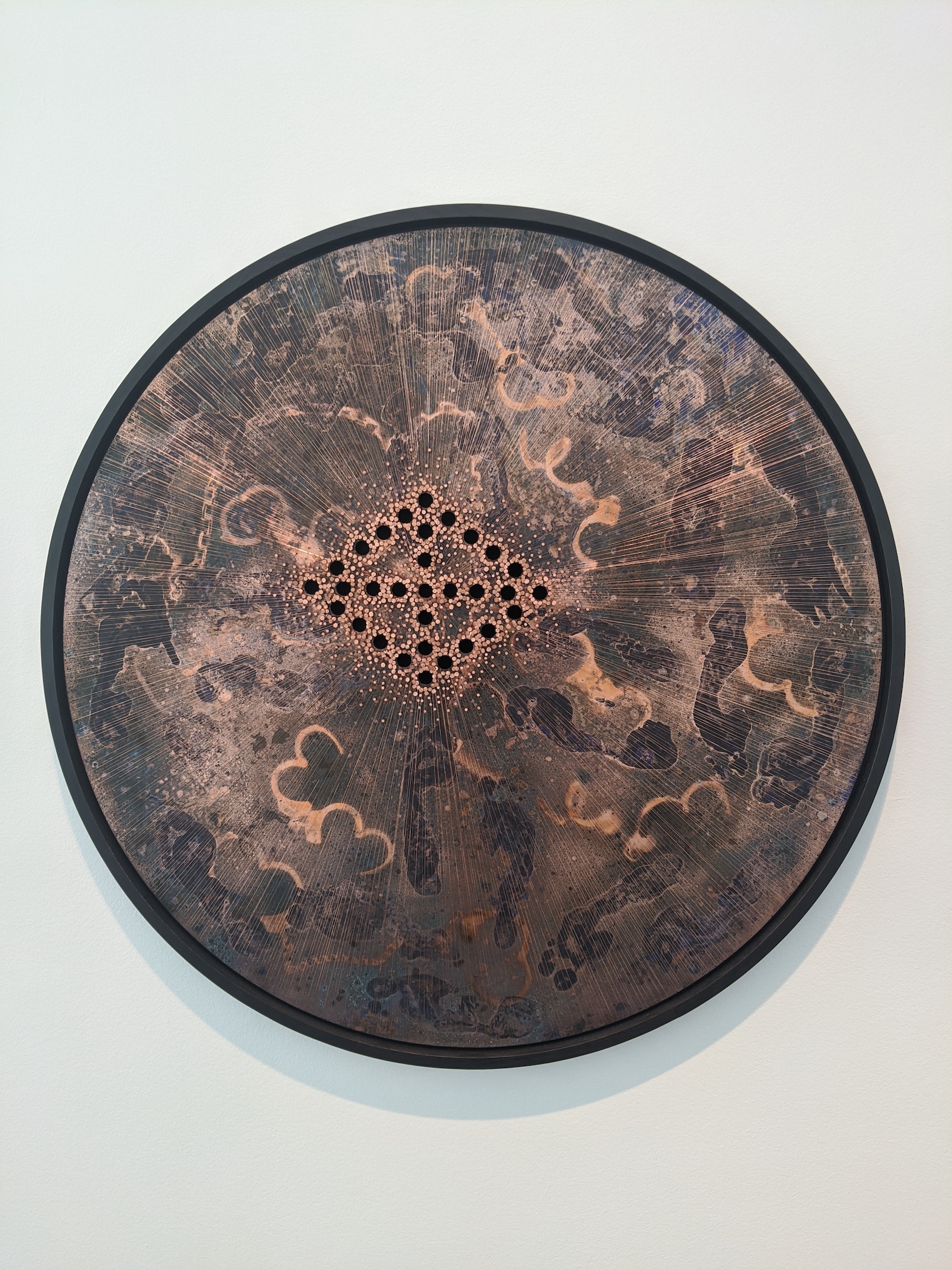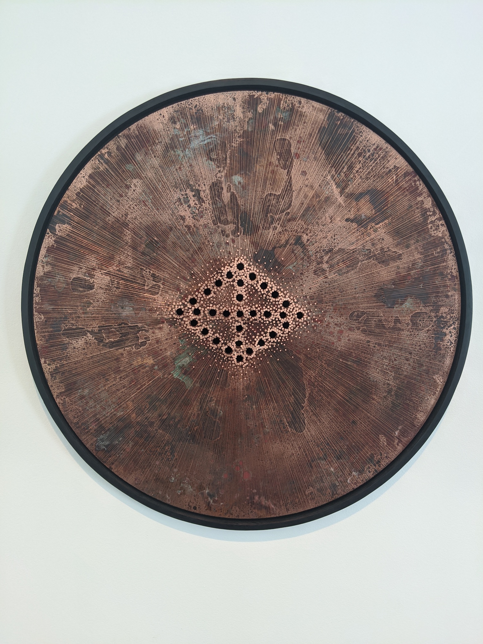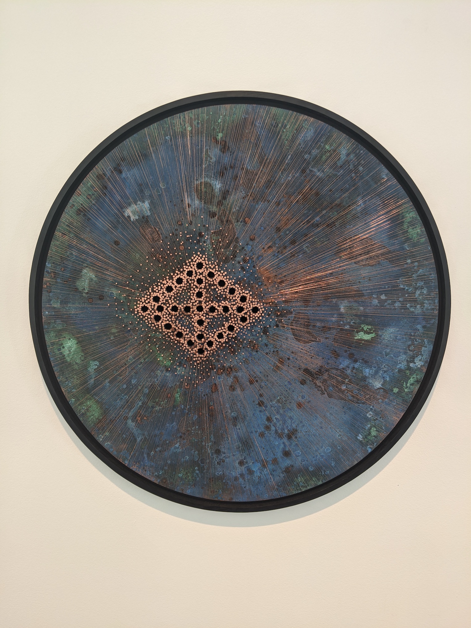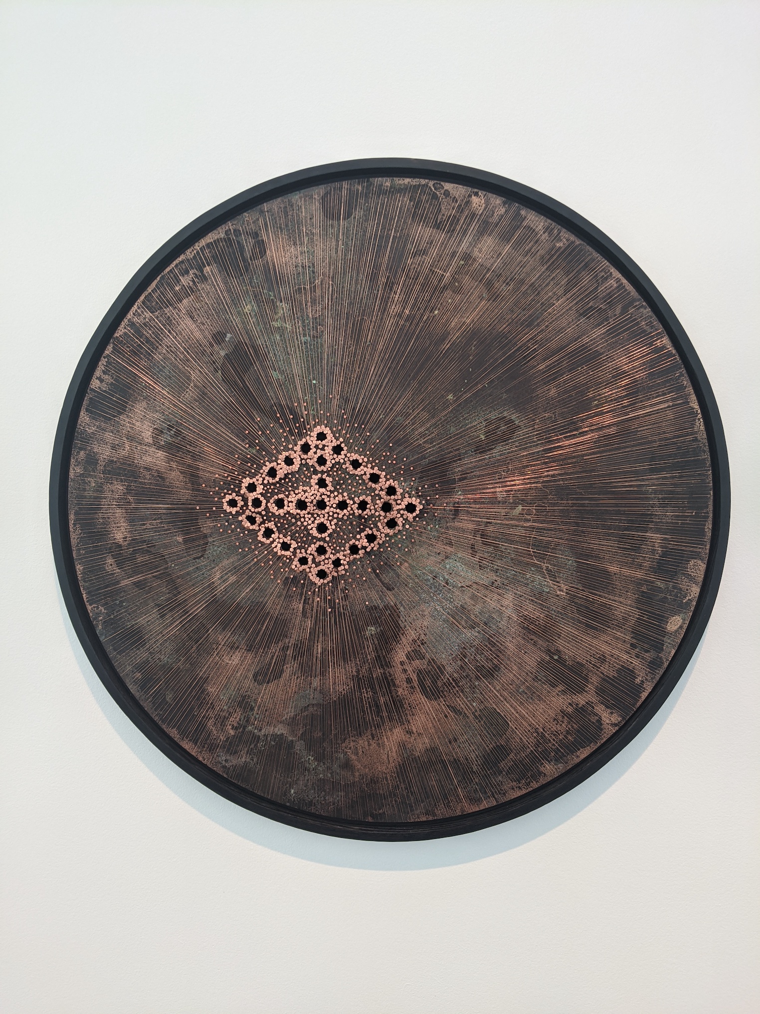 In Breathing Circles, the cosmograms are surrounded by copper nails and wire, emanating out from the point in the middle. Ward uses copper in this work and others to once again denote healing, as copper has medicinal properties and has been used for thousands of years in many cultures across the globe to heal a variety of ailments. Standing in front of each one of these circles and breathing deeply is a meditative practice that will bring you closer to the work, to the reason behind the cosmogram on the floor of churches. And, true to form, Breathing Circles has even more resonance now, in the age of wearing masks and dealing with a virus that disproportionately affects Black communities and other people of color in the US.