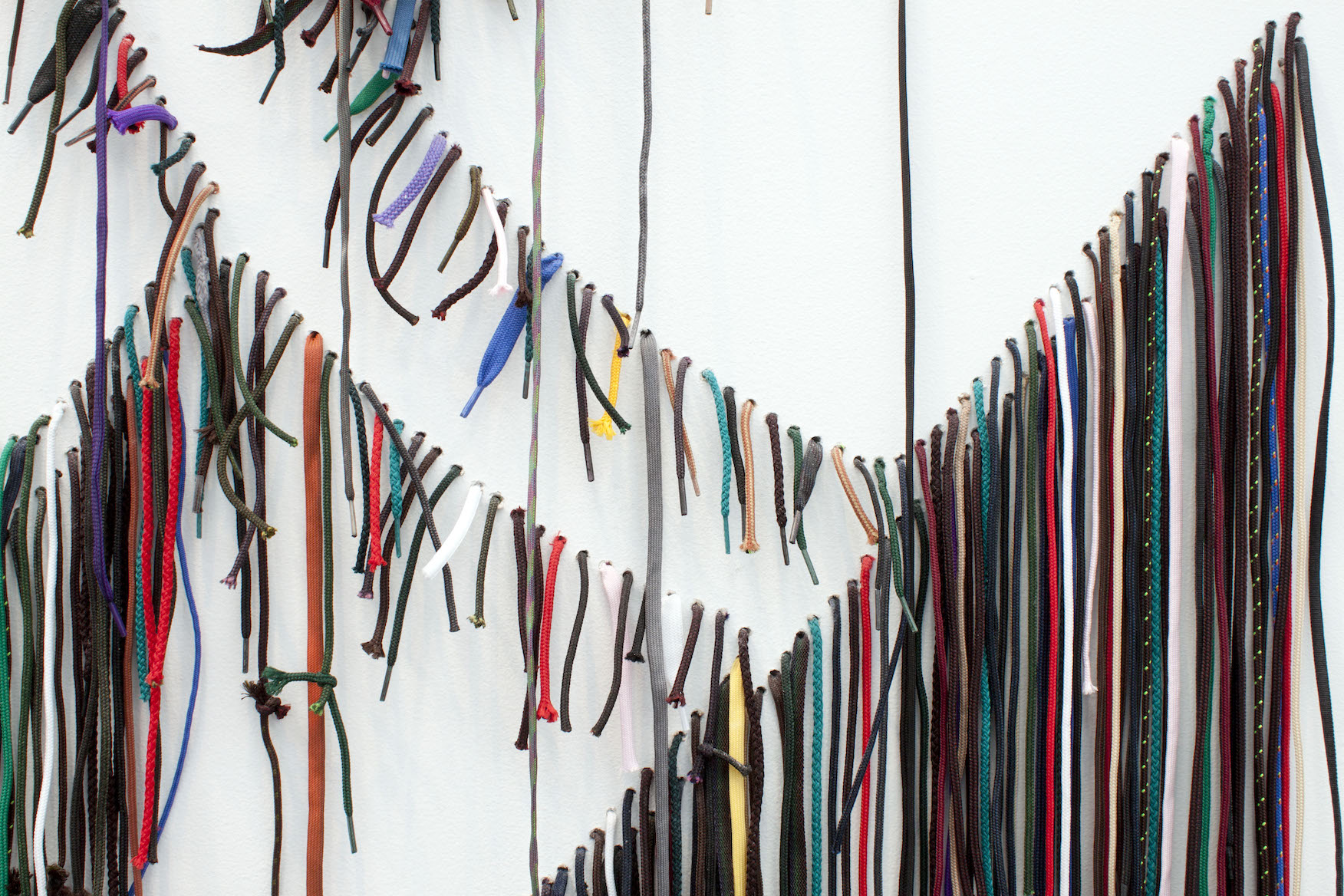 The title piece of the exhibition, We The People, is one of the most hopeful. In one stride it both criticizes the US constitution and redefines it. Using hundreds of unique shoelaces that are drilled directly into the wall of the gallery, the piece evokes the font and words of the foundational rights of our country. But we all know that those words weren’t meant for literally everyone when they were written. By using the wide variety of shoelaces, Ward places emphasis not on the fallacy of the phrase but on the individuality of the laces that make up the structure of the words. We The People allows each viewer to relate to a single shoelace, realizing that a society or country or community is only whole when each piece is represented equally.