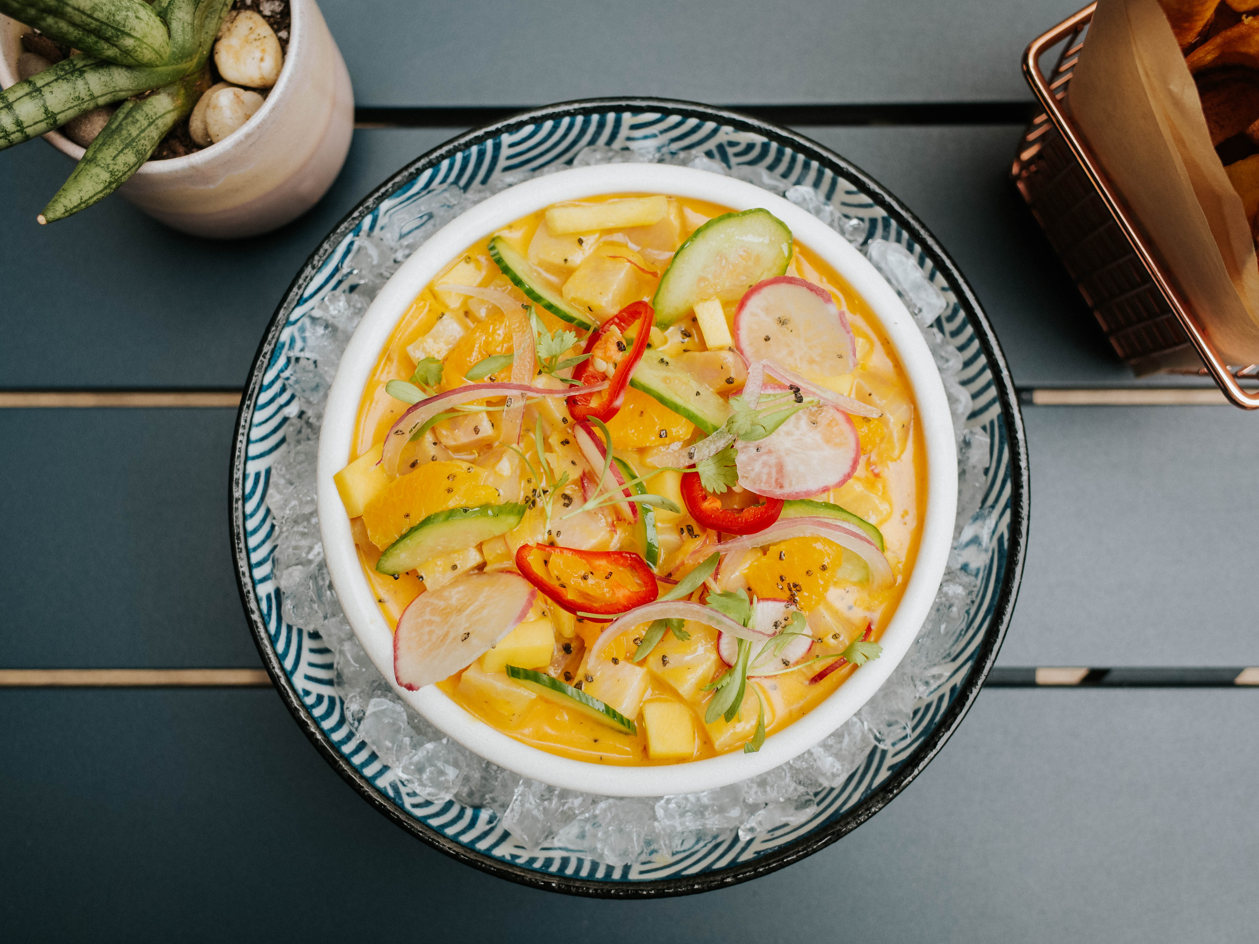 The 6,700 square foot space features a massive patio, a cozy lounge and a delightful open kitchen — which was intentionally designed to facilitate an ongoing series of cooking demos and classes. The decorations — including a massive bull mural by local artist Patrick Kane McGregor — are stylish, with plenty of cacti, antlers and leather furnishings giving the place an appropriate international chic. The speakers consistently play the kind of tunes that could easily be found in Tulum — globally-inspired house tracks compelling diners to feel hip. All seating has been intentionally arranged to promote distancing, though the presentation never feels forced. Even with limiting the number of guests to 50% capacity, the place is lively. Waitstaff all wear makes fitted with the Toro logo and tend to customers with effortless, white tablecloth sophistication.