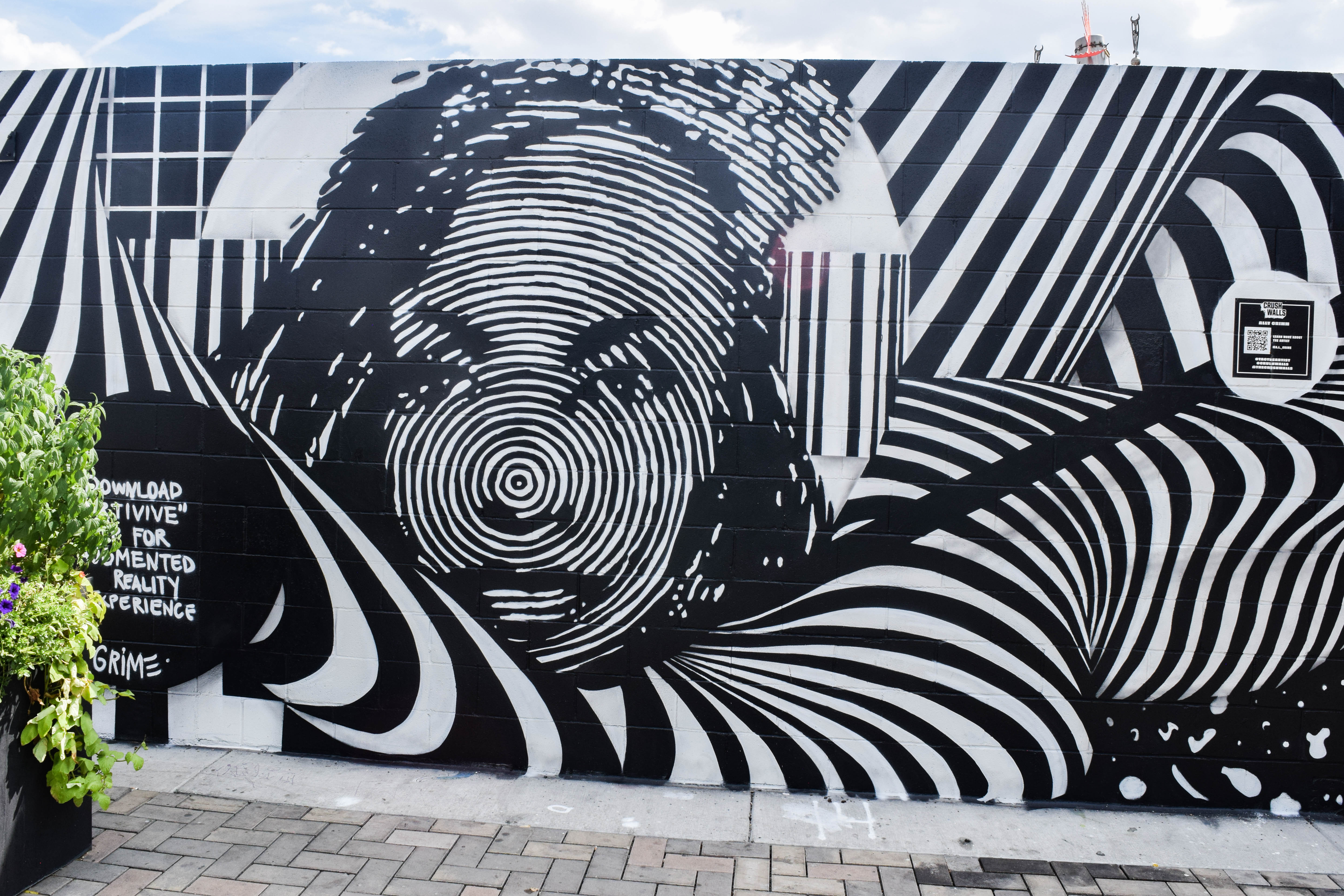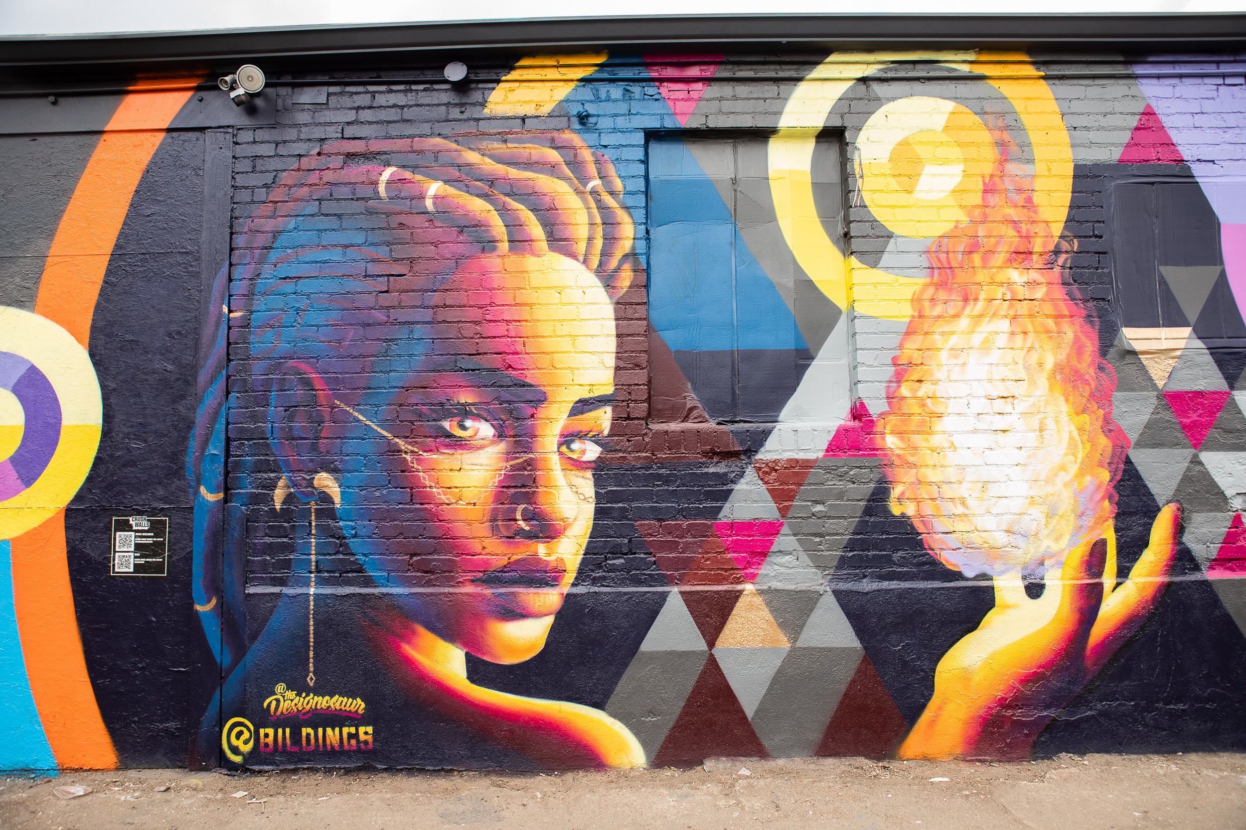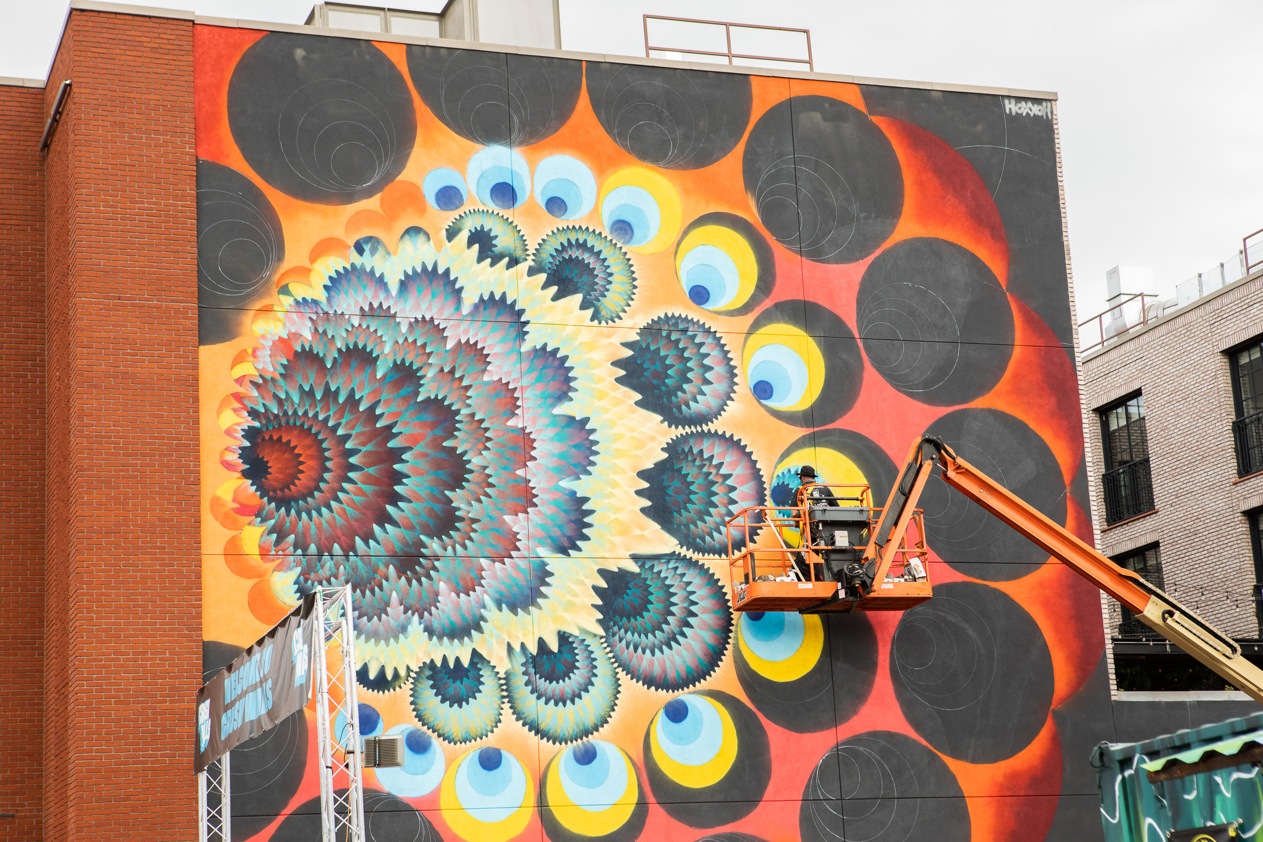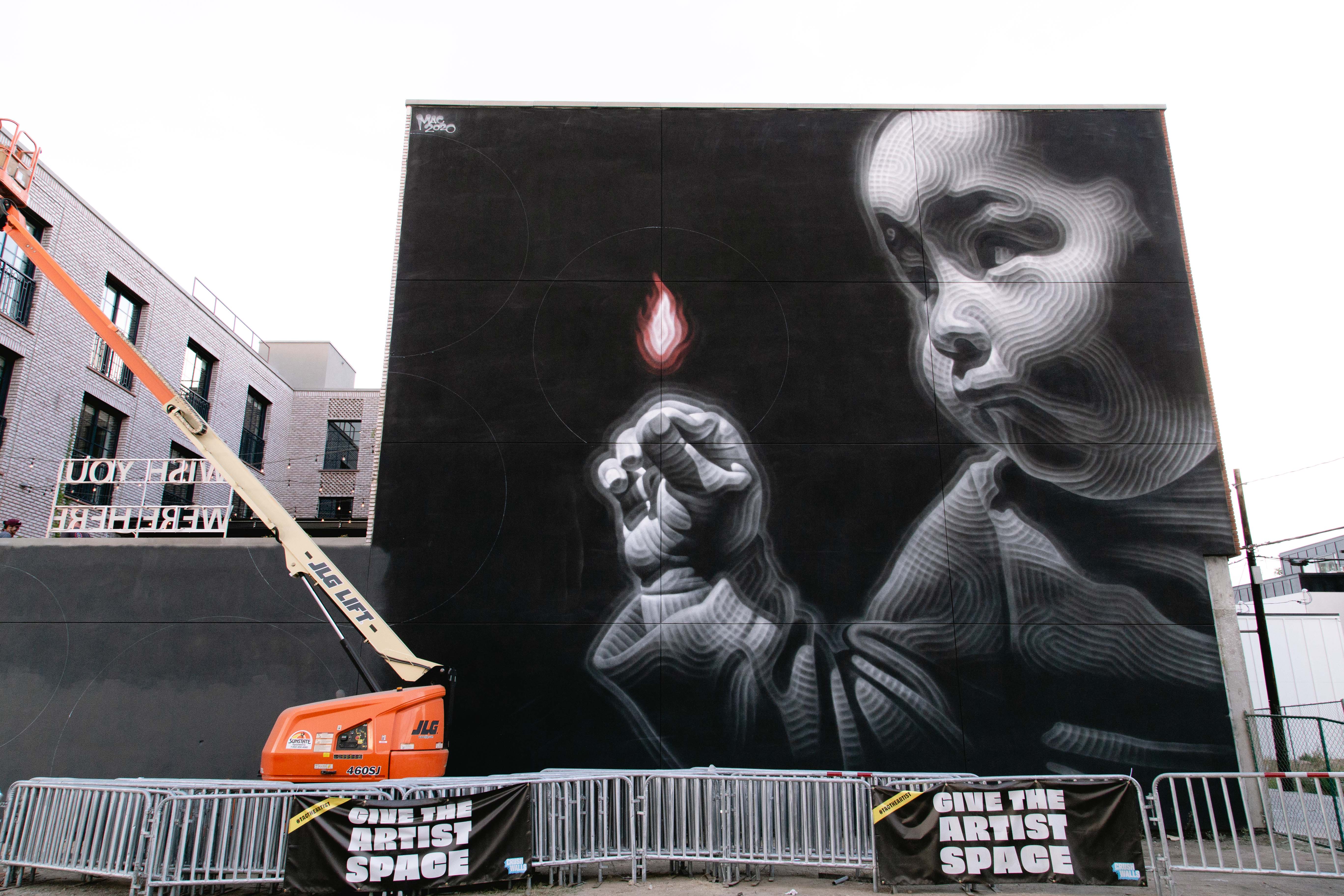 The Lowdown: This collaboration is one for the books. It might be the only wall featured at CRUSH this year painted by two artists who have both been featured by the Smithsonian. Jodie Herrera is a celebrated artist whose portraiture reflects the soul of the subject, as she often takes time to interview the people she paints. Miles Toland likes to work in the realm between dreaming and waking, using patterns and mandalas to impart a spiritual resonance. Together, Toland and Herrera’s style compliment each other to such a degree that an untrained eye might think it was only one artist.