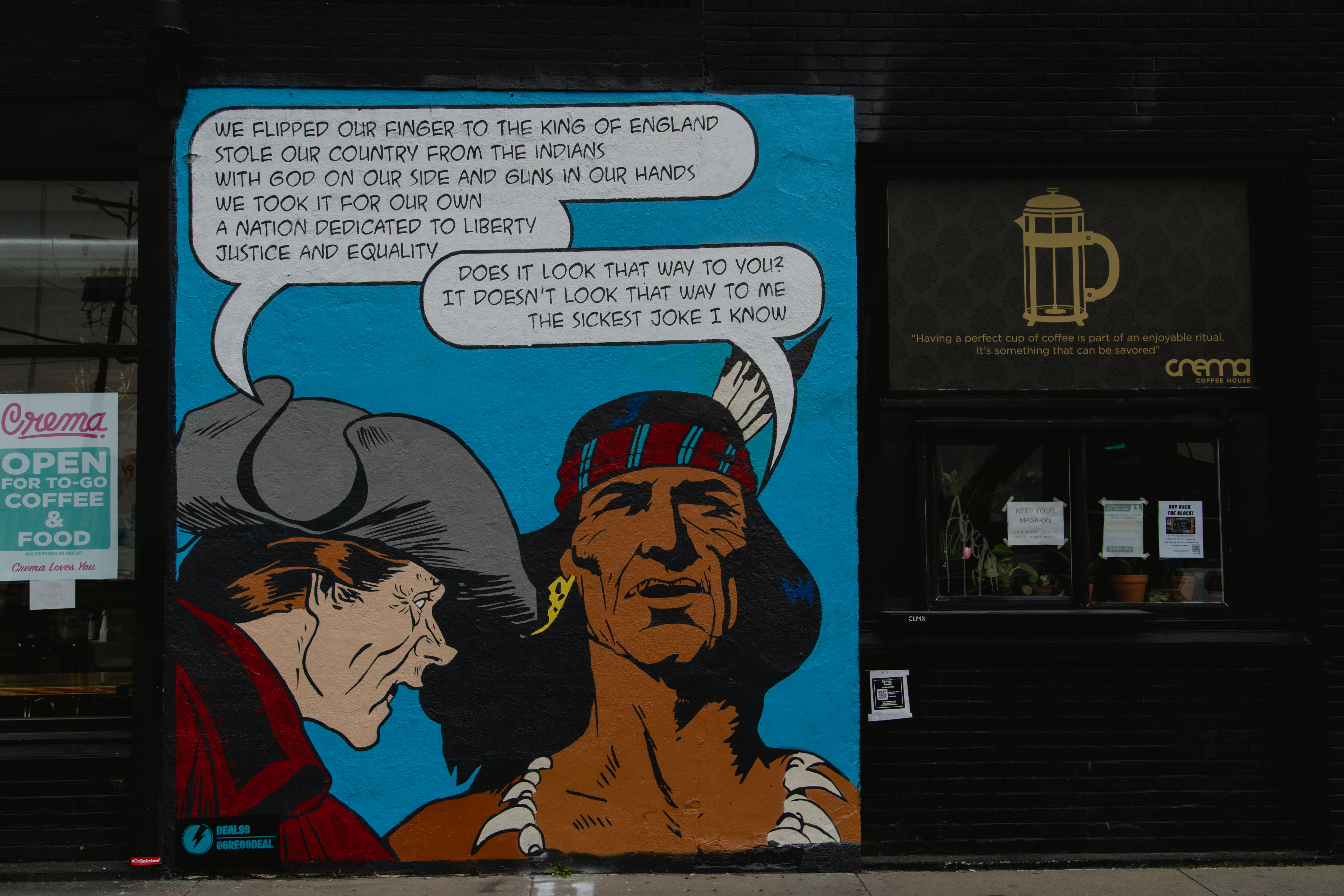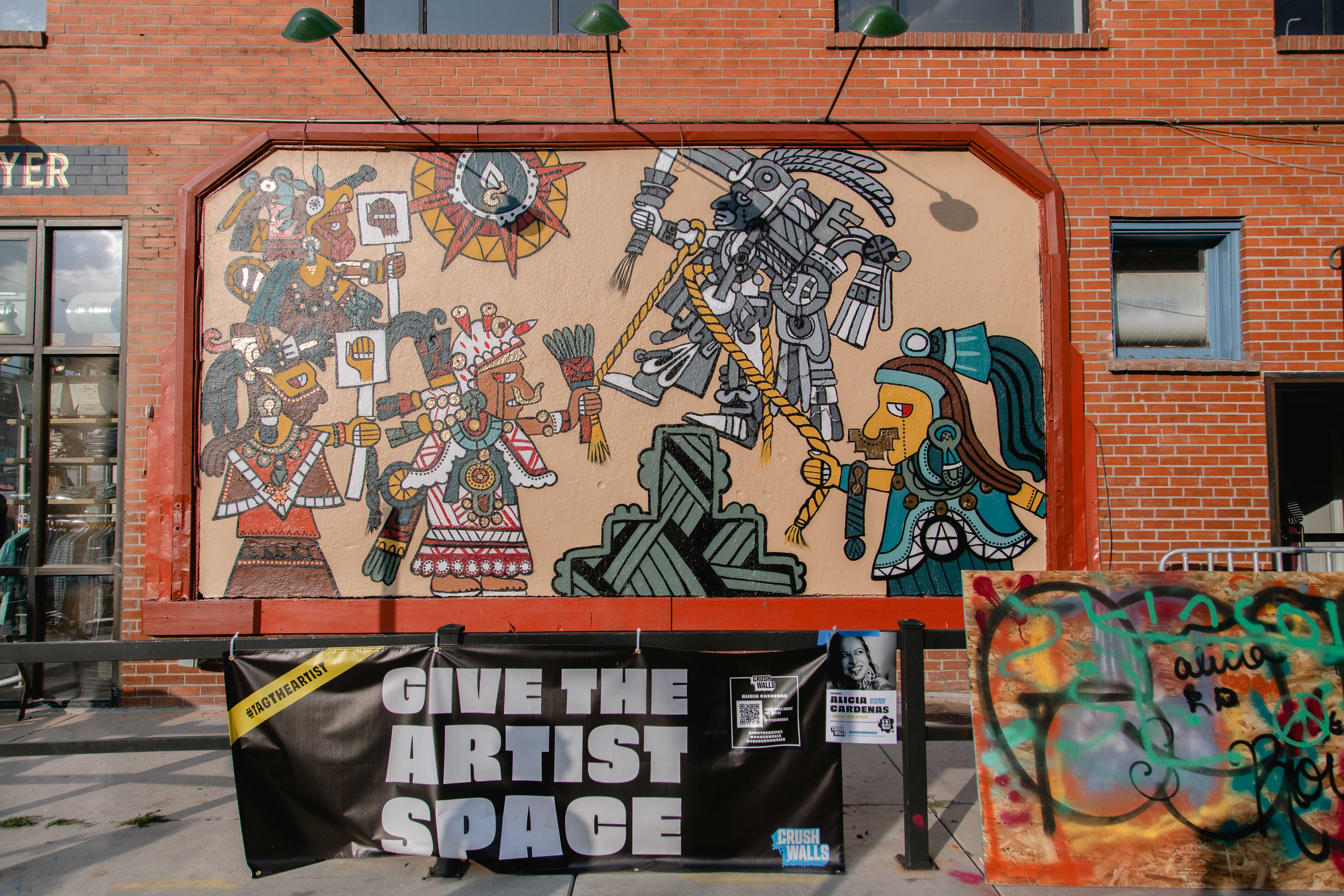 Gregg Deal painted for his second consecutive year, producing a similar statement as last year regarding Indigenous lands. Painted like a square of a comic strip, Deal’s murals in the last two years have forced viewers to stop and consider the message in an easily digestible way.