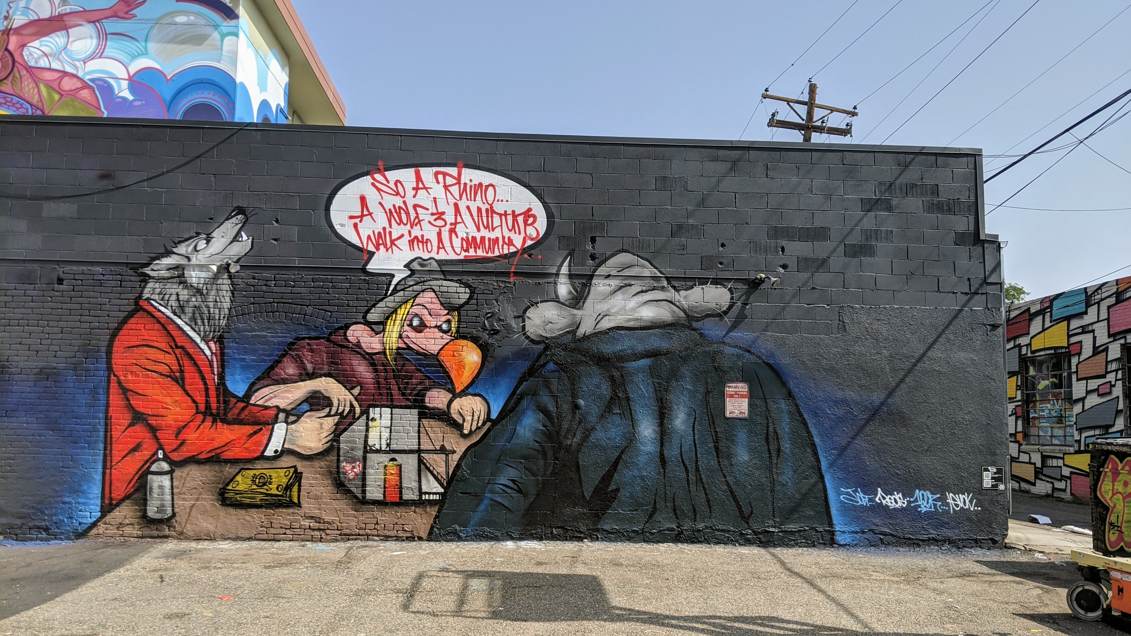 Jolt and Reds attacked the RiNo Art District, similar to last year, but also included the developer Ken Wolf and a third person characterized by a vulture in this depiction. In the caption, they wrote, “so a rhino, a wolf & a vulture walk into a community…” with the insinuation that they are planning a devious plot.