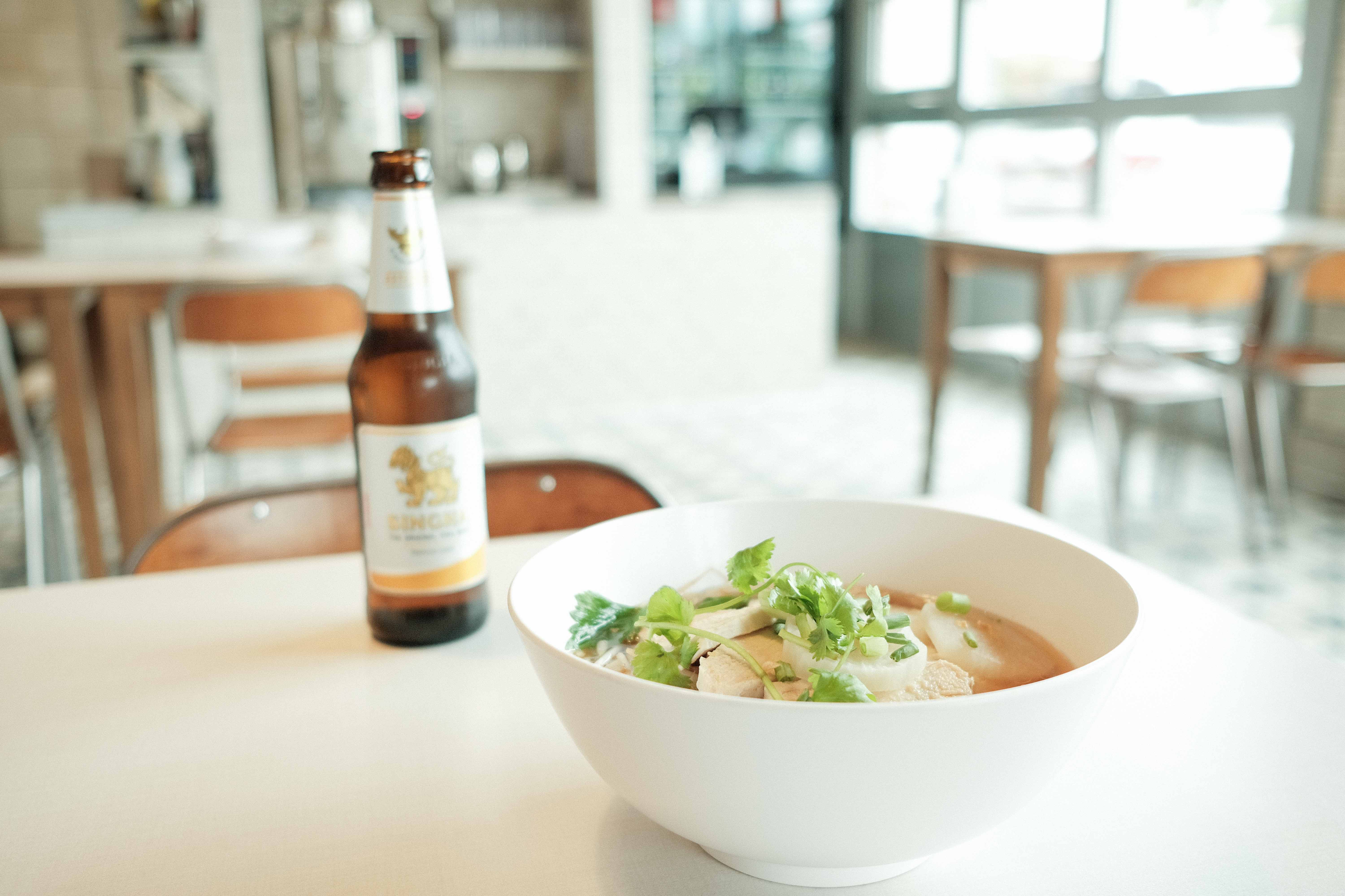 The Thai boneless fried chicken ($8) comes with a choice of either light or dark meat, the perfectly-crisped bird being joined by a red curry mayo, which makes divine use of the omnipresent house-made curry paste. The Pad Thai ($11) — one of four items that were recycled from the original menu — is a heaping portion of stir-fried rice noodles topped with chopped peanuts, green onions, sprouts and a choice of protein. The Thai Chicken Noodle Soup ($12) sees the same noodles covered in cabbage, thick-cut radish and sprouts, then doused in one of the more comforting broths made anywhere outside of grandma’s kitchen. The Kaw Mun Kai ($12) is a neatly-organized plate of steamed chicken, a pile of aromatic ginger rice, a house-made spicy garlic ginger sauce, cucumbers and a small bowl of chicken broth. While the dish is inevitably delicious, Dedrick suggests that eating it in the traditional sequence is where it is most superb. Using both a fork and a knife, place the chicken on a pillow of rice and cover the bite in the sauce to taste. Using the spoon, devour the bite, then take a sip of broth, perhaps follow with a nibble of cucumber and repeat. Simply mixing all the ingredients together, while it may be convenient, would be considered a faux pas at many Thai tables.