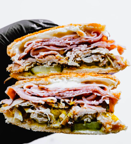 The sandwiches include El Cubano ($11) is classic slow-roasted pork, sliced ham, melted Swiss cheese on a Cuban roll, the Turkey Media Noche ($10) is a turkey, sliced ham, melted Swiss cheese on a sweet potato roll and the Pan Con Lechon ($13) is slow-roasted pork, pickled onions, melted Swiss cheese, garlic cilantro crema on a Cuban roll.