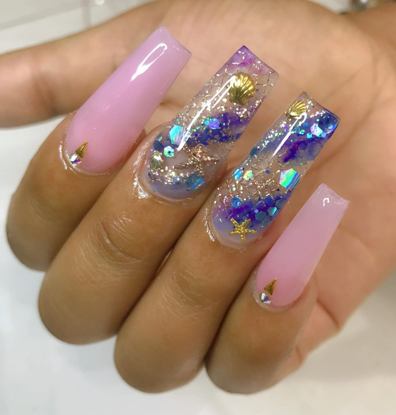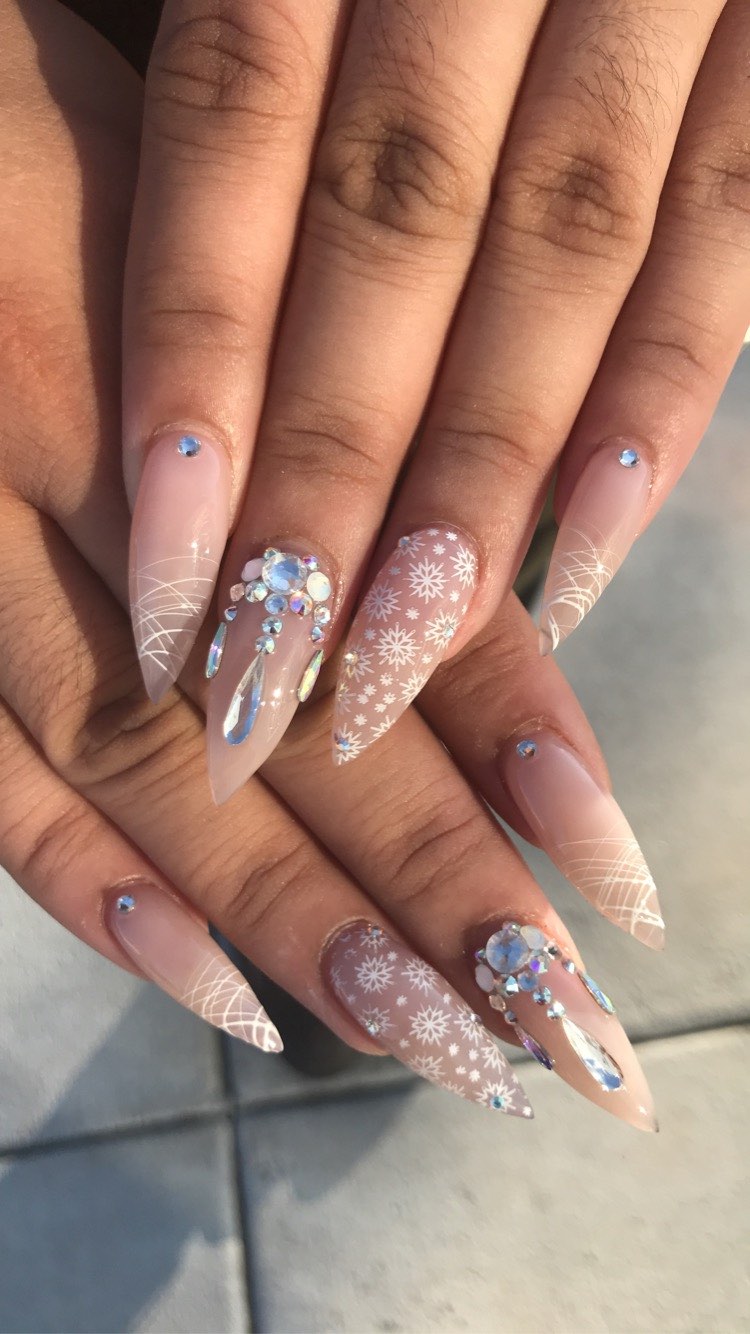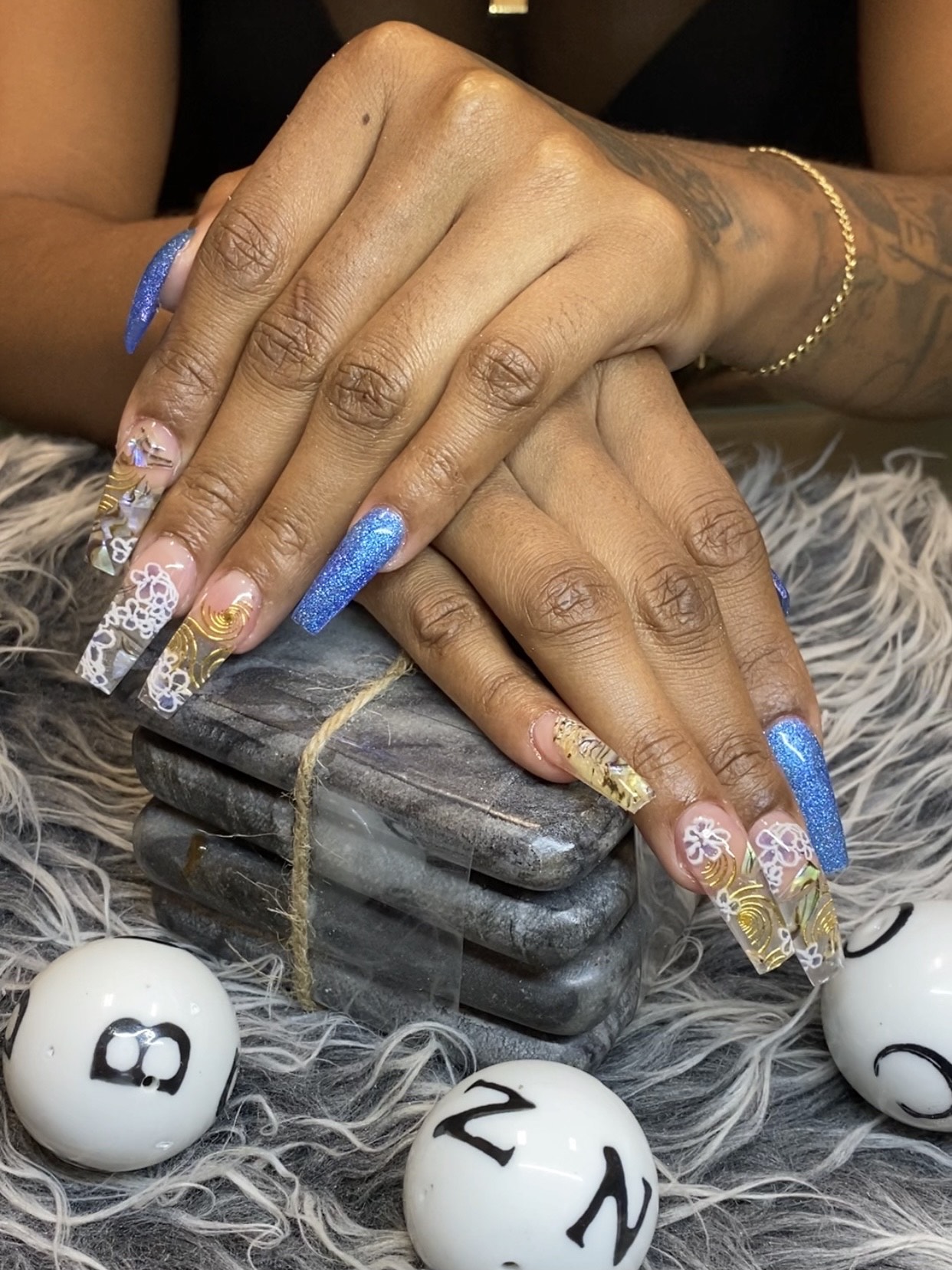 BJ: I personally love to customize all of my sets for my clients. I find that having a short conversation and really getting to the heart of what my client wants to achieve allows me to be the absolute most creative within the space they give me. Pigmented acrylic, glow in the dark, glitter blends with chrome crazy rhinestones and foil designs are always a plus. I like to push the limit if I can.