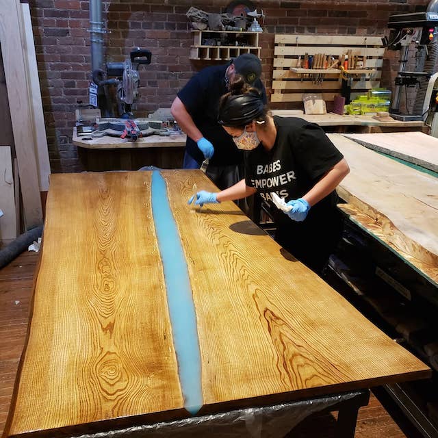 The time and cost to build a wooden masterpiece at the workshop are dependent upon the project you choose to make. To make a table for example – often requires 6 to 12 hours of dedicated time in the shop – which equates to three to six visits. Part of the process includes trimming, gluing and clamping, sanding and applying an epoxy resin also known as a wood filler. The final touch is designing, building and applying a base and legs.