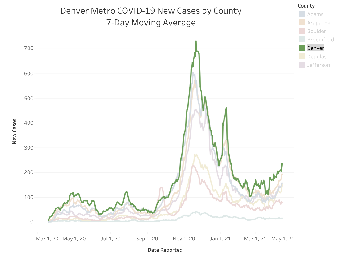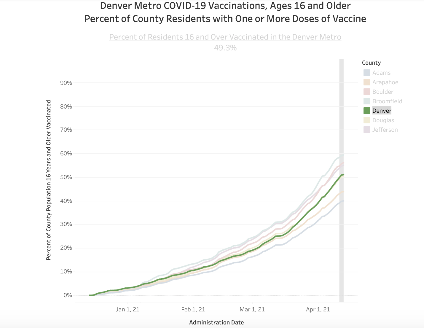 Back in February, Colorado updated its COVID-19 Dial to make it easier for counties to transition into new levels, for better or worse. Dubbed Dial 2.0, it shifted metrics for each level and updated the observed data period from 14 days to seven days. However, Denver doesn’t currently qualify for this new Blue level according to its recent metrics. Instead, the city is able to adopt these new measures on Friday due to the dial becoming advisory instead of mandatory. In order to qualify for Blue, the city needs to have no more than 100 cases per 100,000 people over a seven-day average and see a declining or stabilizing hospitalization rate. We currently sit at 236 cases and both cases and hospitalizations are trending upwards. However, the data shows that over half of all people living in Denver have received at least one dose of the vaccine.