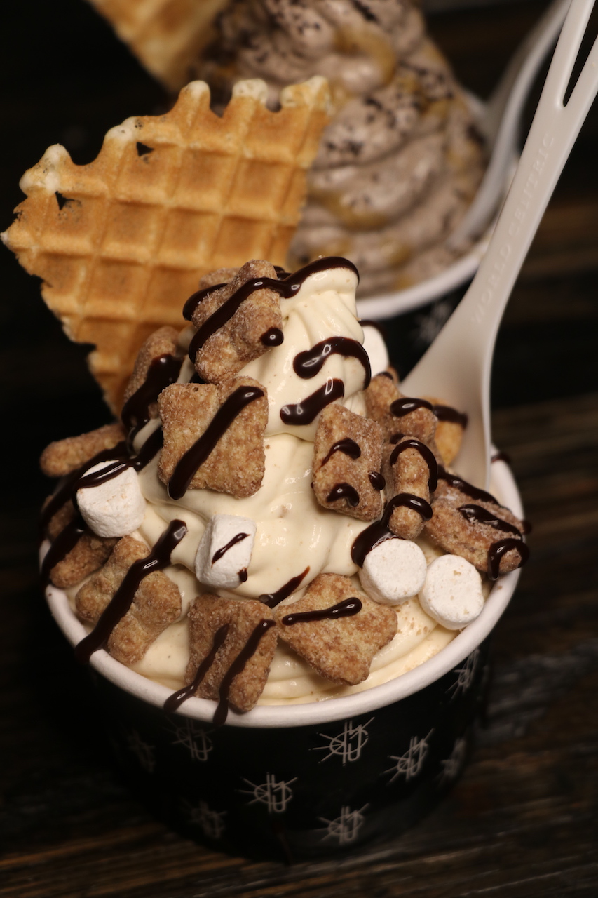 Their mix-ins include sugary cereals — it creates a frozen version of the beloved taste of cereal that was left to soak in milk at the bottom of the bowl. Frosted Flakes, Cocoa Puffs, Honey Bunches of Oats, Reece’s Puffs and the rainbow of Lucky Charms Marshmallows can be found in dispensers on the back wall. Oreo cookies are commonly crushed into ice cream — but instead of large chunks — Hidden Gems’ swirl has a grey speckled color representing all the bits that made it inside. New York, Los Angeles and Miami are no strangers to this way of buzzing up ice cream with childhood snacks, except for possibly Hidden Gems’ Cheez-It option.